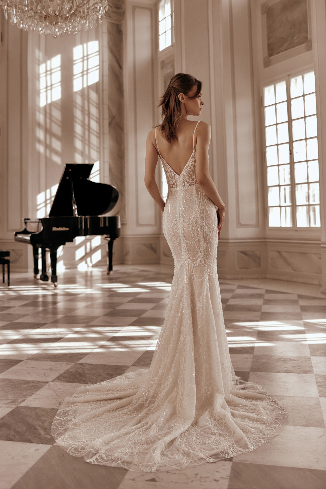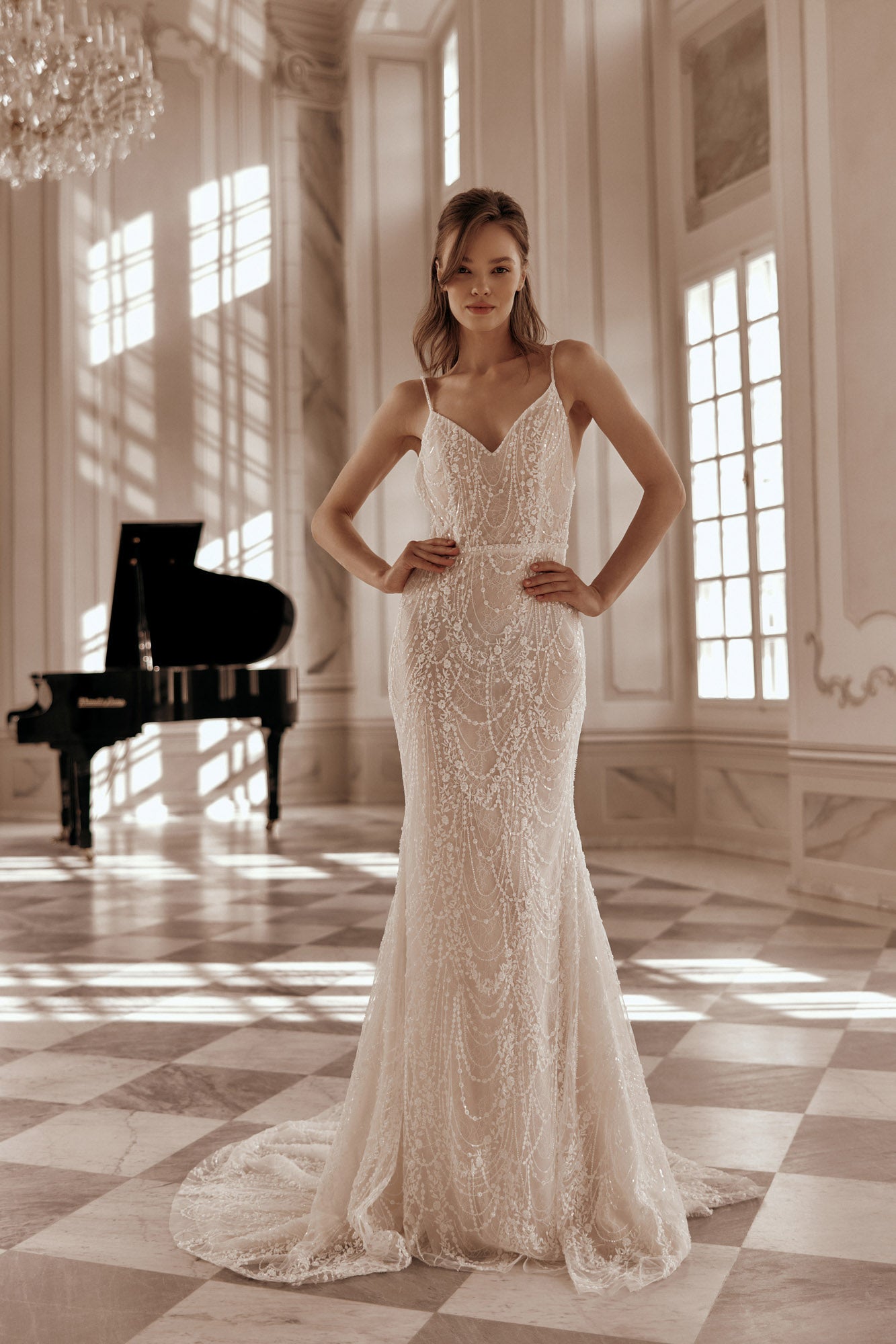 Style 2549 er en palietdekoreret havfrue brudekjole, med lette spaghettistropper og en fin delikat blonde under alle perledetaljerne
