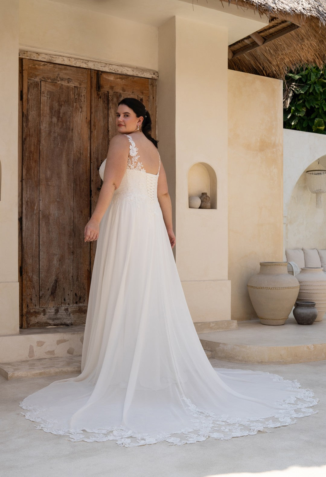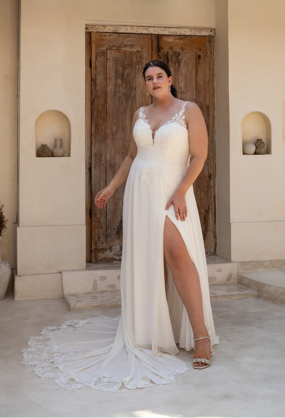Style 30150 har en dyb V-udskæring og delikate blondeapplikationer på overdelen. Den lette chiffon nederdel har en høj slids, der tilføjer et moderne og sofistikeret touch.