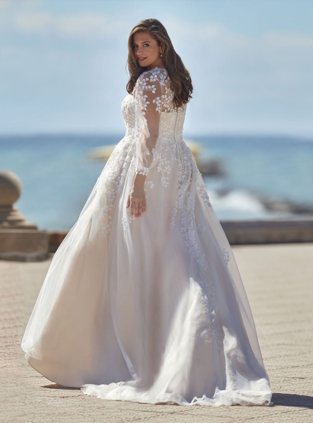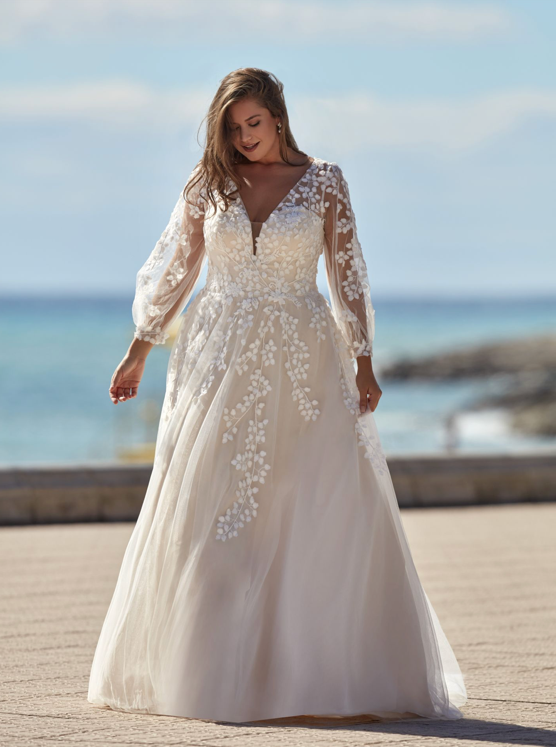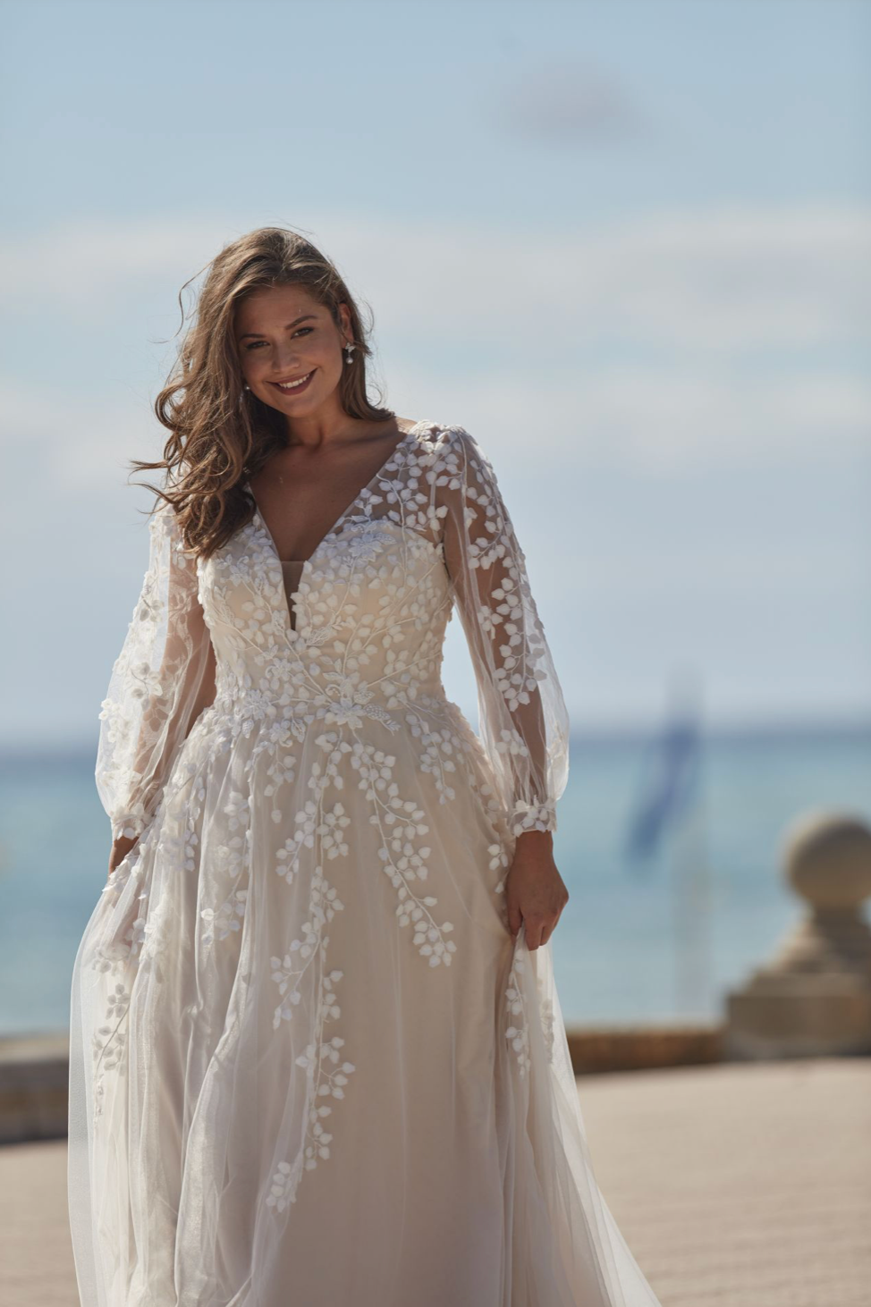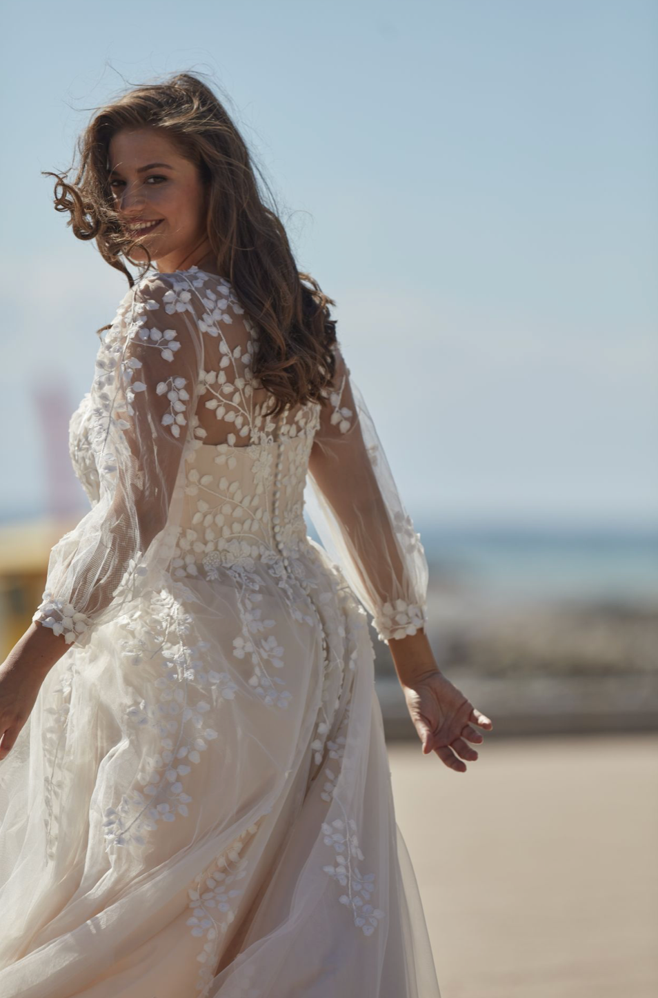 Denne smukke brudekjole er perfekt til den romantiske og feminine brud. Den er designet med en flatterende A-formet silhuet og har lange, gennemsigtige ærmer i tyl, smukt dekoreret med blomsterbroderier. Kjolen har en dyb V-udskæring og en markeret talje, som fremhæver figuren på elegant vis. De tredimensionelle blomsterapplikationer fortsætter ned over skørtet og skaber et let og luftigt udtryk.