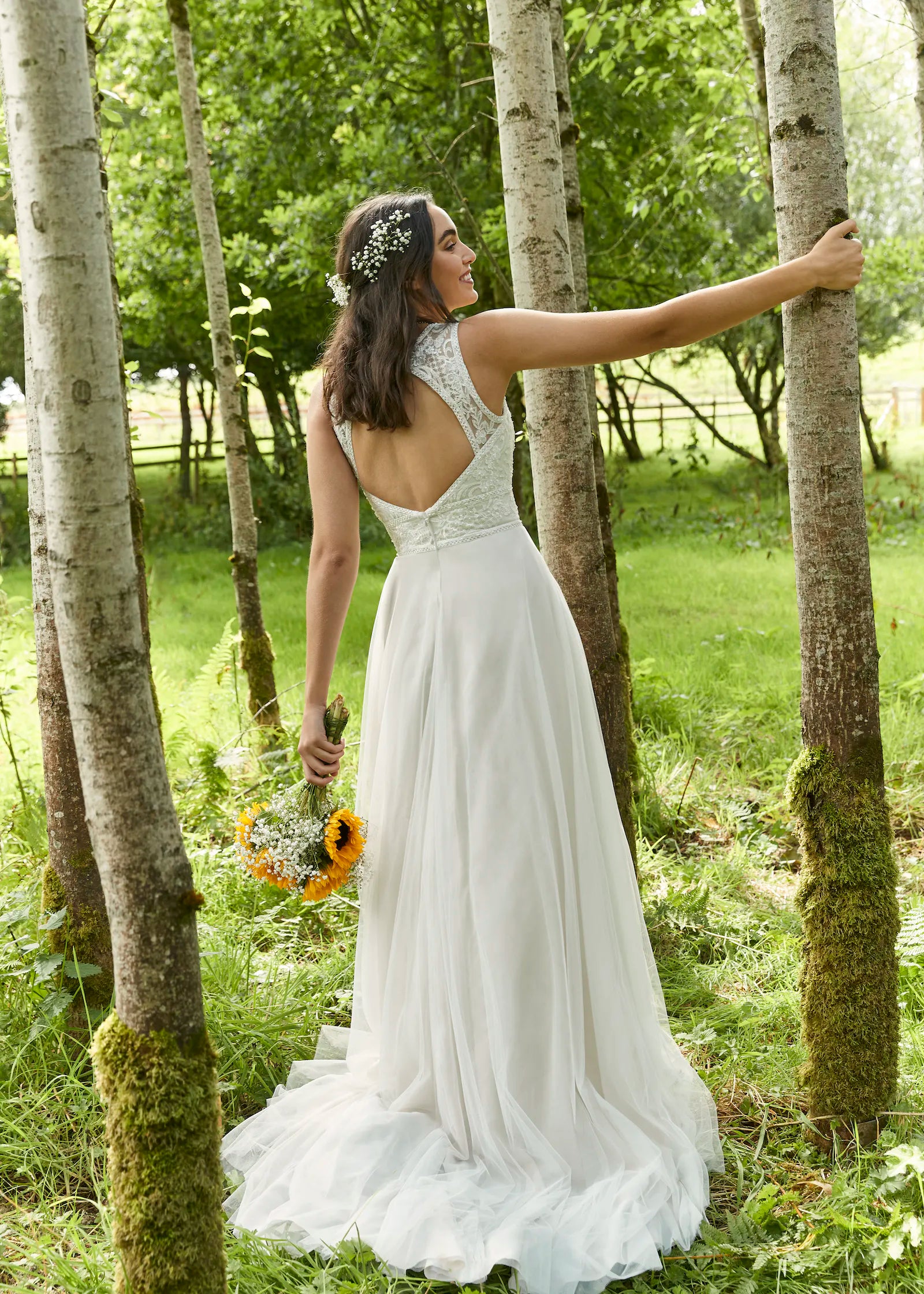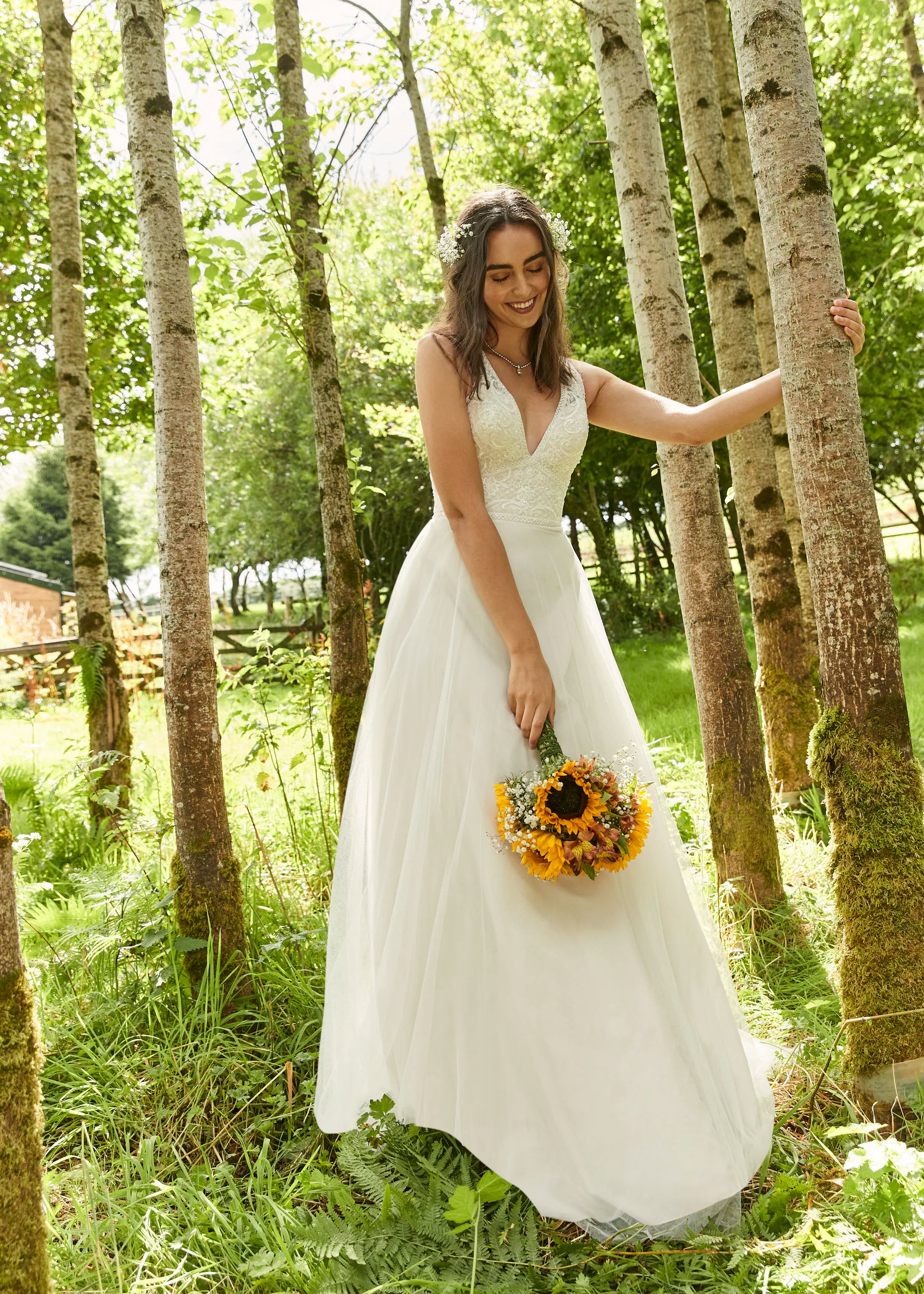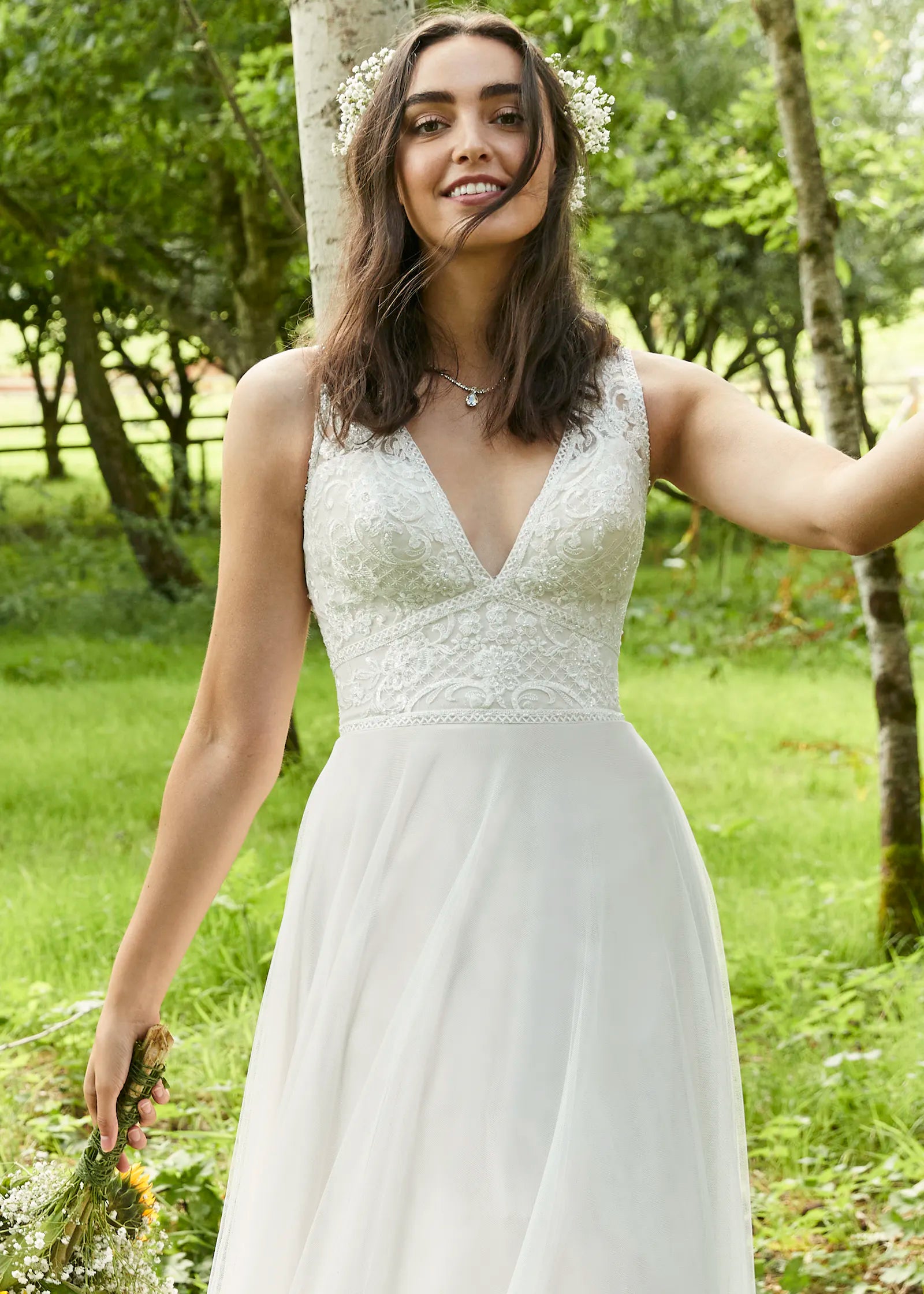 Smuk tyl kjole med dyb v-udskæring og empiresnit. Kjolen har et nude underskørt med 2 lag tyl udover.