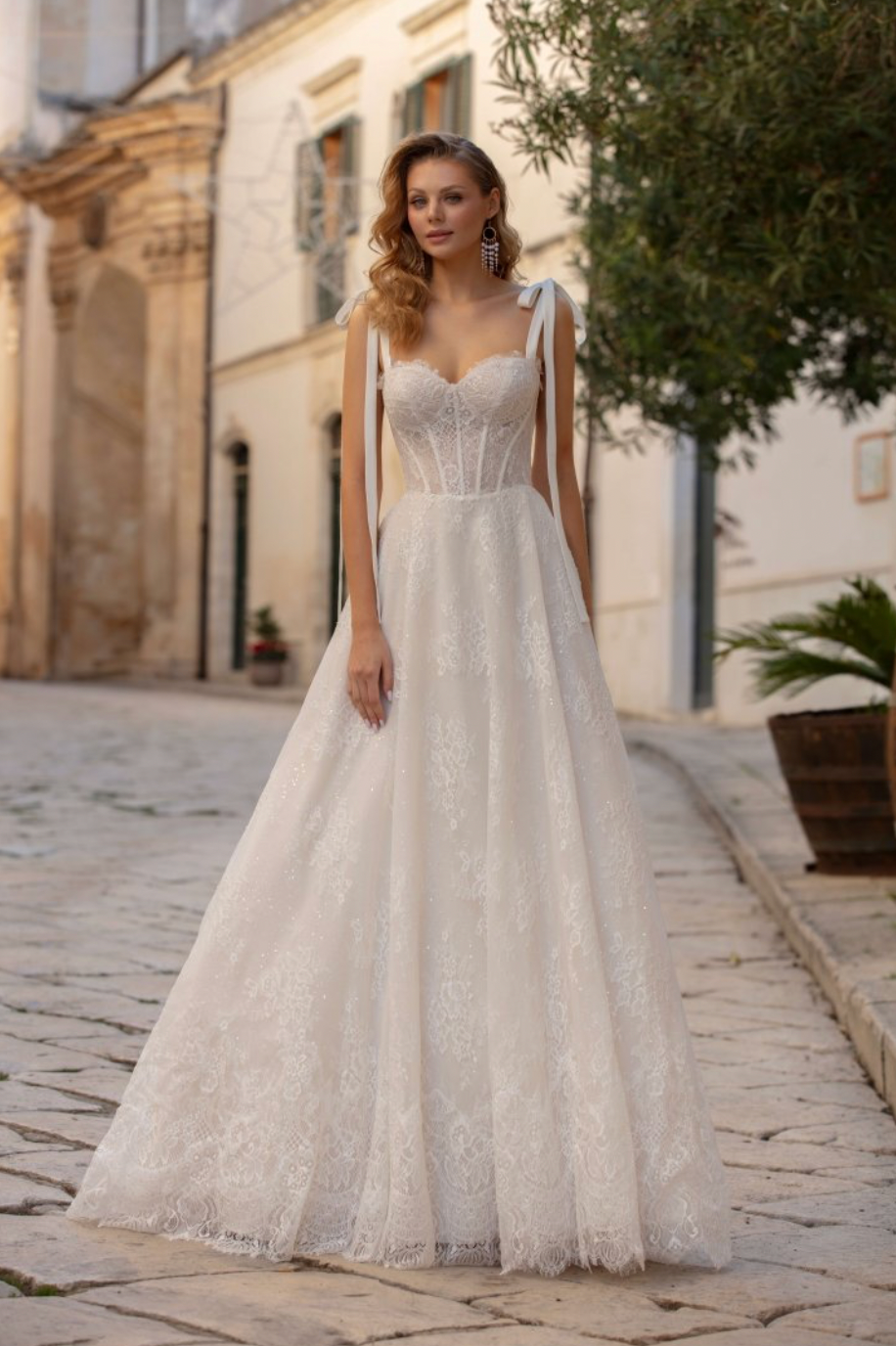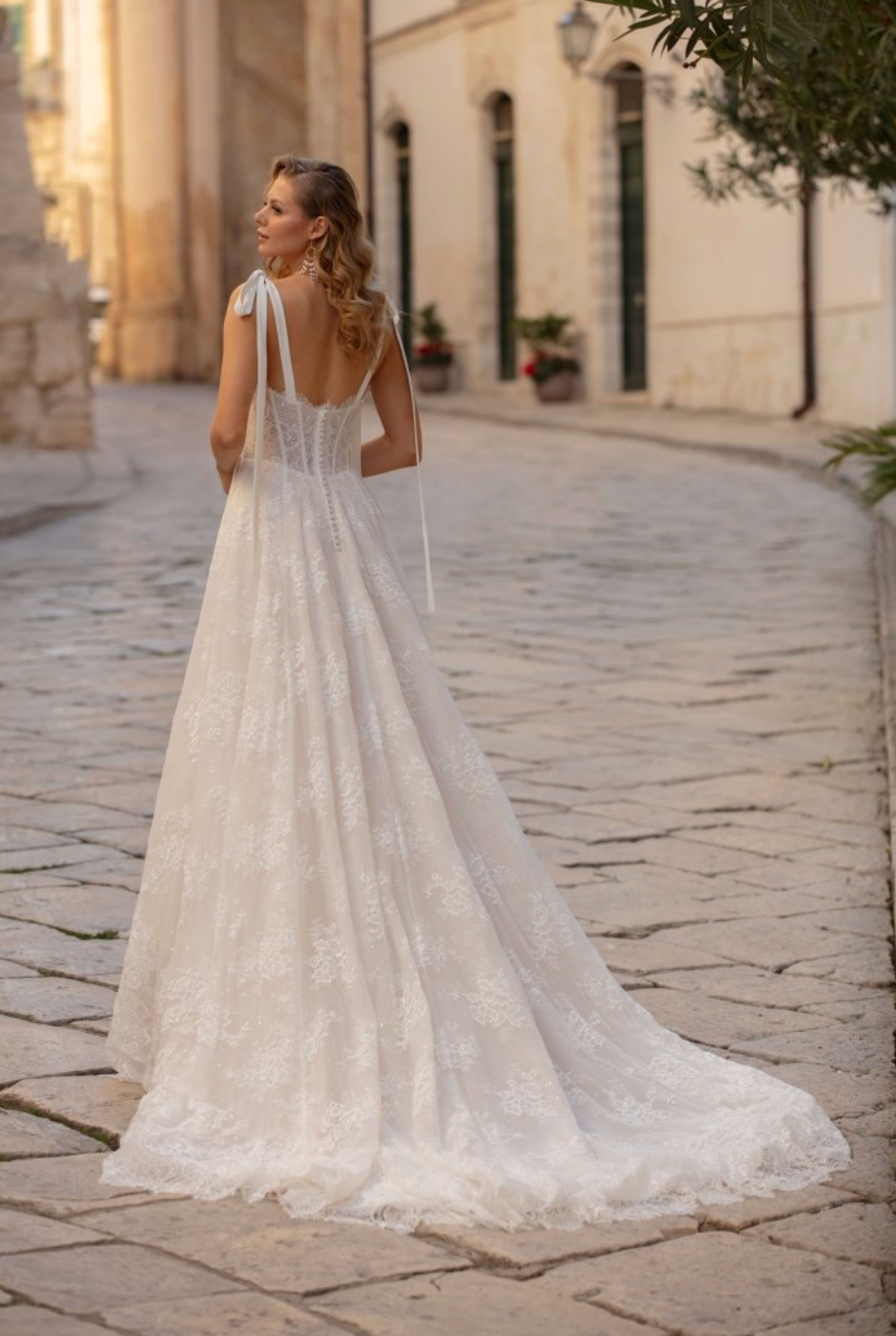 Denne romantiske brudekjole har en elegant A-line silhuet og er dækket af delikat blonde med et let glitrende finish. Den har en flatterende korsetlignende overdel og smalle stropper, der bindes som sløjfer på skuldrene.