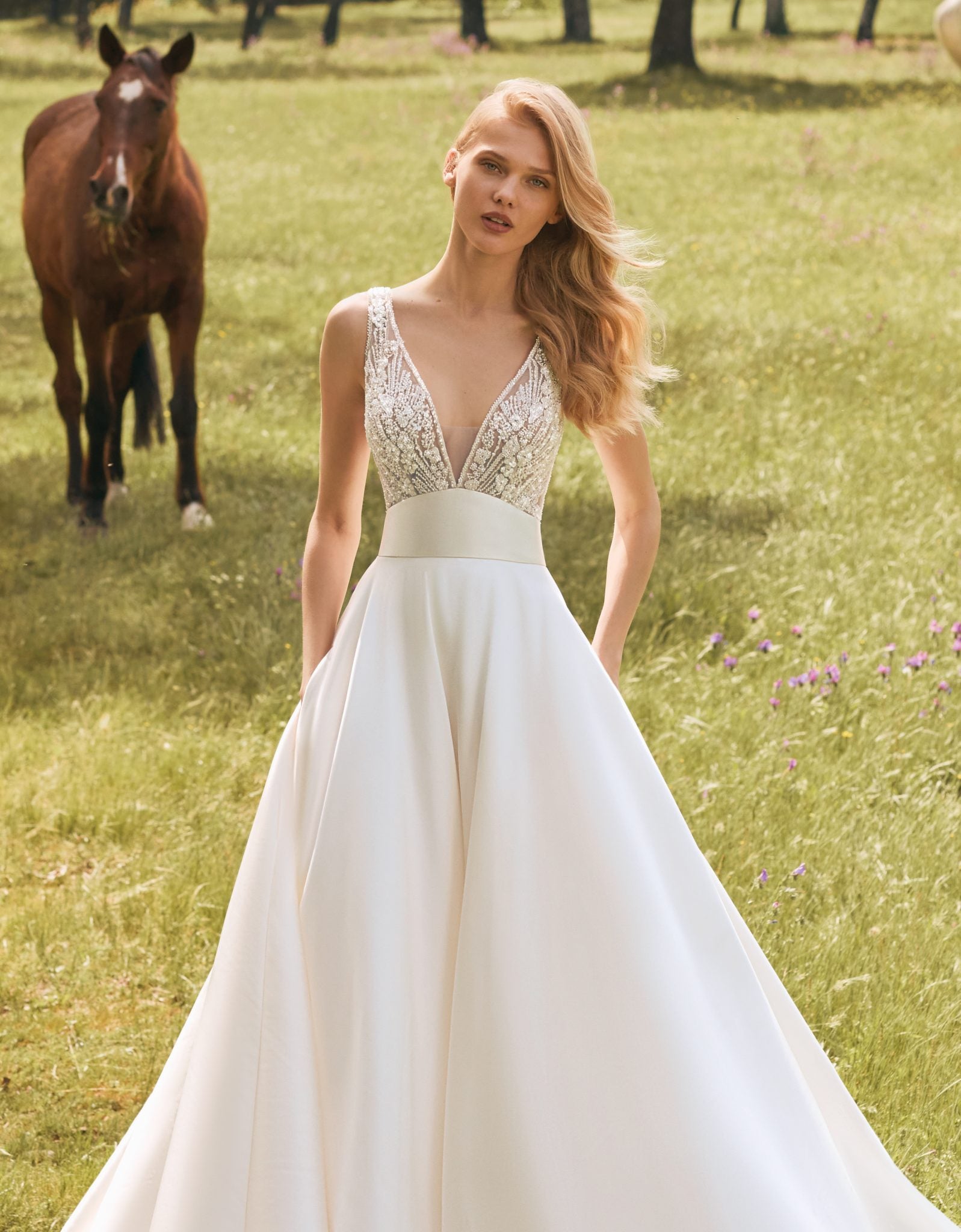 En elegant og moderne brudekjole med glitrende blondeoverdel og dyb V-udskæring. Den brede satinbælte markerer taljen og fremhæver silhuetten, mens det klassiske snit i glat stof falder smukt med et langt slæb.