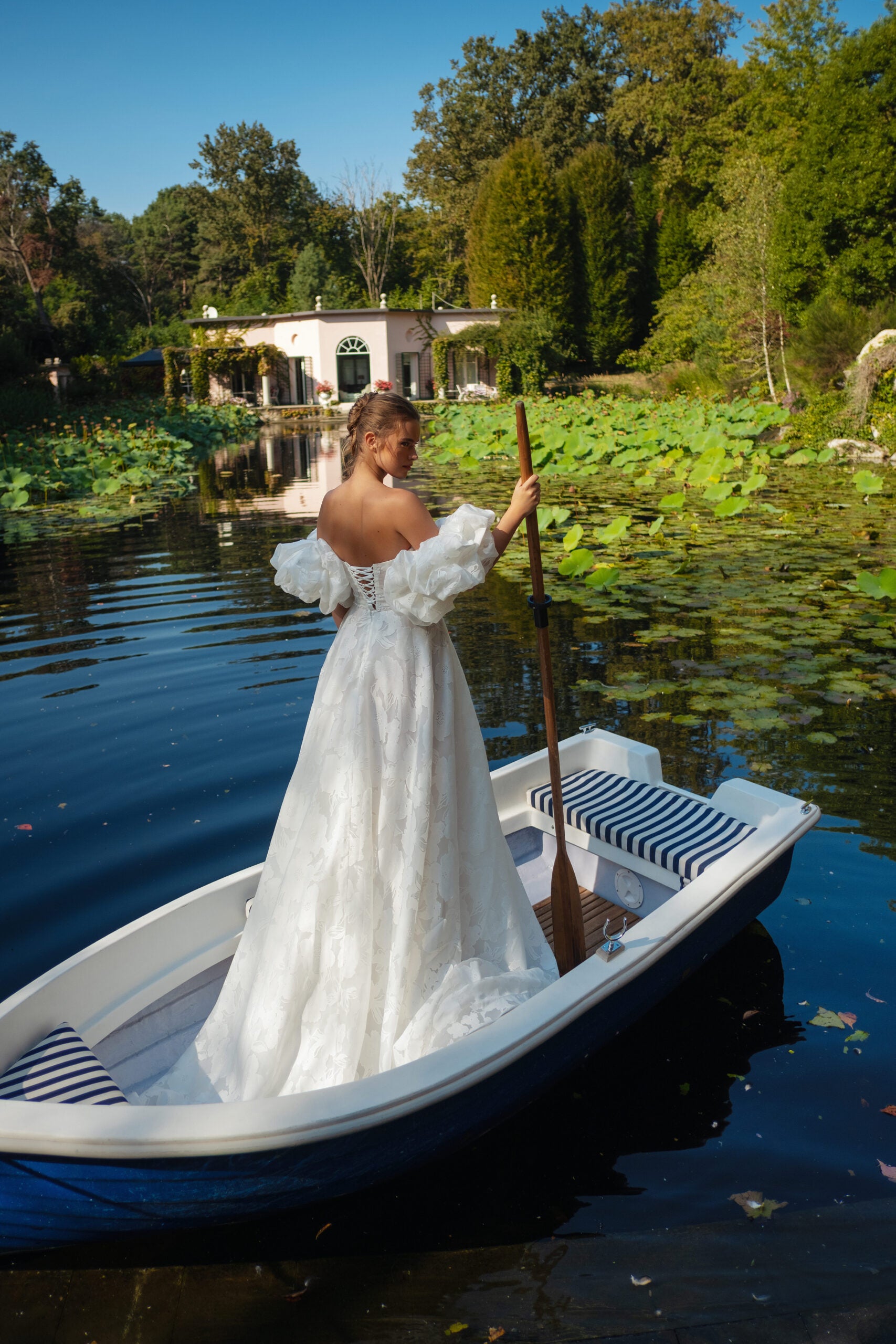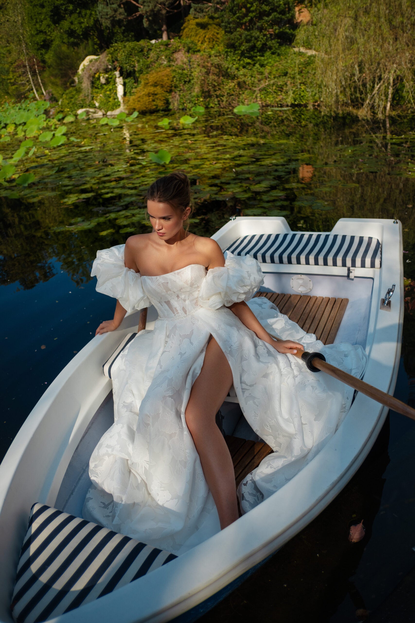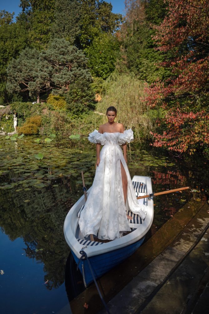 Kjolen har en smuk off-shoulder udskæring, der elegant fremhæver skuldrene. De voluminøse ærmer tilføjer et element af eventyrlig charme, mens den høje slids i skørtet giver et dristigt og moderne touch. Kjolens luksuriøse stof med blomstermønster skaber en drømmeagtig effekt.
