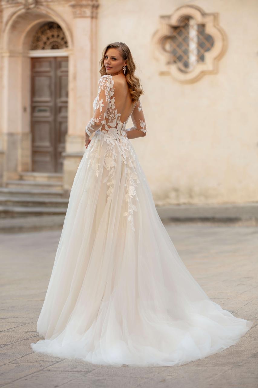 Romantisk og elegant brudekjole med lange, transparente ærmer og dyb ryg. Overdelen er dekoreret med blomsterblonder, der smelter ned i et blødt tylskørt med langt slæb – perfekt til et klassisk og sofistikeret bryllup.