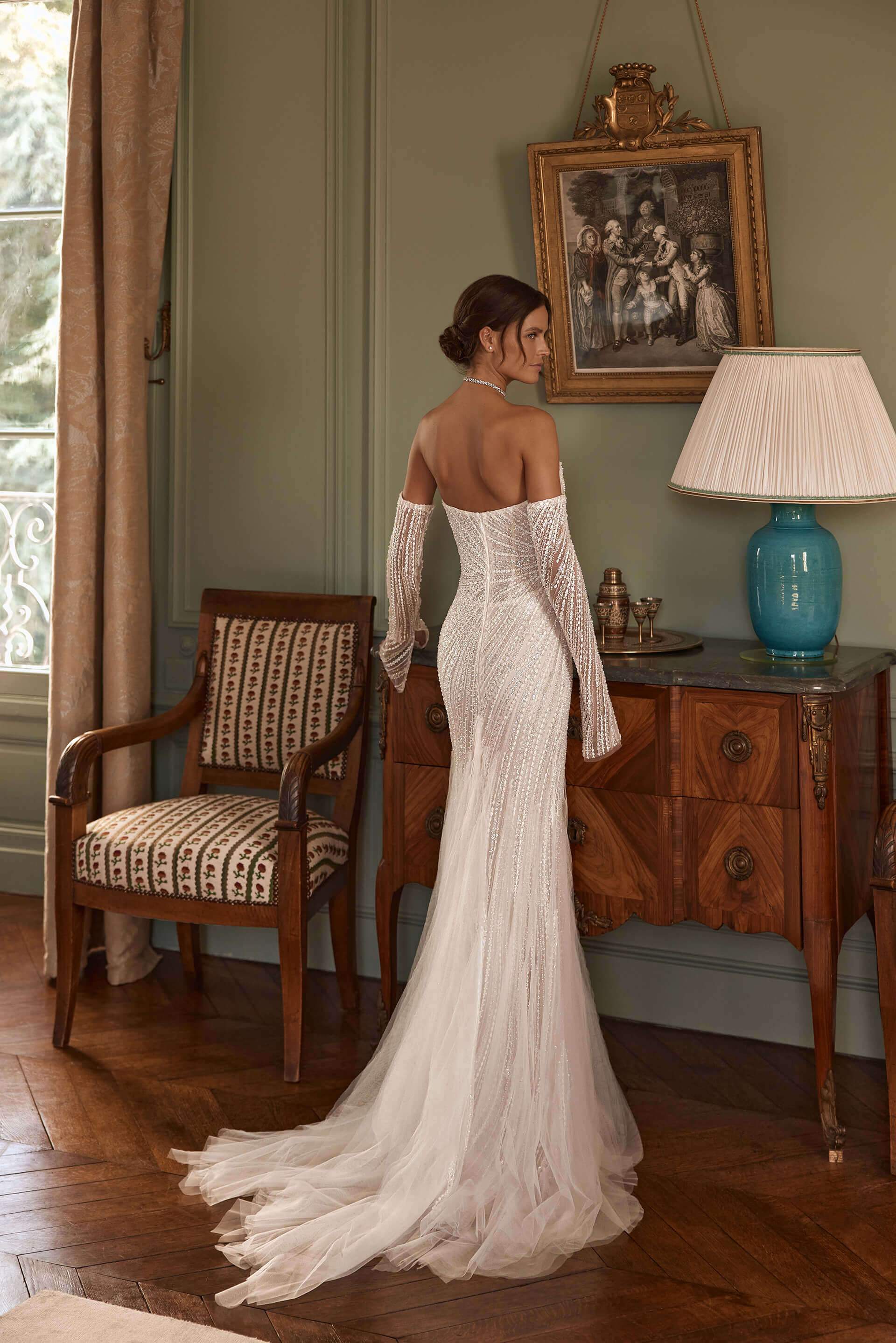 Avin er en fortryllende perlebesat brudekjole, med en simpel stropløs udskæring. Det perlebesatte mønster fortsætter hele vejen ned ad kjolen og fremhæver det eventyrlige slids.