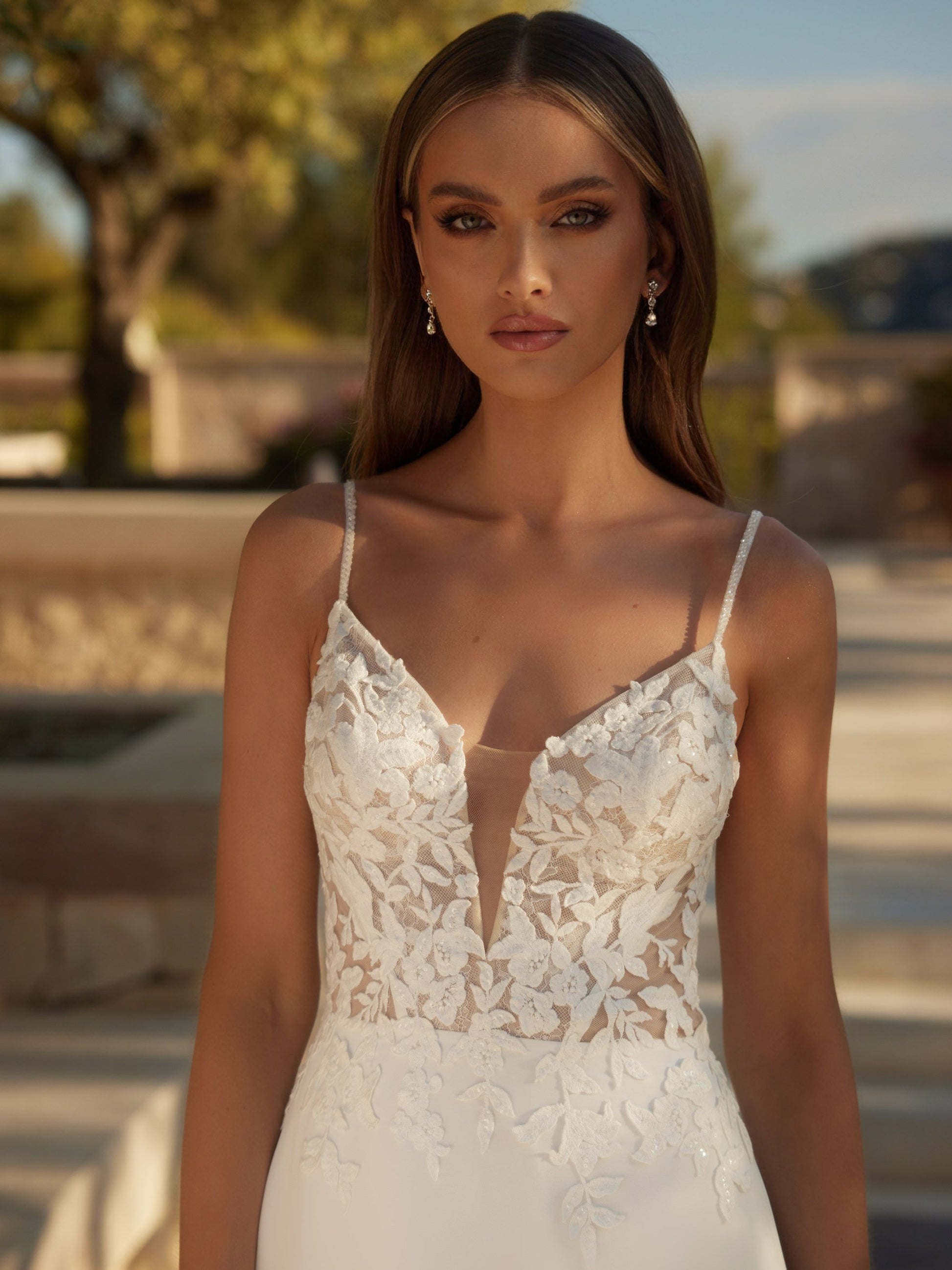 Beryl er en smuk A-line brudekjole med et ekstavagant slæb med blonder, samt feminine spaghetti stropper.