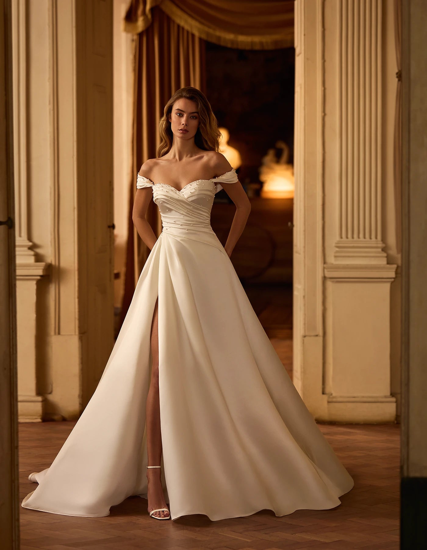 En elegant og tidløs brudekjole med off-shoulder snit, perlebroderet draperet liv og et voluminøst skørt med høj slids. Den lave ryg og det flydende slæb giver et romantisk og sofistikeret udtryk – perfekt til den moderne brud med klassisk sans.