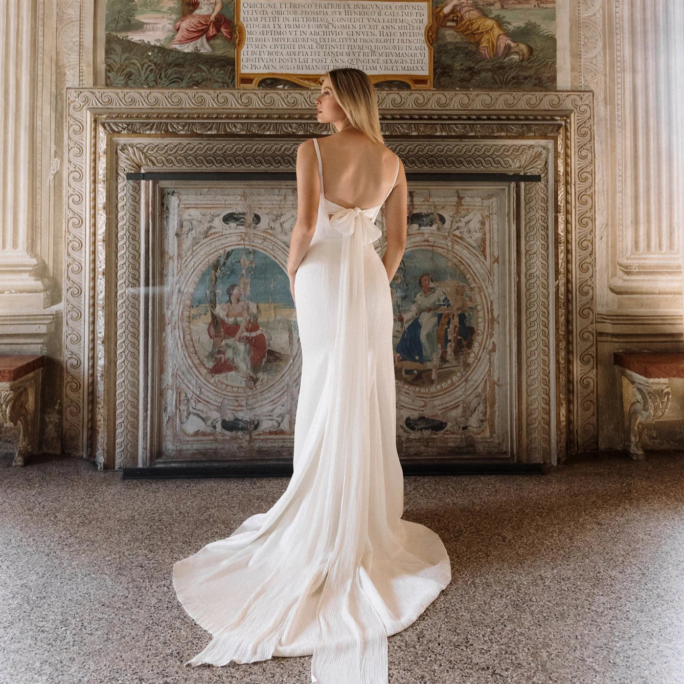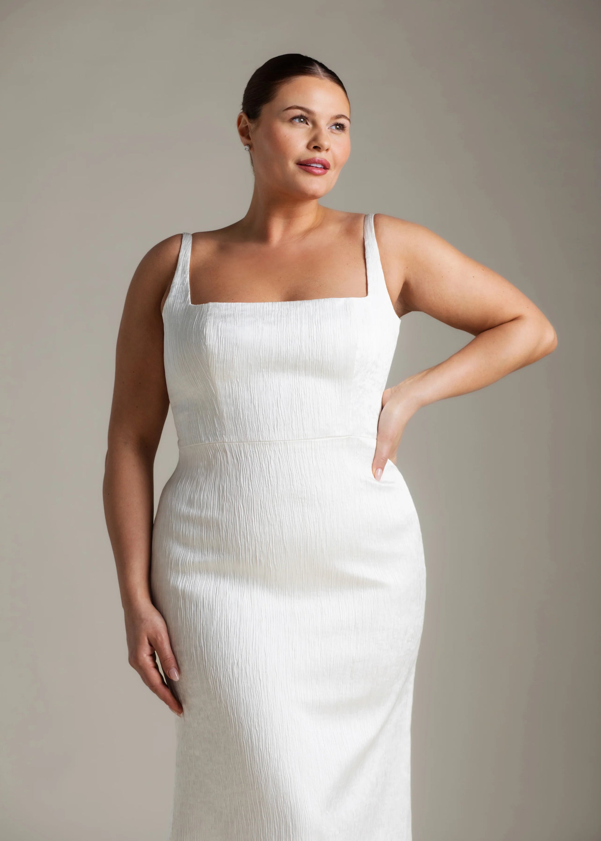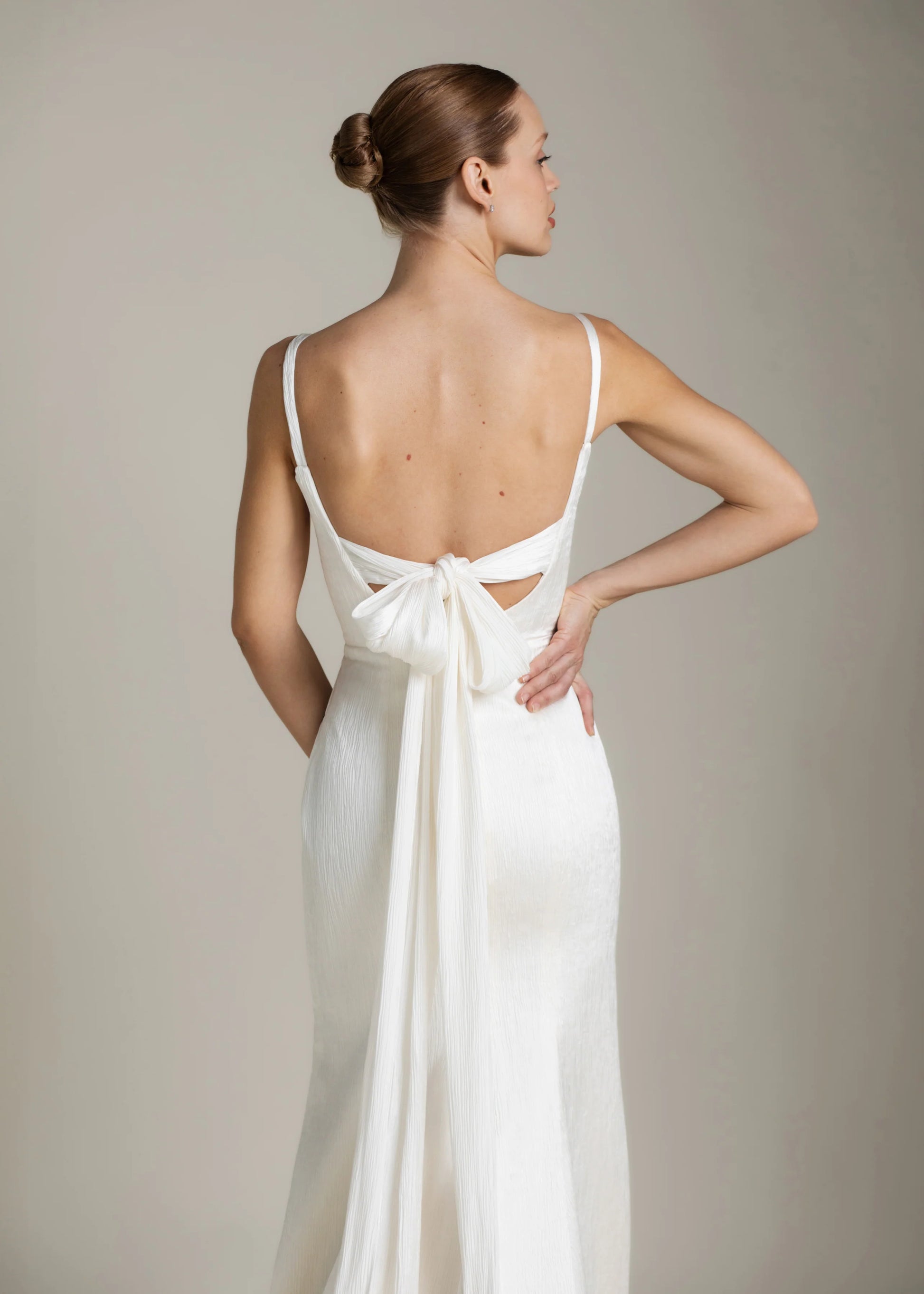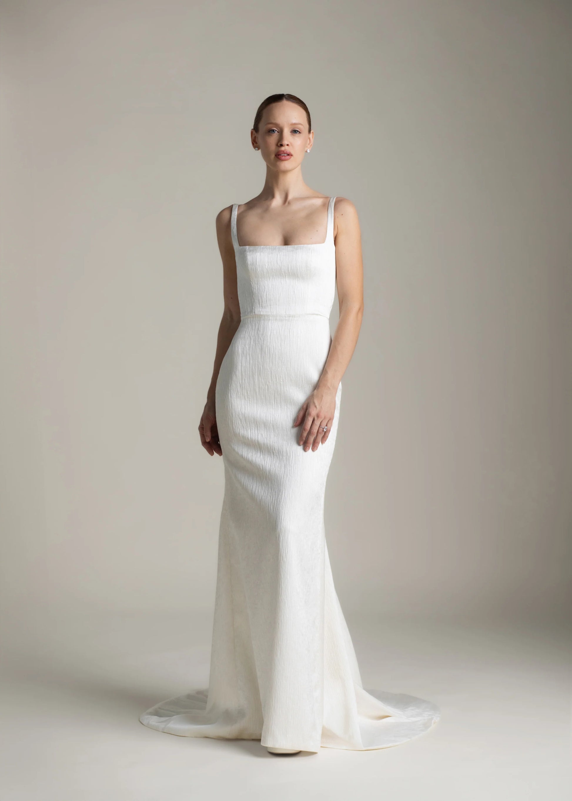 Kjolens firkantede udskæring og de fine, smalle stropper indrammer ansigtet og kravebenene, mens bindebåndet på ryggen tilføjer en skulpturel detalje. Det strømlinede, moderne havfrueskørt smyger sig om figuren og fuldendes af et langt slæb, der flyder med hvert eneste skridt. Daphne er foret med behageligt, off-white midori og er fra top til tå udført i luksuriøs, tekstureret satin.