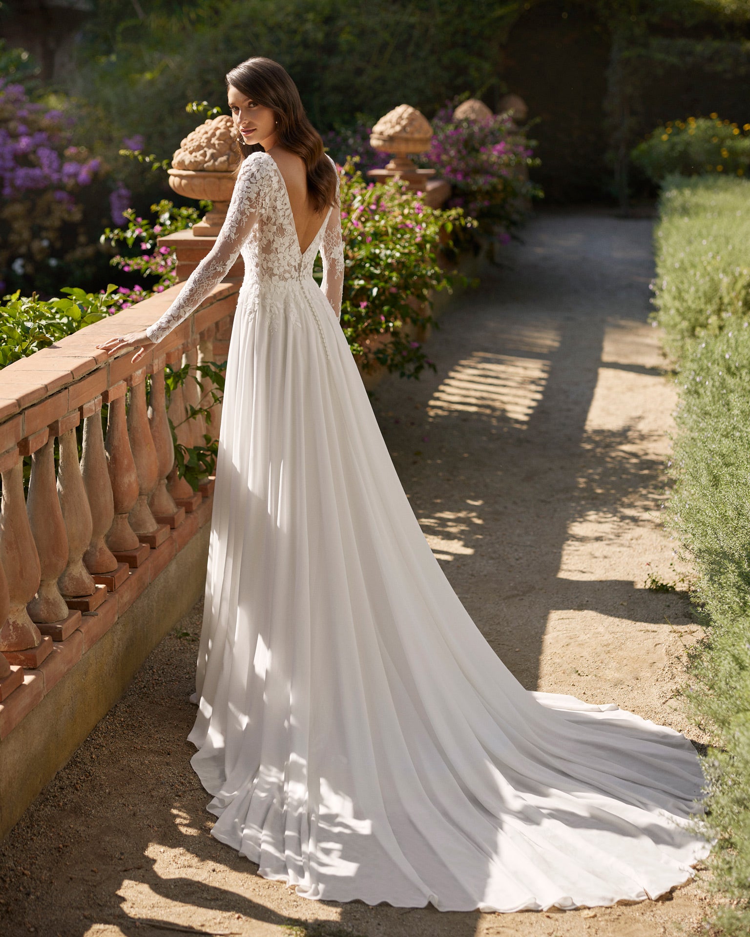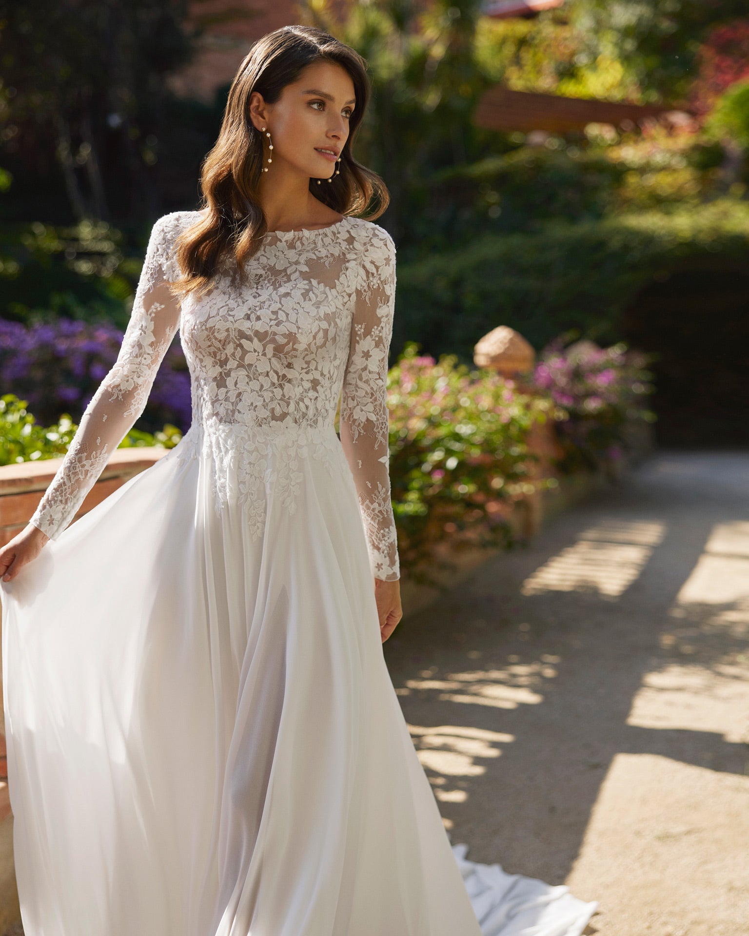 Med sin høje udskæring og lange blonderede ærmer udstråler den en tidløs skønhed. Den lette, flydende nederdel falder yndefuldt og skaber en smuk kontrast til den detaljerede blondeoverdel, der indrammer bruden med et klassisk og romantisk udtryk.
