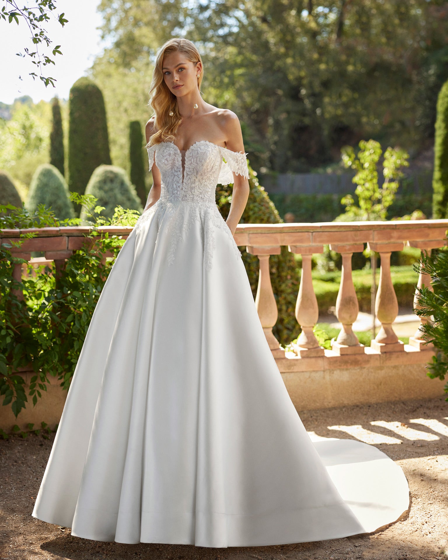 Off-shoulder blondeoverdel fremhæver skuldrene smukt og tilfører et romantisk touch, mens den fyldige satin-underdel skaber et majestætisk udtryk. Den dybe sweetheart-udskæring tilføjer et hint af sensualitet, og den delikate blonddetalje på overdelen skaber en perfekt moderne stil.
