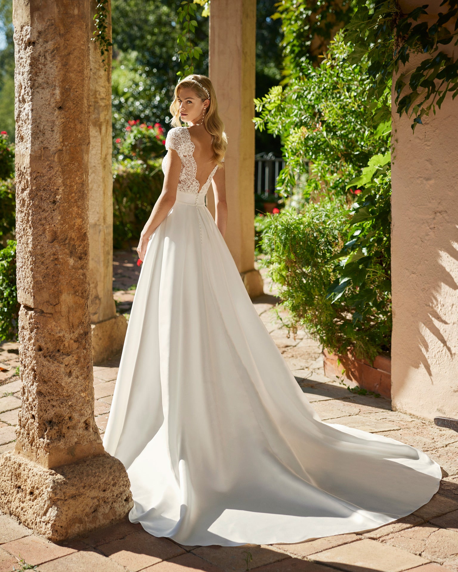 Denne brudekjole udstråler elegance med sin smukt dekorerede blondeoverdel og den strømlinede, satin nederdel. Den dybe V-udskæring og de korte blondeærmer skaber en romantisk og sofistikeret stil, mens den høje slids i nederdelen tilføjer et strejf af moderne kant.