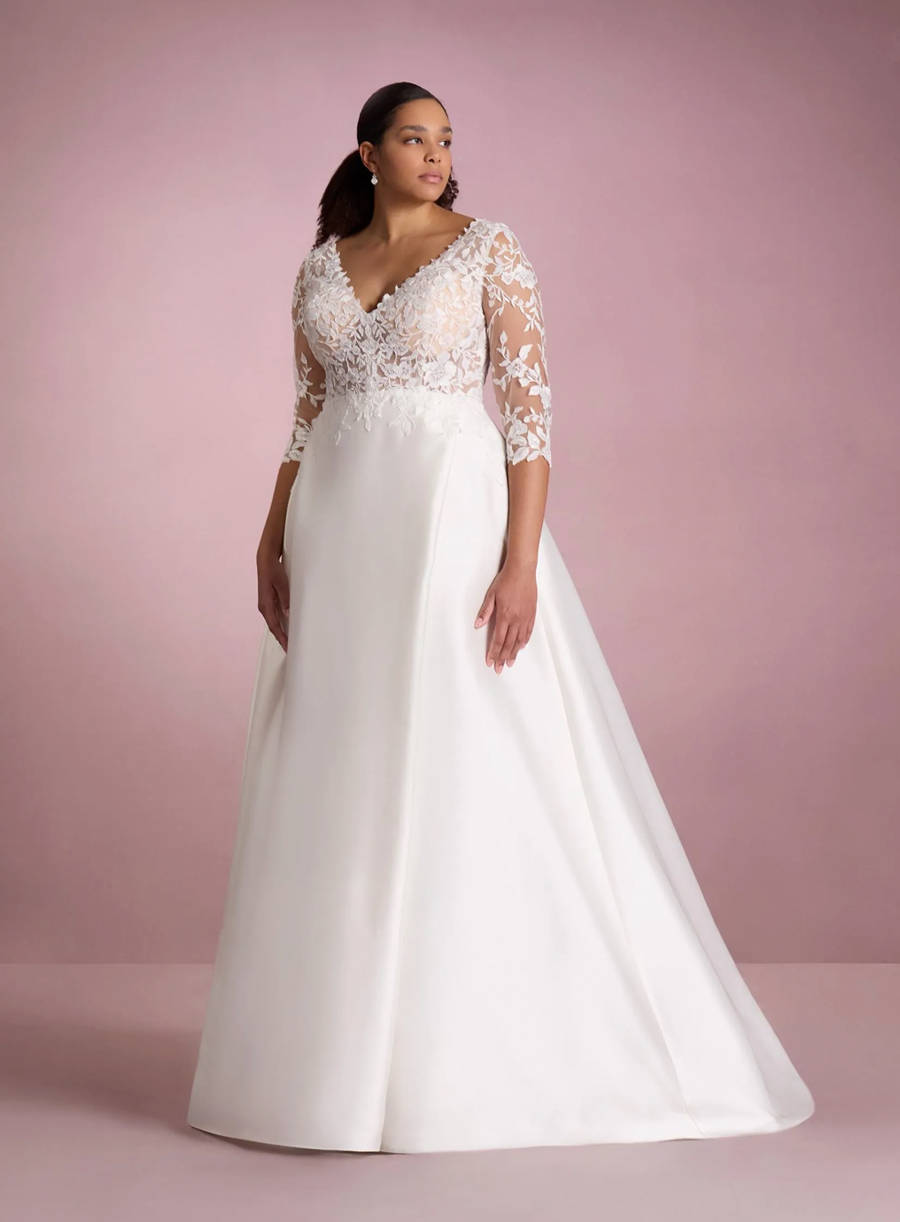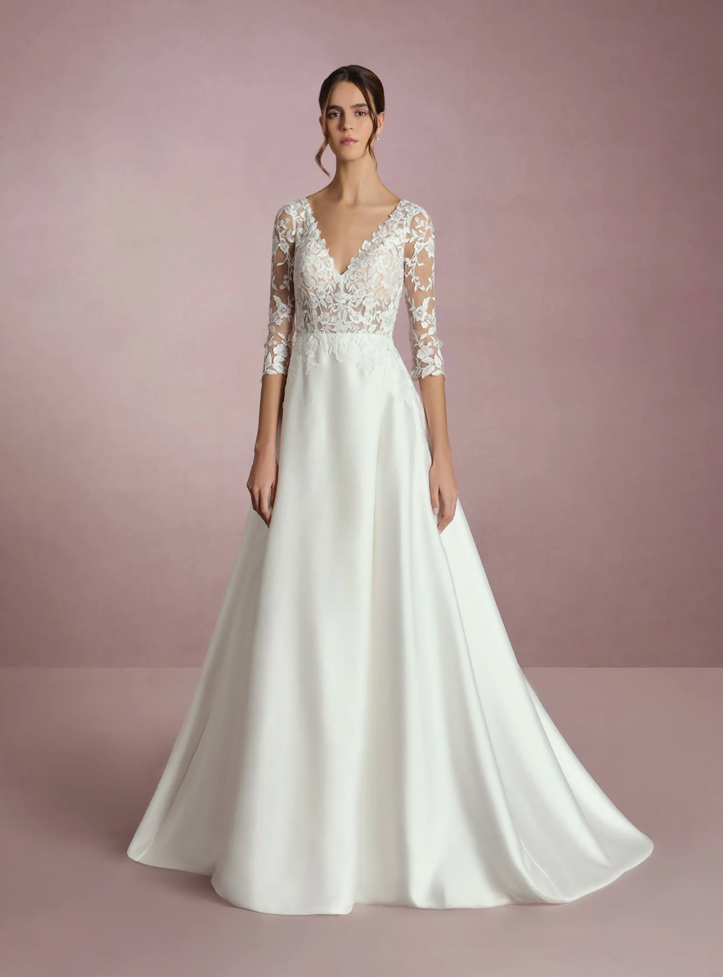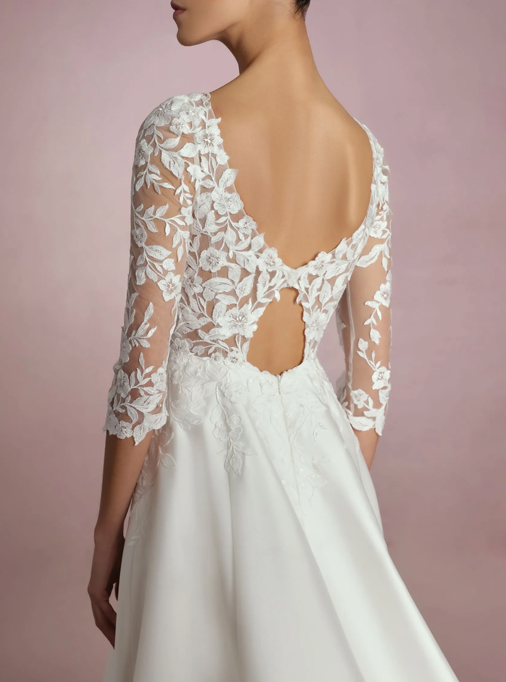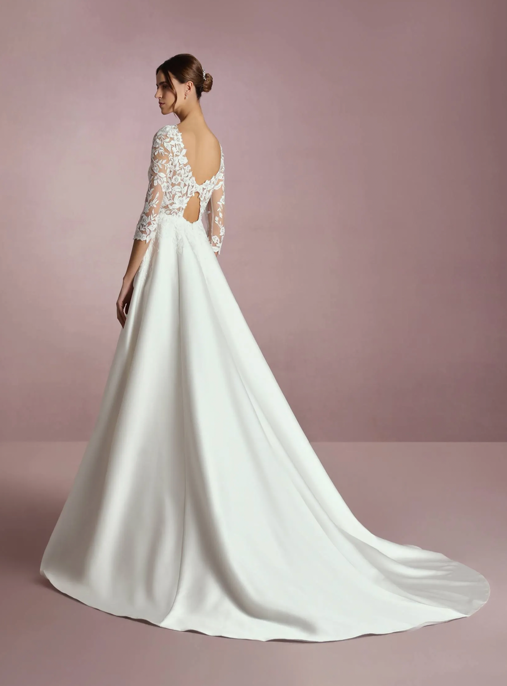 Denne smukke brudekjole kombinerer klassisk skønhed med moderne detaljer. Den fine blondeoverdel med trekvartærmer og en elegant rygudskæring tilføjer en romantisk touch, mens det enkle, flydende skørt giver en smigrende silhuet.