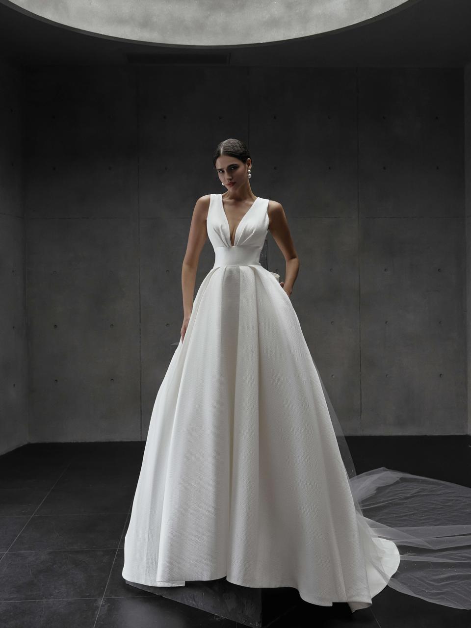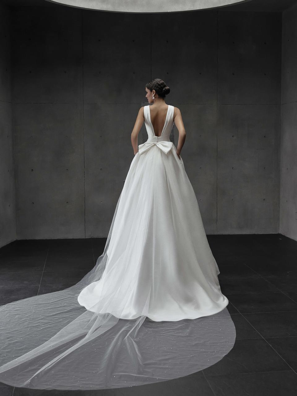 Denne kjole er en elegant og moderne brudekjole i struktureret stof med en dyb V-udskæring foran og en lav rygudskæring bagpå. Den har brede skulderstropper og en smal, markeret talje, der fremhæver figuren. Skørtet er fyldigt og formet i en klassisk A-facon, som giver kjolen et voluminøst og sofistikeret udtryk. Bagpå er kjolen pyntet med en stor sløjfe i taljen og en lang tylslæb, der tilfører et romantisk touch.