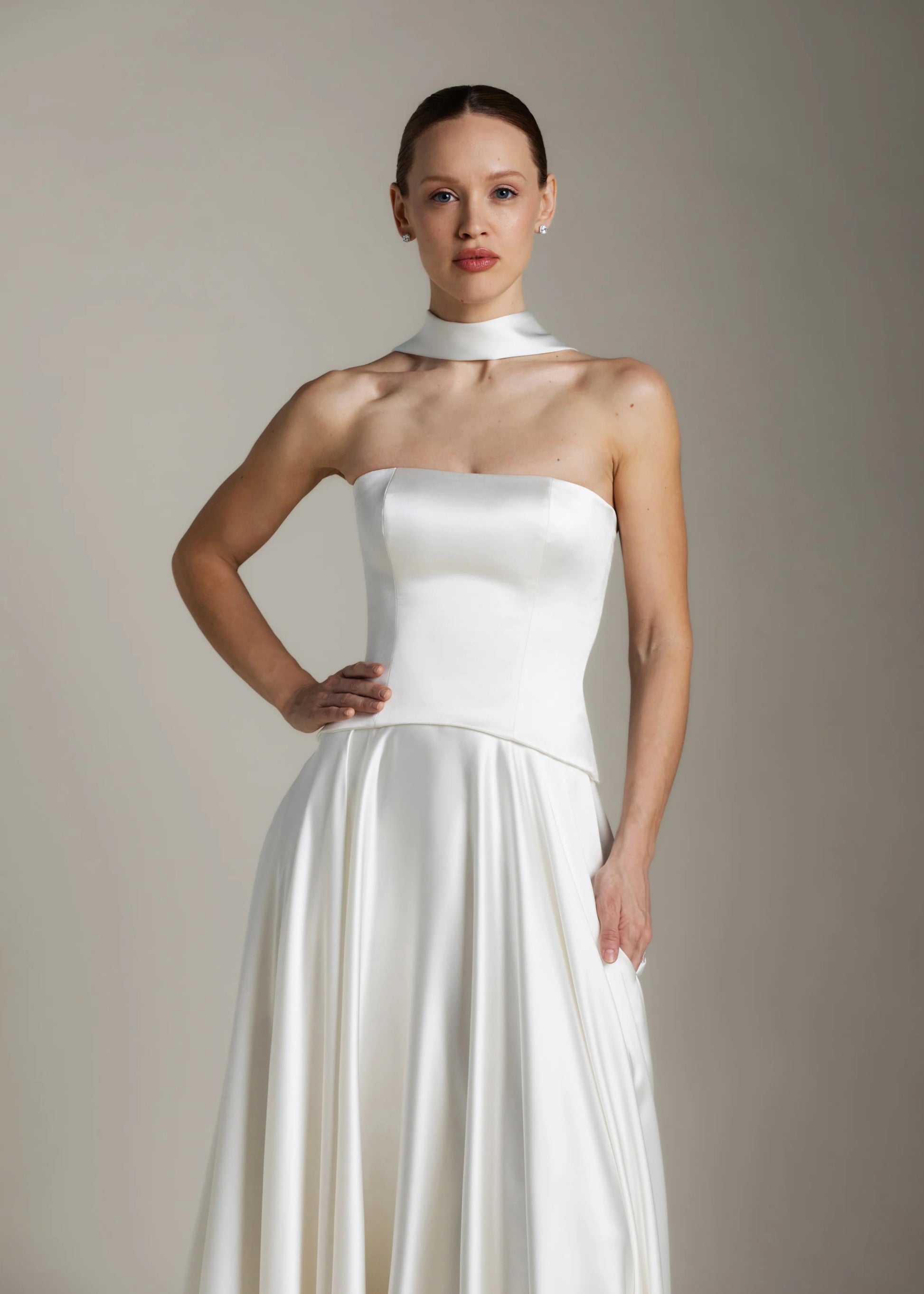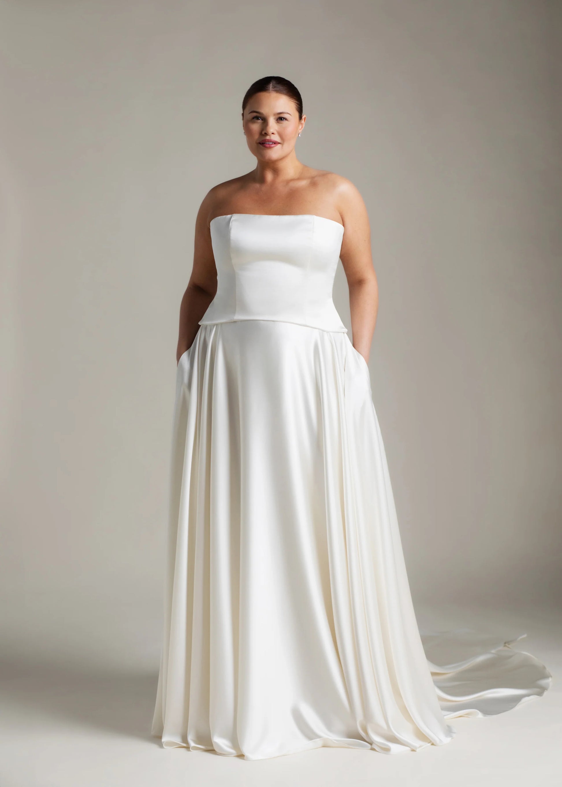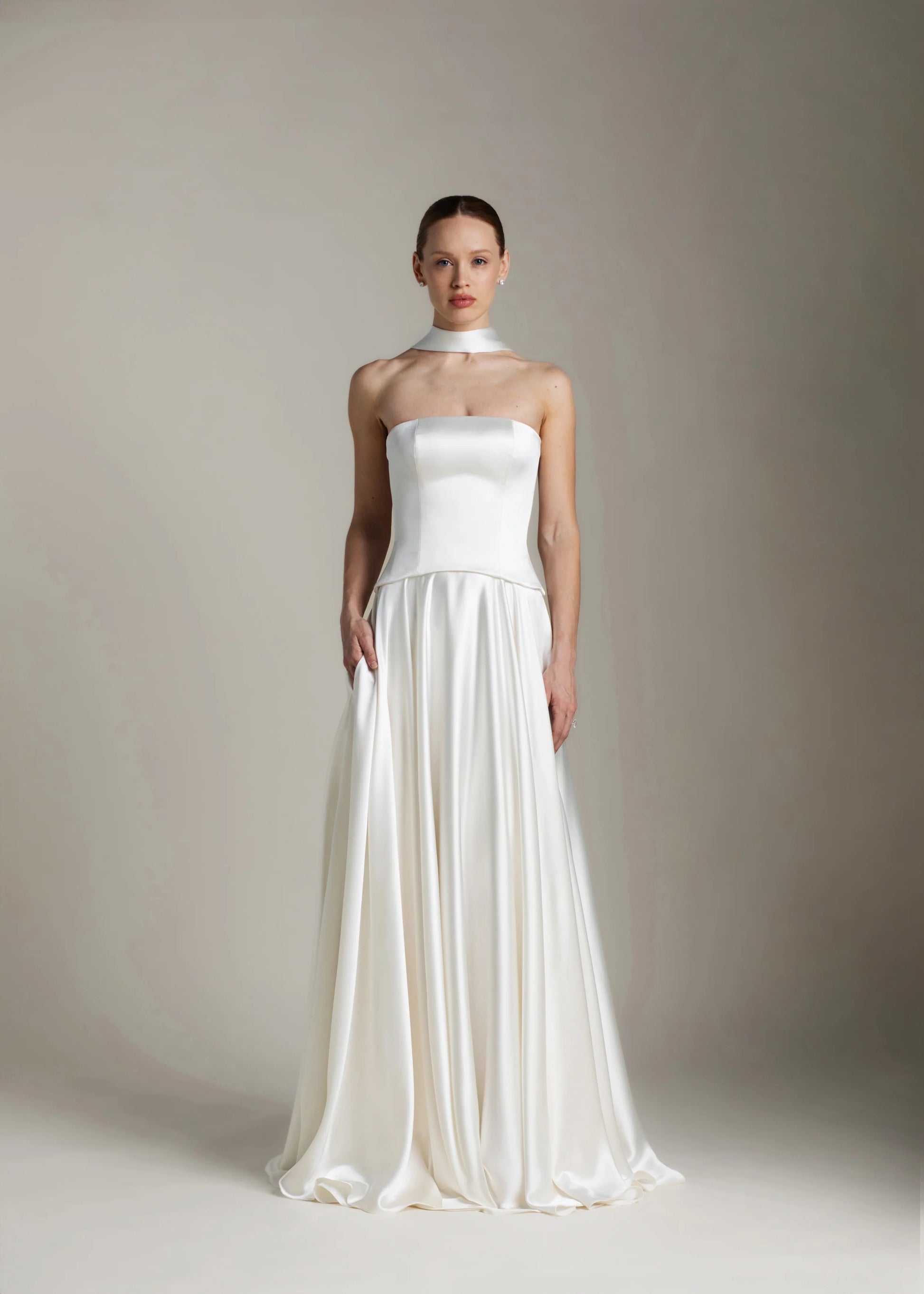 Gaia er en hyldest til skulpturel enkelhed. Den stropløse overdel skaber en ren silhuet med sin lige udskæring. Den buede, sænkede talje smyger sig blidt om kurverne og falder ned i et stort skørt, der gemmer på diskrete lommer og et luksuriøst slæb. Snørelukningen i ryggen tilføjer et strejf af klassisk romantik og står i smuk kontrast til det ikoniske, flydende satin.