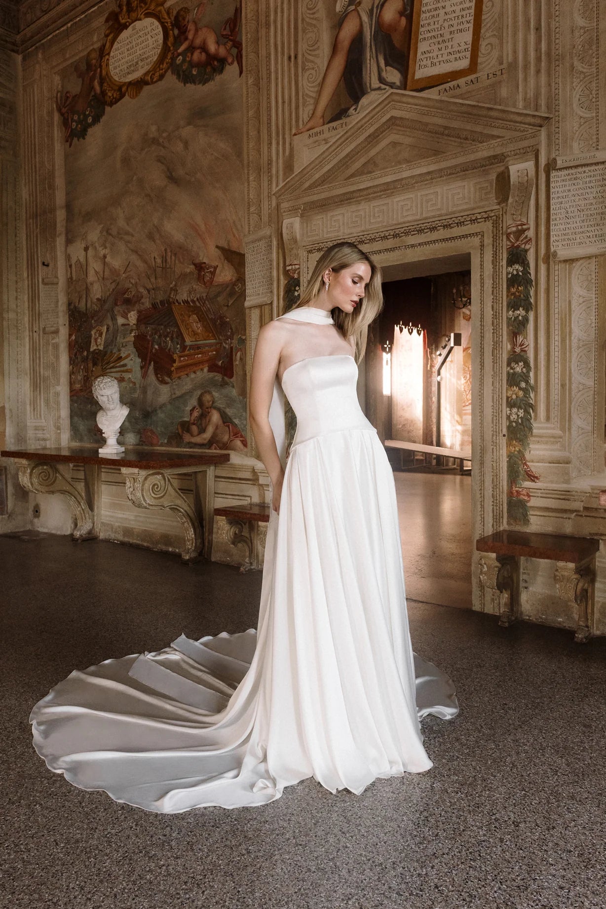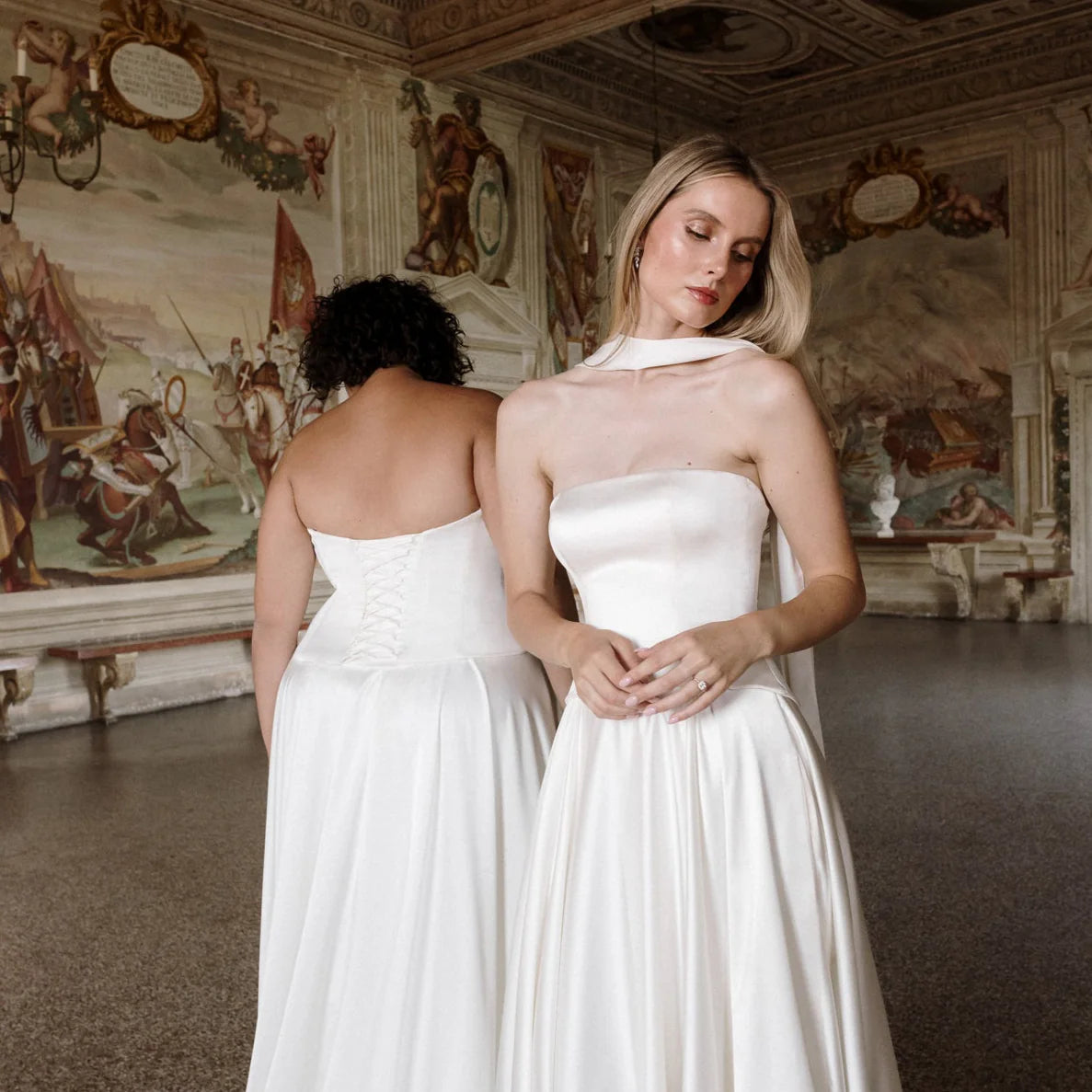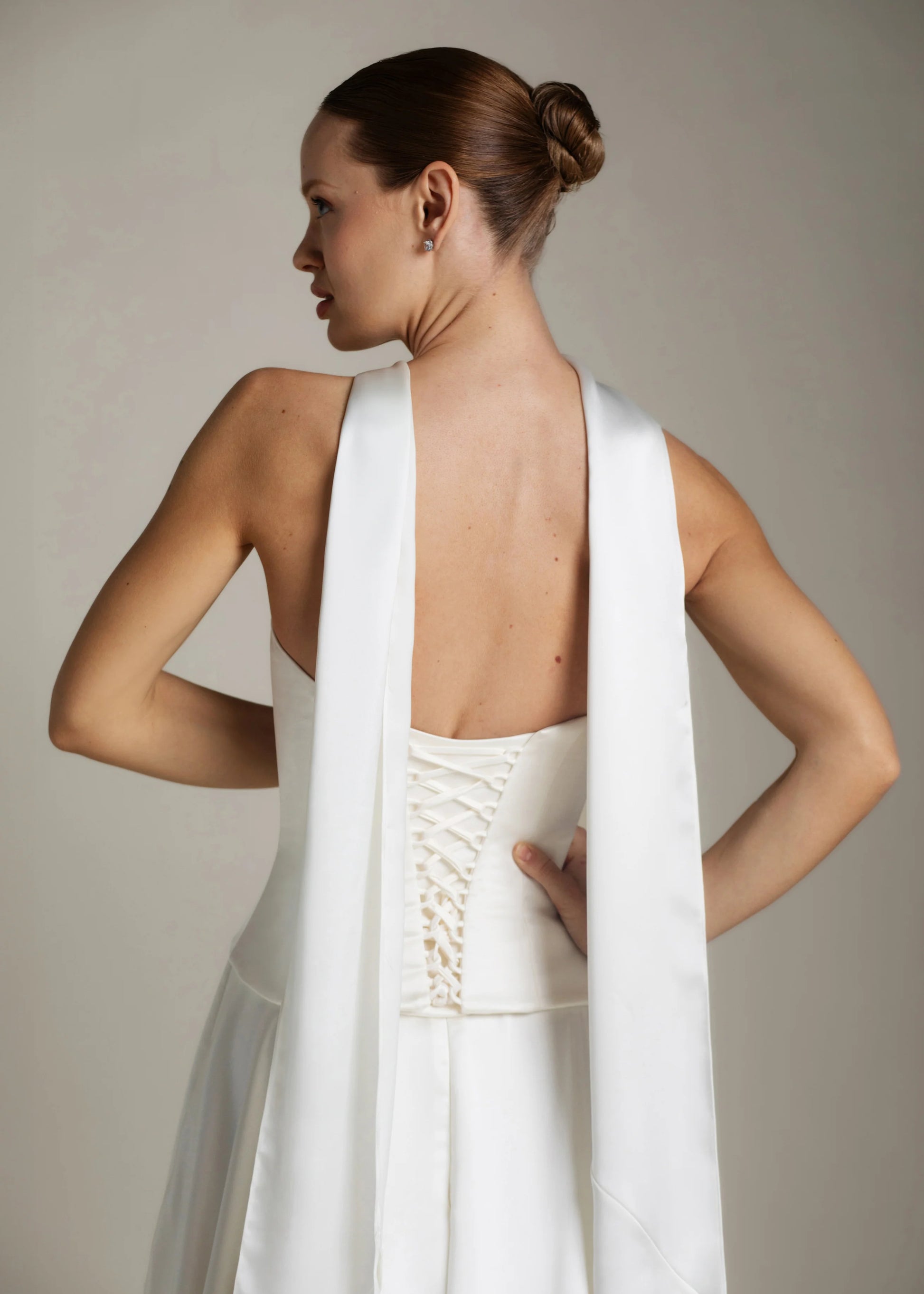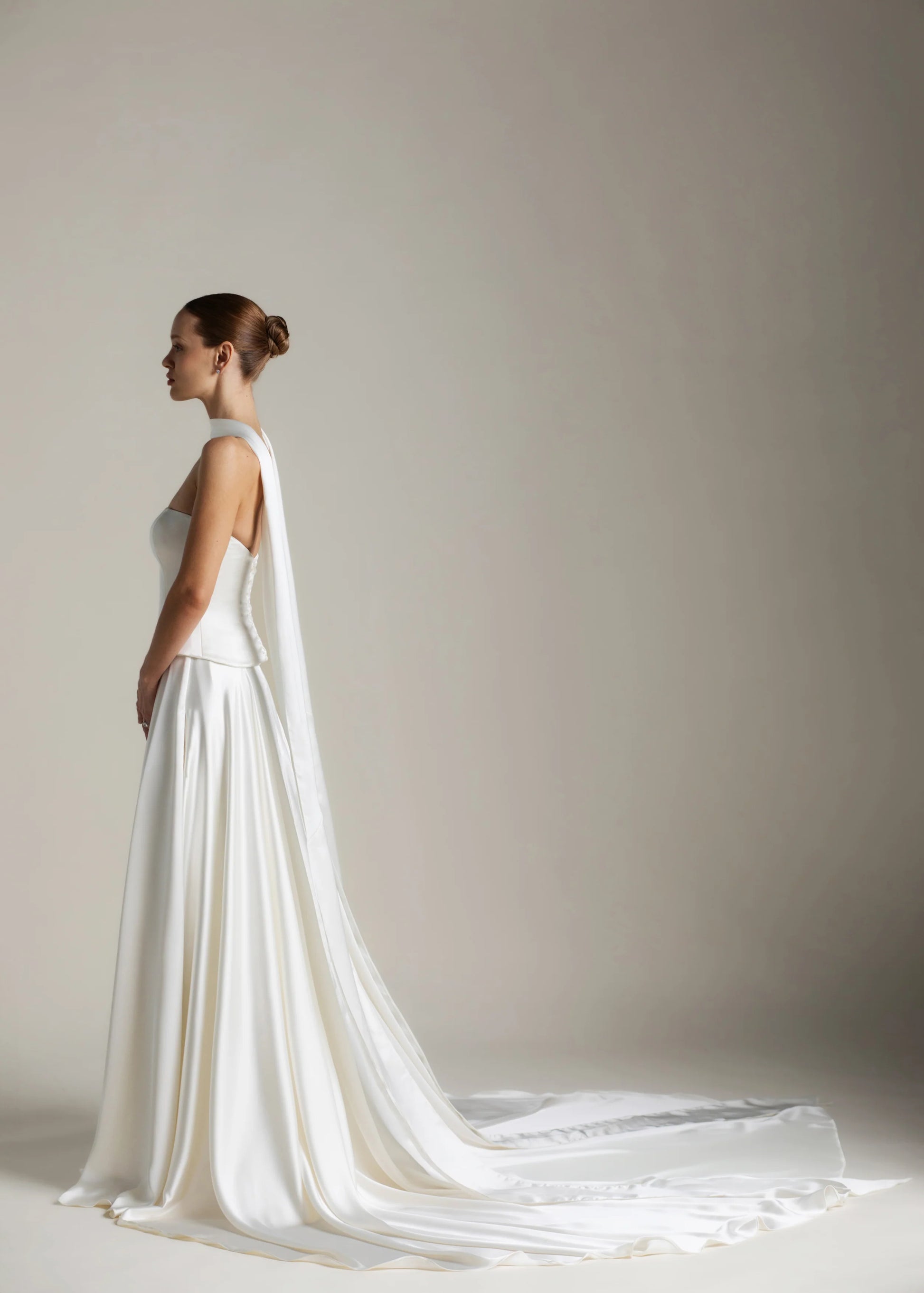 Gaia er en hyldest til skulpturel enkelhed. Den stropløse overdel skaber en ren silhuet med sin lige udskæring. Den buede, sænkede talje smyger sig blidt om kurverne og falder ned i et stort skørt, der gemmer på diskrete lommer og et luksuriøst slæb. Snørelukningen i ryggen tilføjer et strejf af klassisk romantik og står i smuk kontrast til det ikoniske, flydende satin.