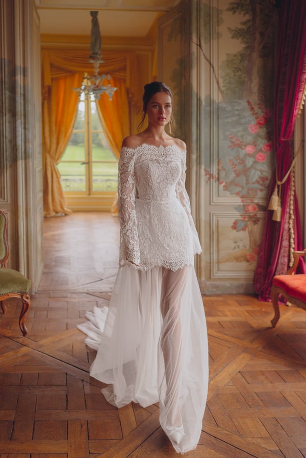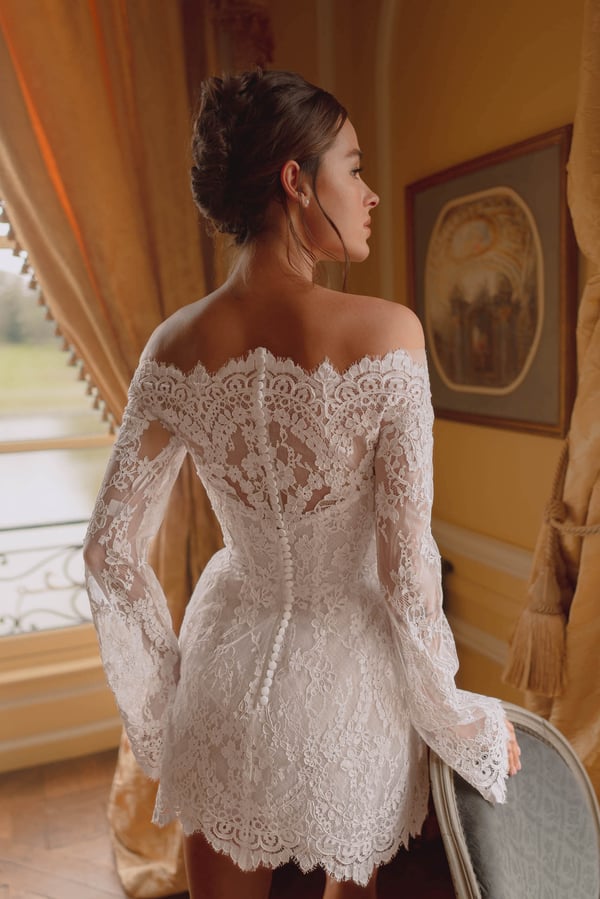 Gigi kjolen er kort og figursyet med smukke blondedetaljer, lange ærmer og en sofistikeret off-shoulder halsudskæring. De fine knapper langs ryggen og de delikate blonder med bølgekant giver kjolen et tidløst og eksklusivt look.