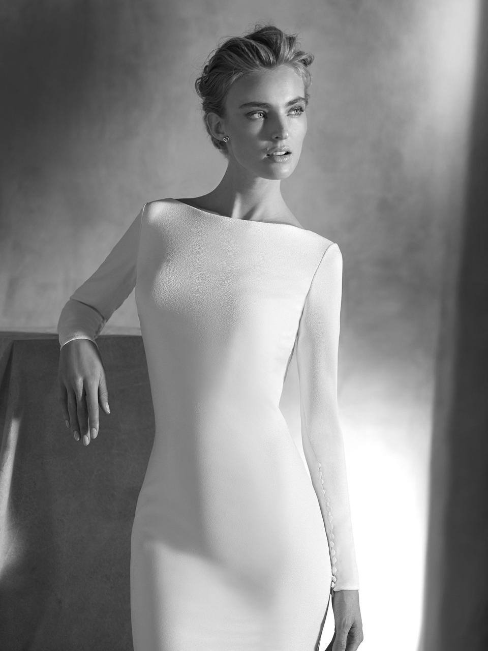 Denne kjole er et smukt eksempel på minimalistisk elegance med sin klassiske, kropsnære silhuet, der flot fremhæver figuren og munder ud i et blødt, flydende slæb. Foran har kjolen en sofistikeret, høj bådudskæring, som skaber en smuk kontrast til den dybe V-udskæring på ryggen. De lange, tætsiddende ærmer afsluttes med en fin række af betrukne knapper ved håndleddene, og denne fine detalje går igen på ryggen, hvor en elegant række af knapper løber fra den dybe rygudskæring og ned over lænden.