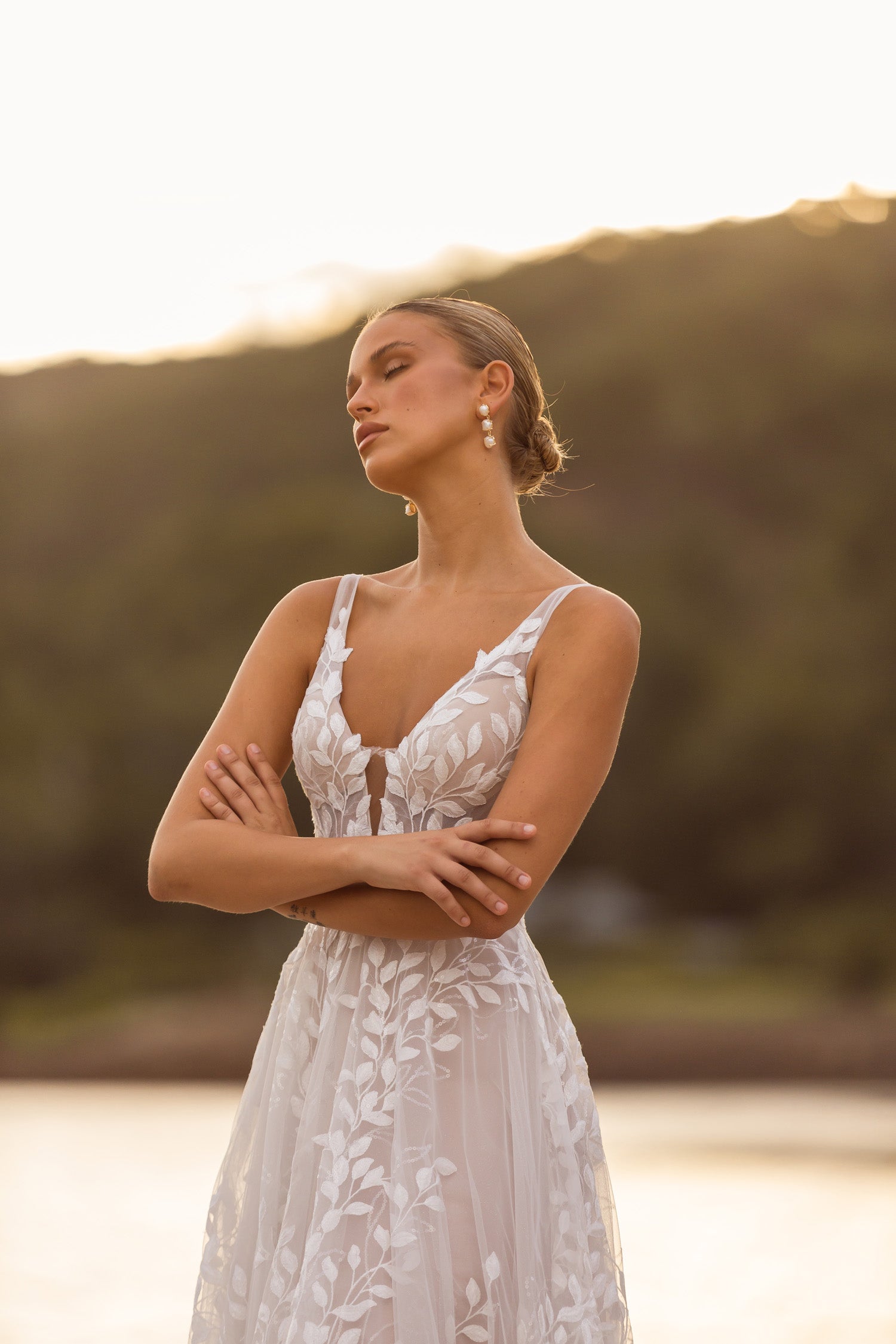 Jaya er alt, hvad en brud ønsker og elsker. Kjolen har en A-line silhuet og en silkeblød charmeuse foring som giver brude den luksuriøse følelse. Kjolens overdel består af en dyb V-udskæring til taljen og har fine illusions-tylstropper med aftagelige hænge stropper. De bladlignende blonder og pailletter spredt ud over kjolen fuldender looket.