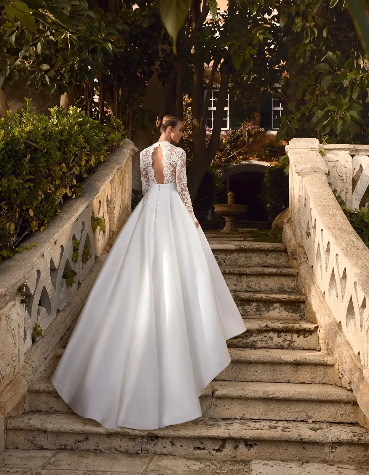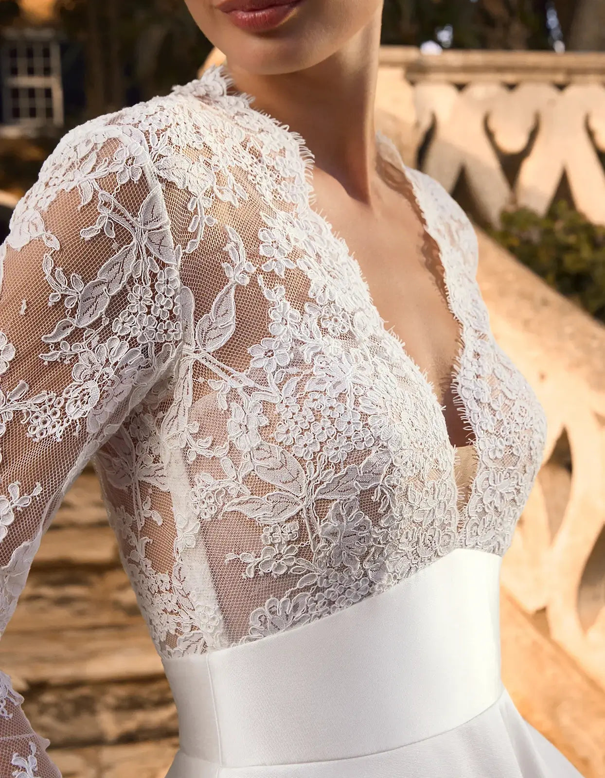 En klassisk og romantisk brudekjole med blondeoverdel og lange ærmer. Den dybe V-udskæring og åbne ryg tilføjer et moderne touch, mens det glatte mikadoskørt med lommer giver kjolen et elegant og tidløst udtryk.