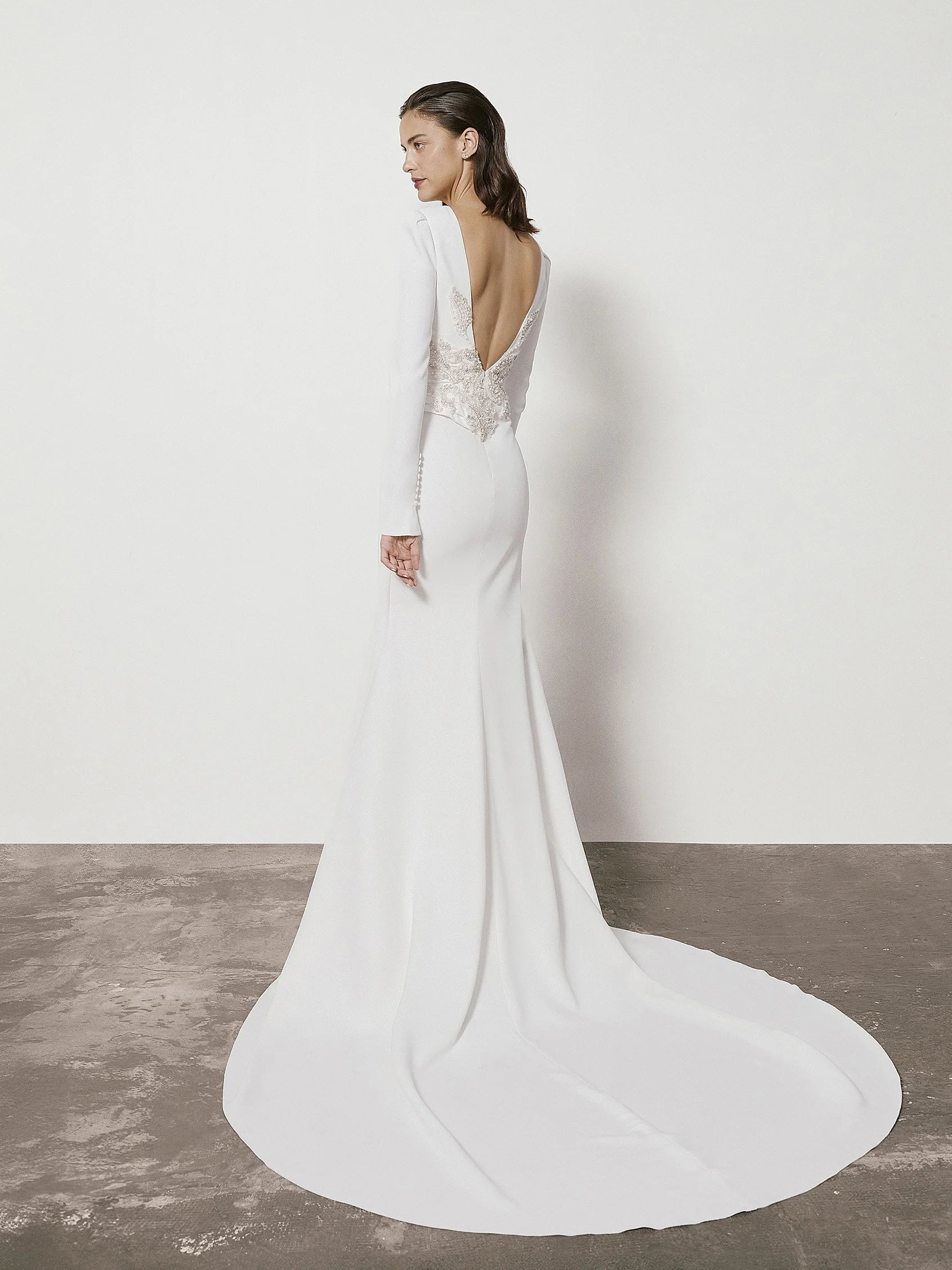 Katheryn er en smuk tætsiddende brudekjole i crepe og lange ærmer. Kjolen har smukke draperinger der fremhæver figuren og en elegant åben ryg med fine broderi detaljer.