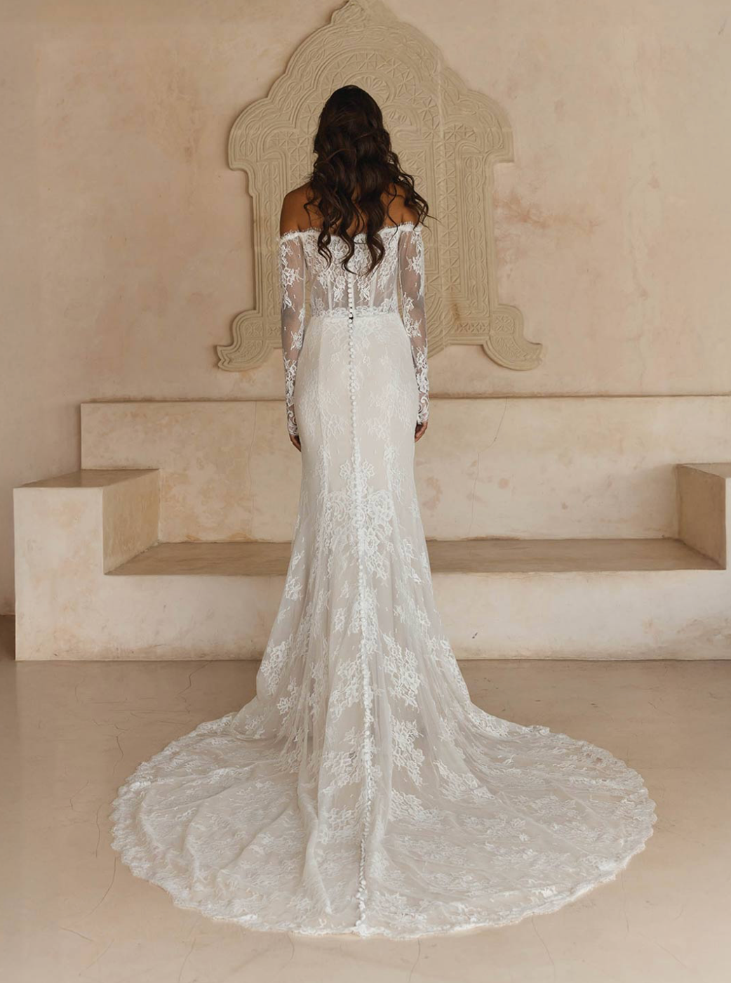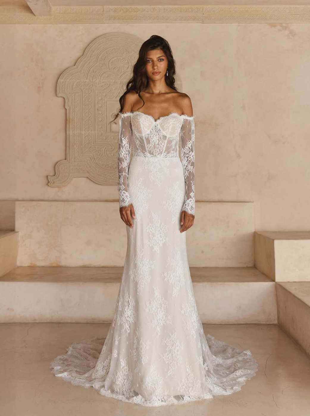 Elegant brudekjole i figursyet snit med romantisk chantilly blonde over hele kjolen. Den har en smuk off-shoulder udskæring, gennemsigtig korsettop med lange blondeærmer og en let slæb, der fuldender det feminine udtryk.