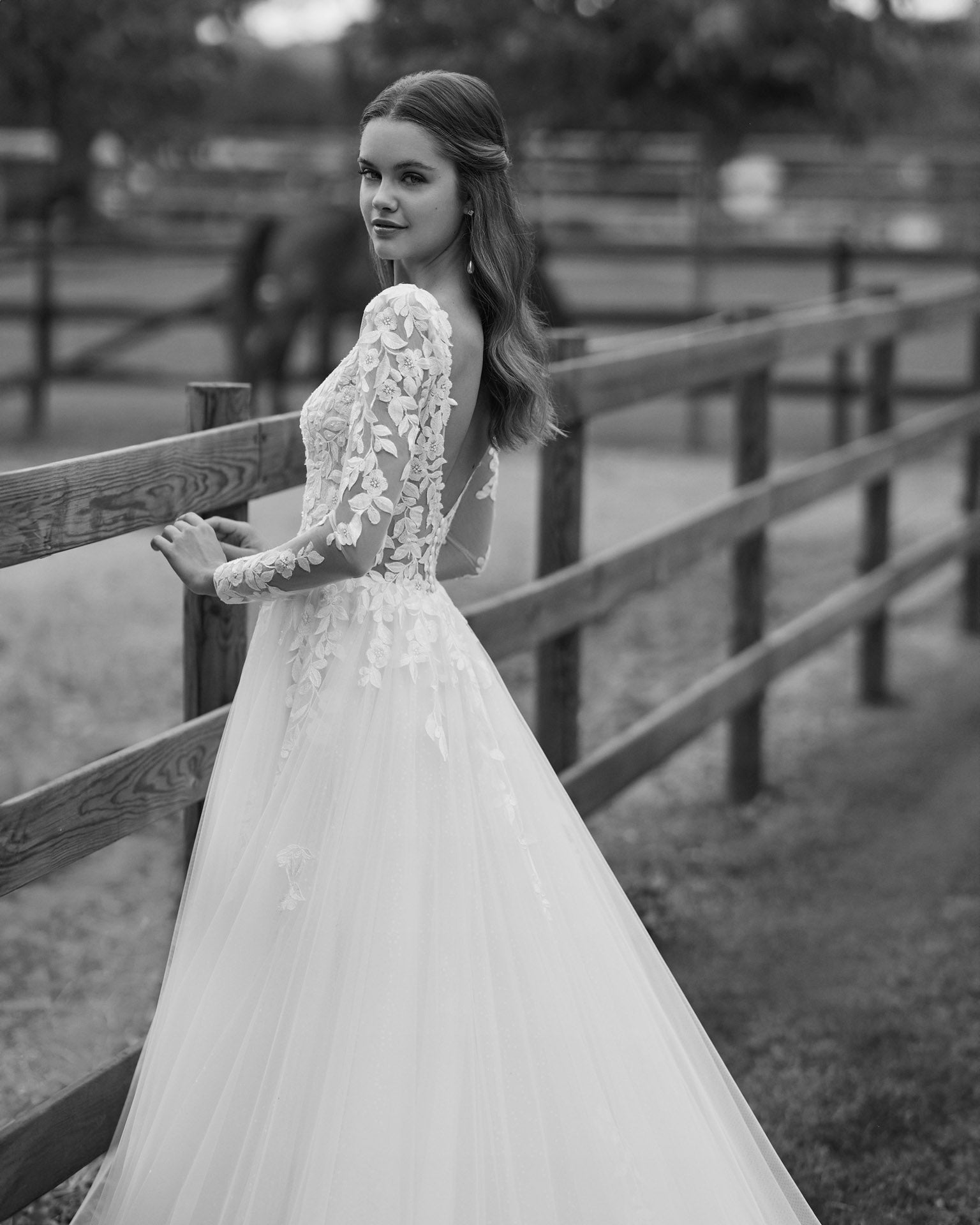 En romantisk brudekjole med dyb V-udskæring, lange tylærmer og blomstrede blonder. Kjolen har en let og svævende A-linje silhuet med åben ryg.