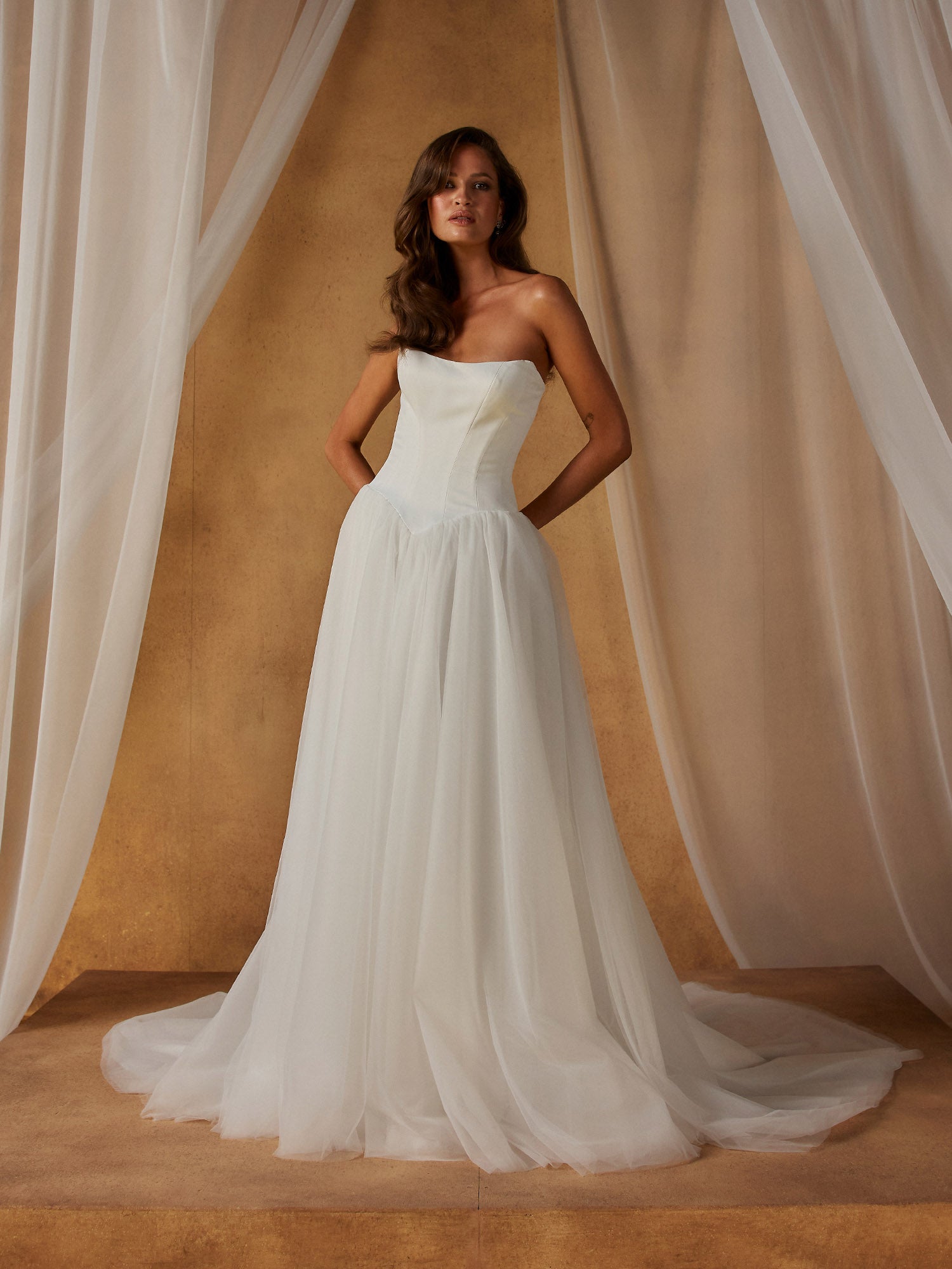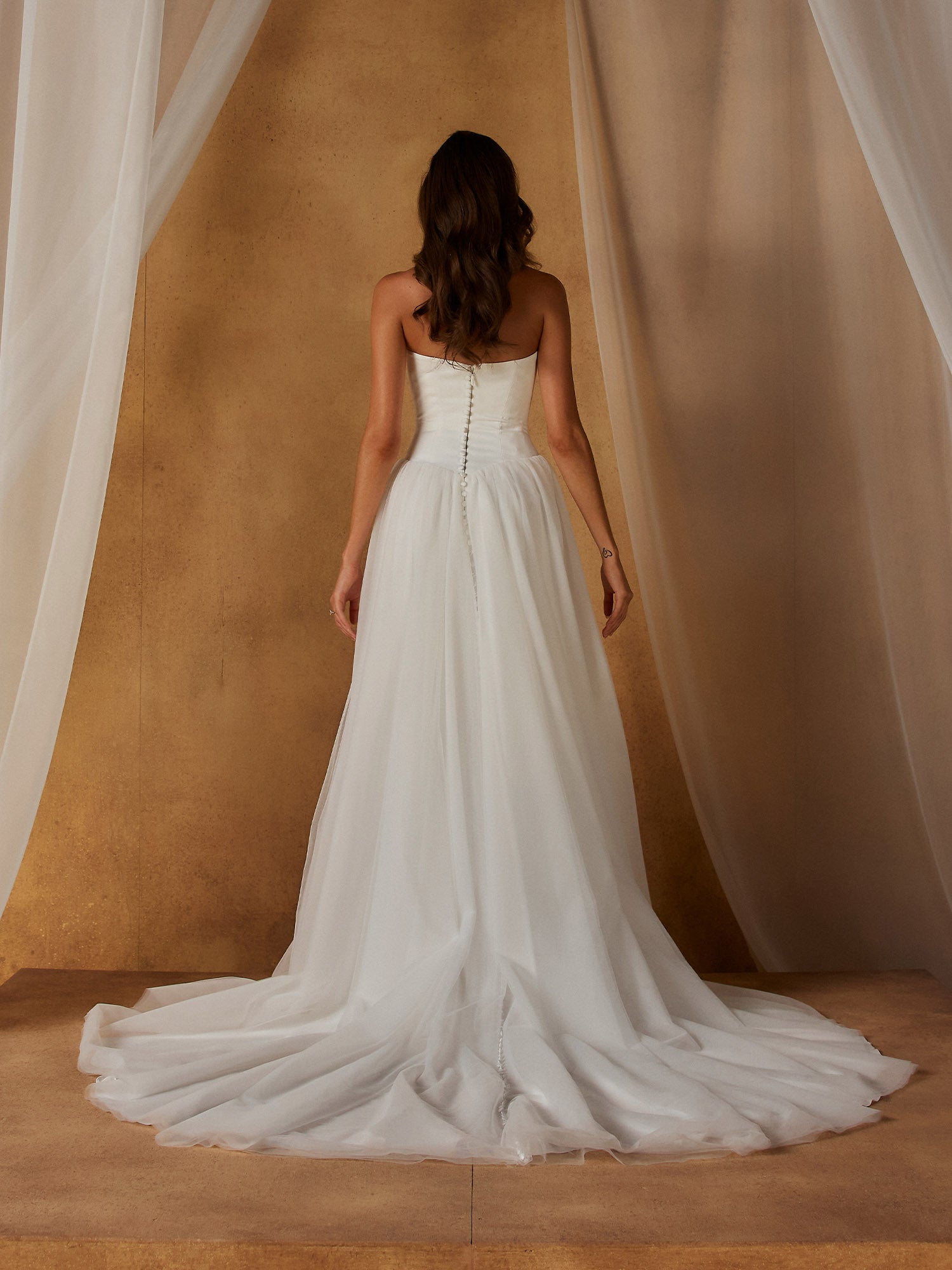 Et eventyrligt og moderne design, der leger med smukke kontraster. Overdelen består af et glat, stilrent korset med en stropløs udskæring og en meget flatterende, spids basque-talje. Fra den markerede, sænkede talje bruser et voluminøst og let tylskørt ud, som skaber en klassisk og let silhuet, mens ryggen afsluttes elegant af en lang knaprække.