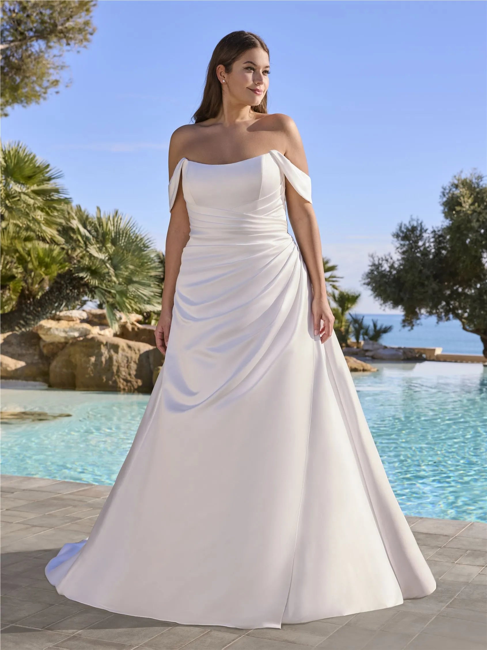 Orchidee er en tidløs og romantisk brudekjole designet til at fremhæve kvindelige former med elegance. Den smukke off-shoulder udskæring kombineret med bløde draperinger i livet skaber et flatterende og feminint udtryk. Det glatte satinlook giver kjolen et luksuriøst skær, mens den lette A-silhuet sikrer komfort og bevægelsesfrihed.