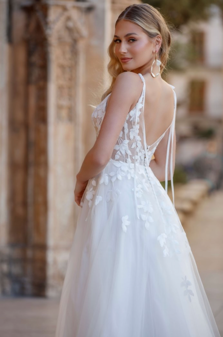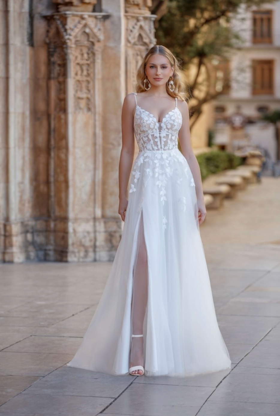 Den tætsiddende overdel fremhæver taljen, mens det delikate blondearbejde tilføjer et lag af raffineret elegance. Med tynde stropper og en dyb udskæring balancerer kjolen perfekt mellem dristighed og subtil skønhed. Skørtet falder blødt med et slids.