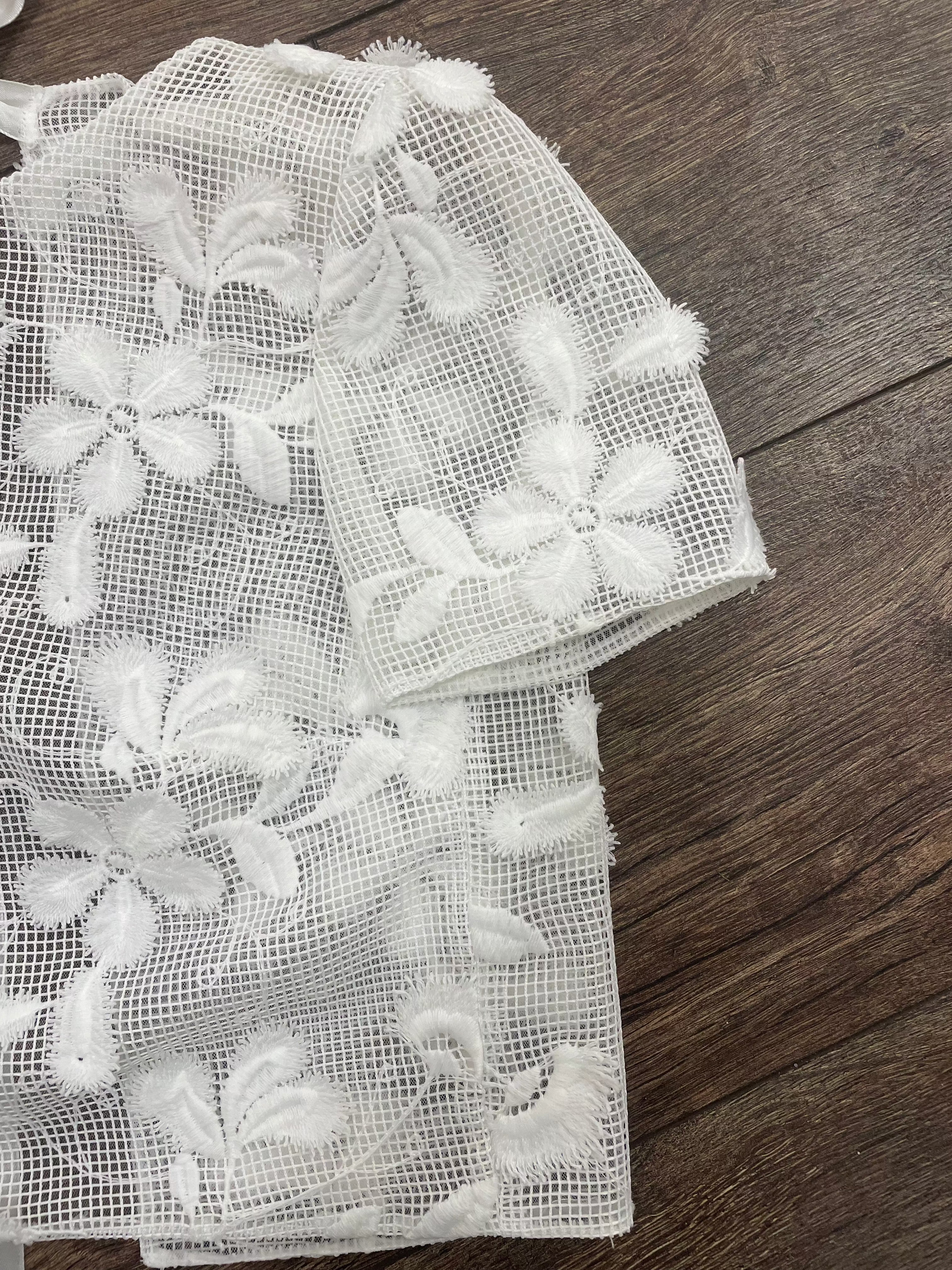 Safira toppen er perfekt til dig, der ønsker et to delt sæt. Toppen har smukke blomstermotiver og bar ryk, med en sløjfedetalje.
