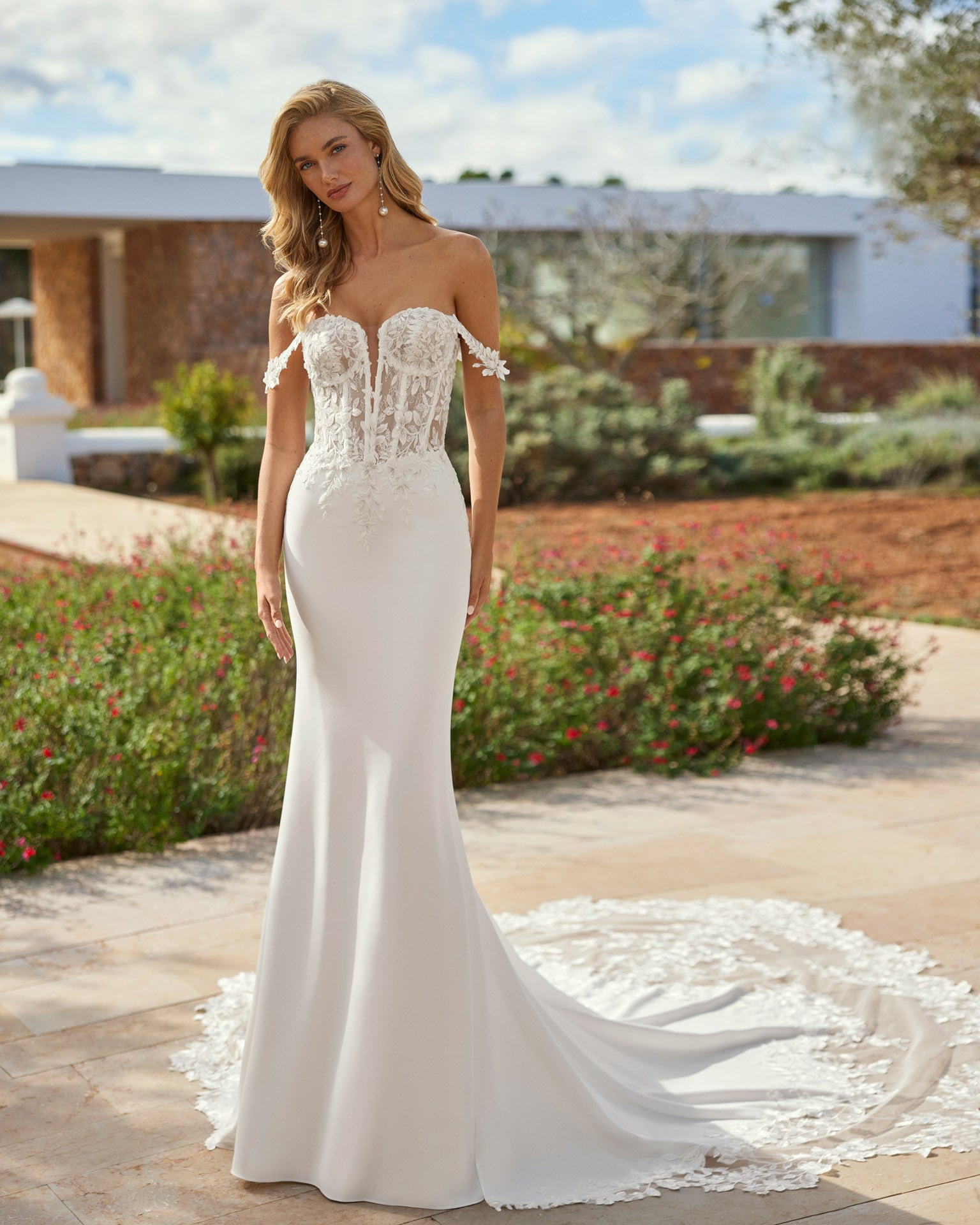 Denne smukke havfrue-brudekjole kombinerer romantik og elegance med en figursyet silhuet og en betagende slæbe. Overdelen har en gennemsigtig korsetlignende struktur med blomsterblonde og et dybt sweetheart-udskæring, der balanceres af små off-shoulder-stropper. Kjolen fremhæver figuren smukt og afsluttes med en dramatisk blondekantet slæb.