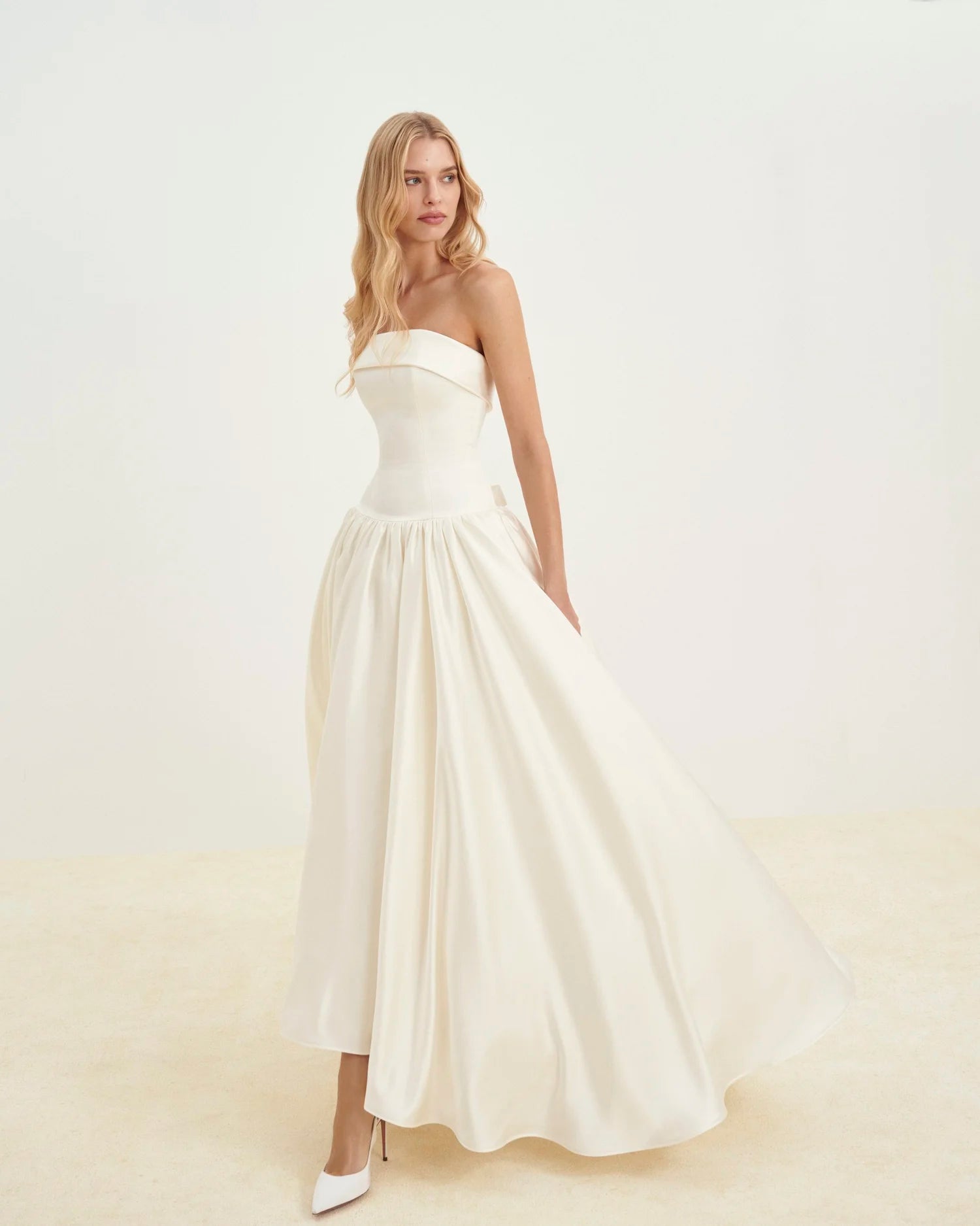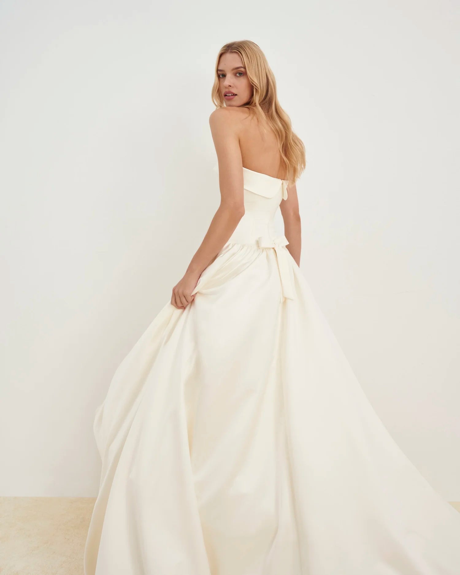 Denne elegante high-low brudekjole kombinerer et figursyet korsetliv med en blød, flydende nederdel i tidløs silhuet. Den stropløse top og det minimalistiske design gør kjolen perfekt til den moderne brud, der ønsker et enkelt og sofistikeret udtryk.