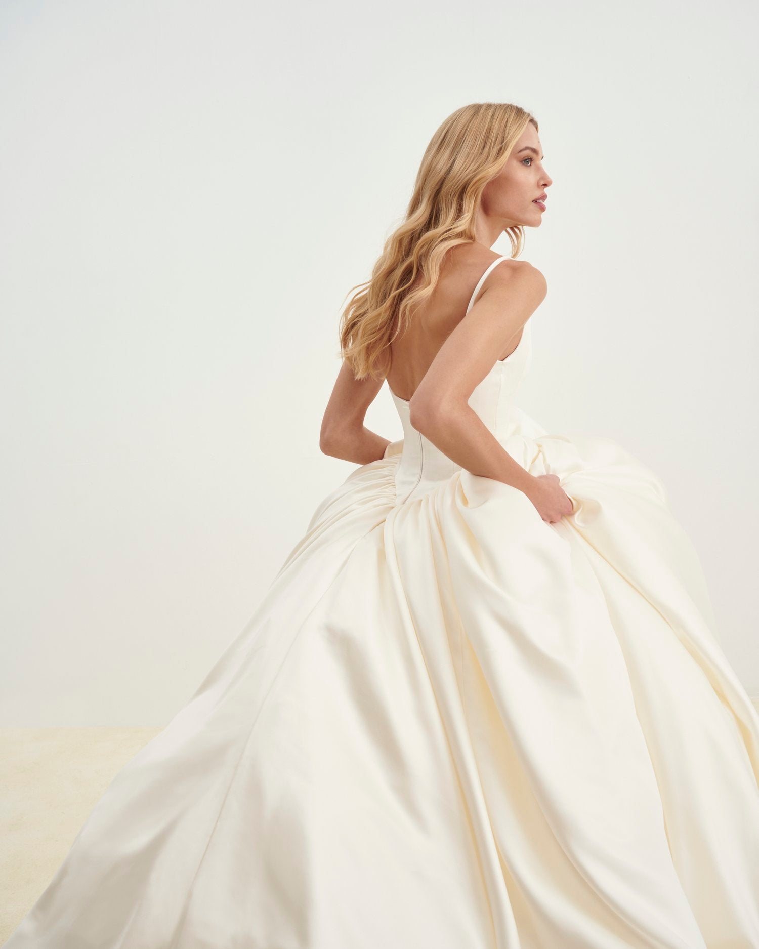 En romantisk og luksuriøs ballkjole i satin med basque-talje og fyldigt skørt. Den har smalle stropper, blød rund udskæring og en elegant, voluminøs silhuet – perfekt til et eventyrligt bryllup.