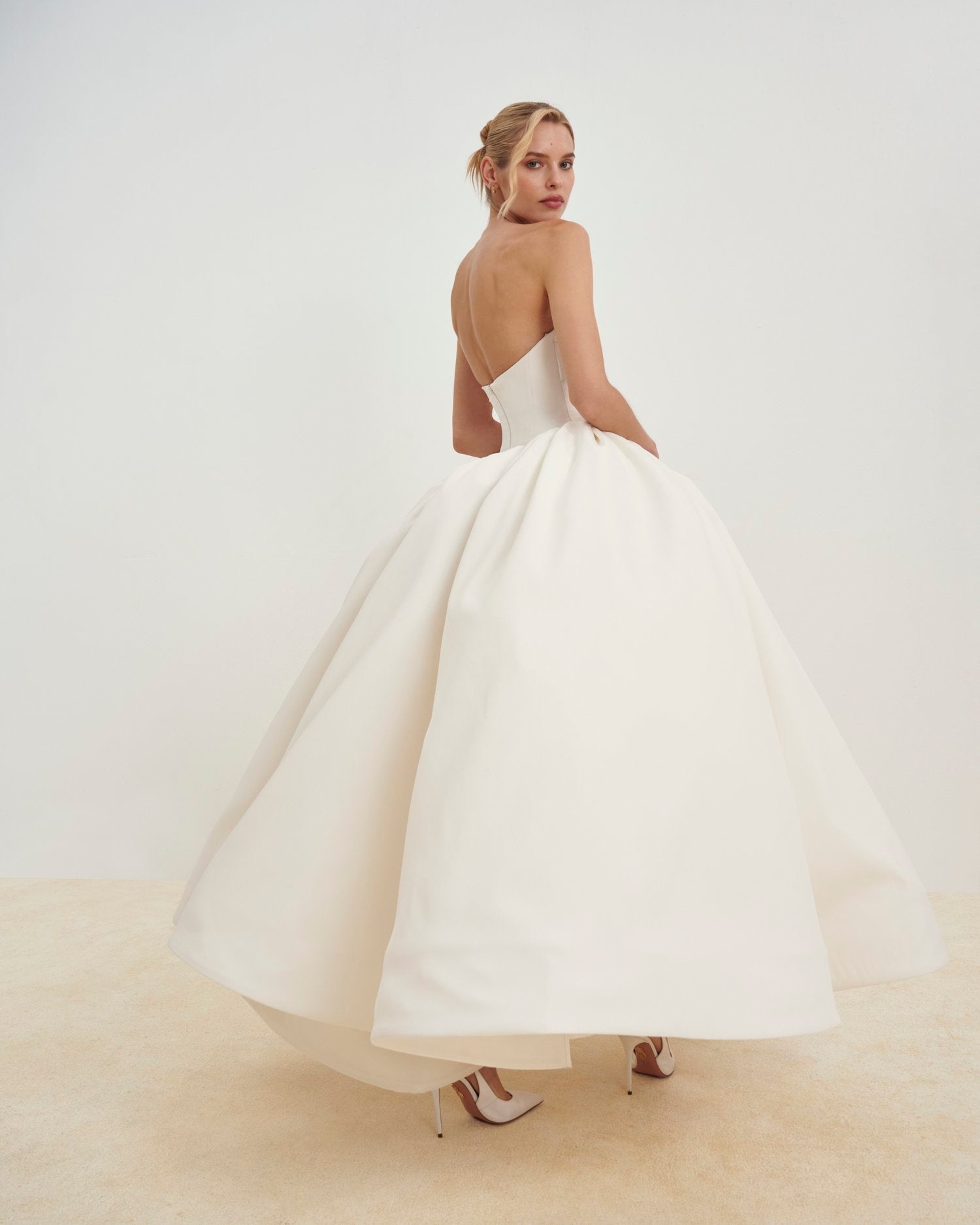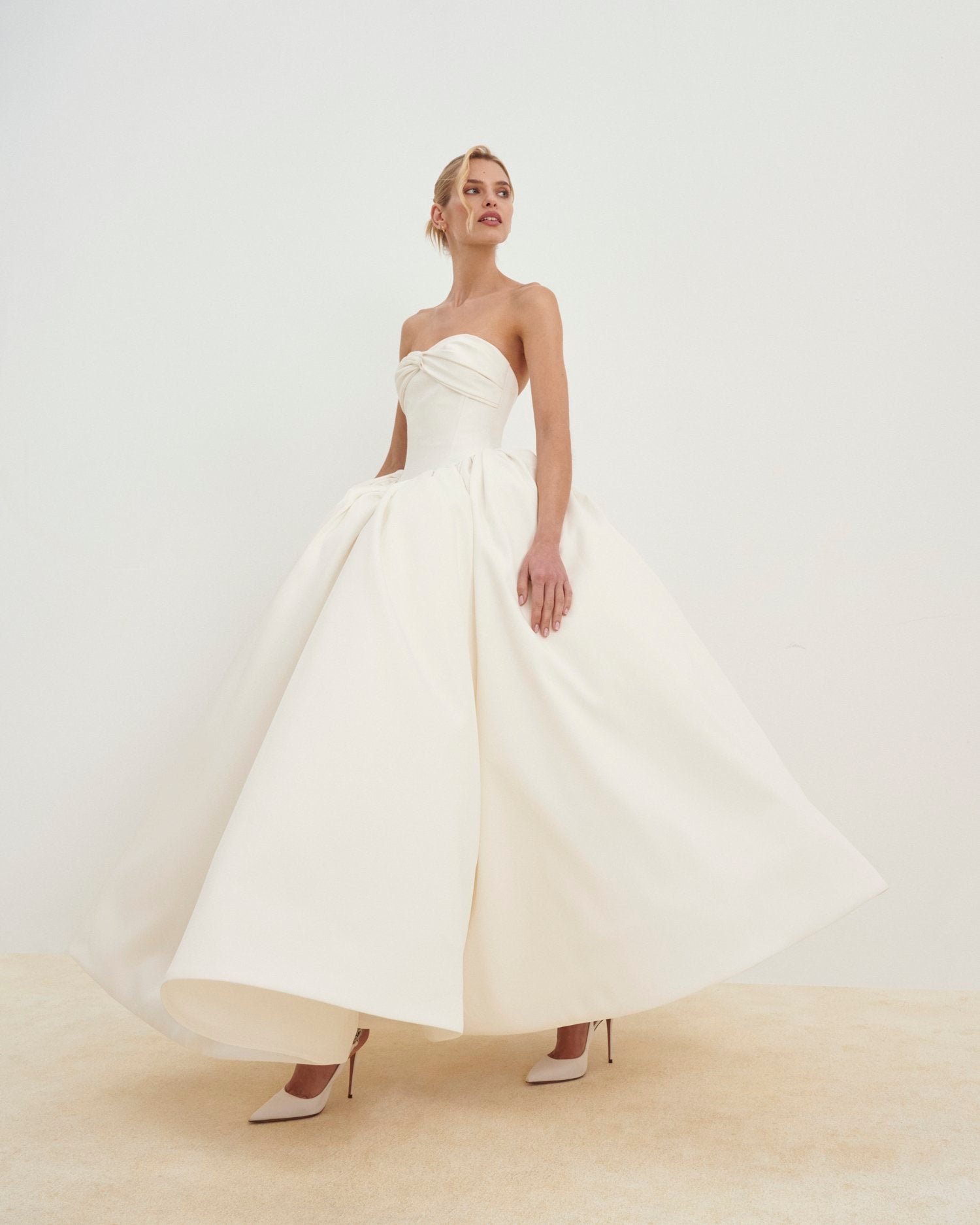 En moderne og legende brudekjole i mat mikado med basque-talje og te-længde skørt. Stropløs overdel med draperet detalje og voluminøst skørt giver et unikt og stilfuldt udtryk.