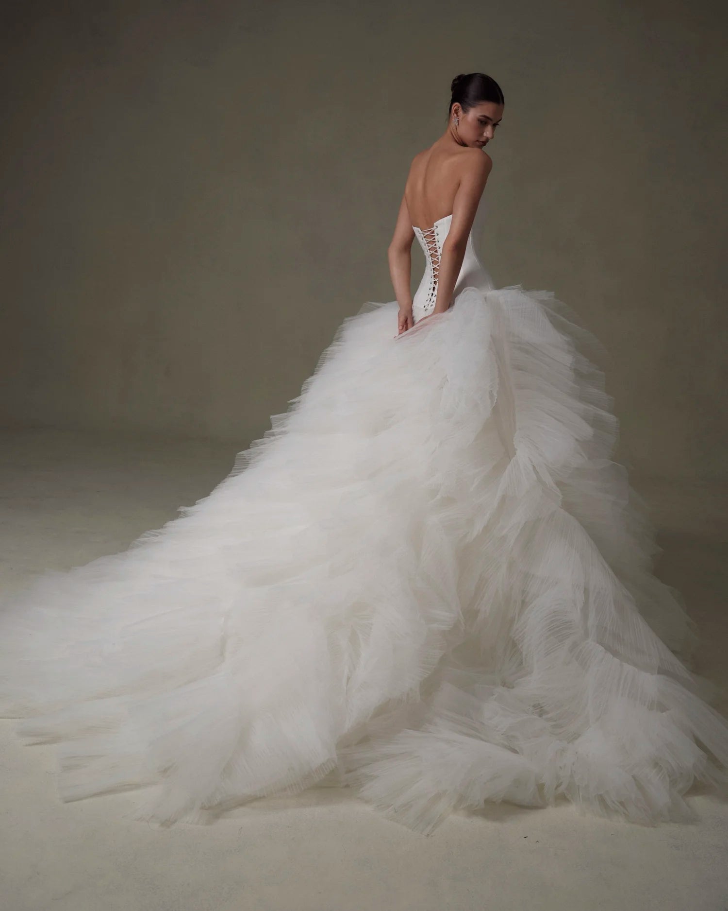Elegant og dramatisk brudekjole med stropløst korsetliv og en voluminøs nederdel i lag på lag af let tyl. Det lange slæb og den smukke korsetlukning skaber et tidløst og majestætisk udtryk – perfekt til bruden, der ønsker klassisk luksus med et moderne touch.