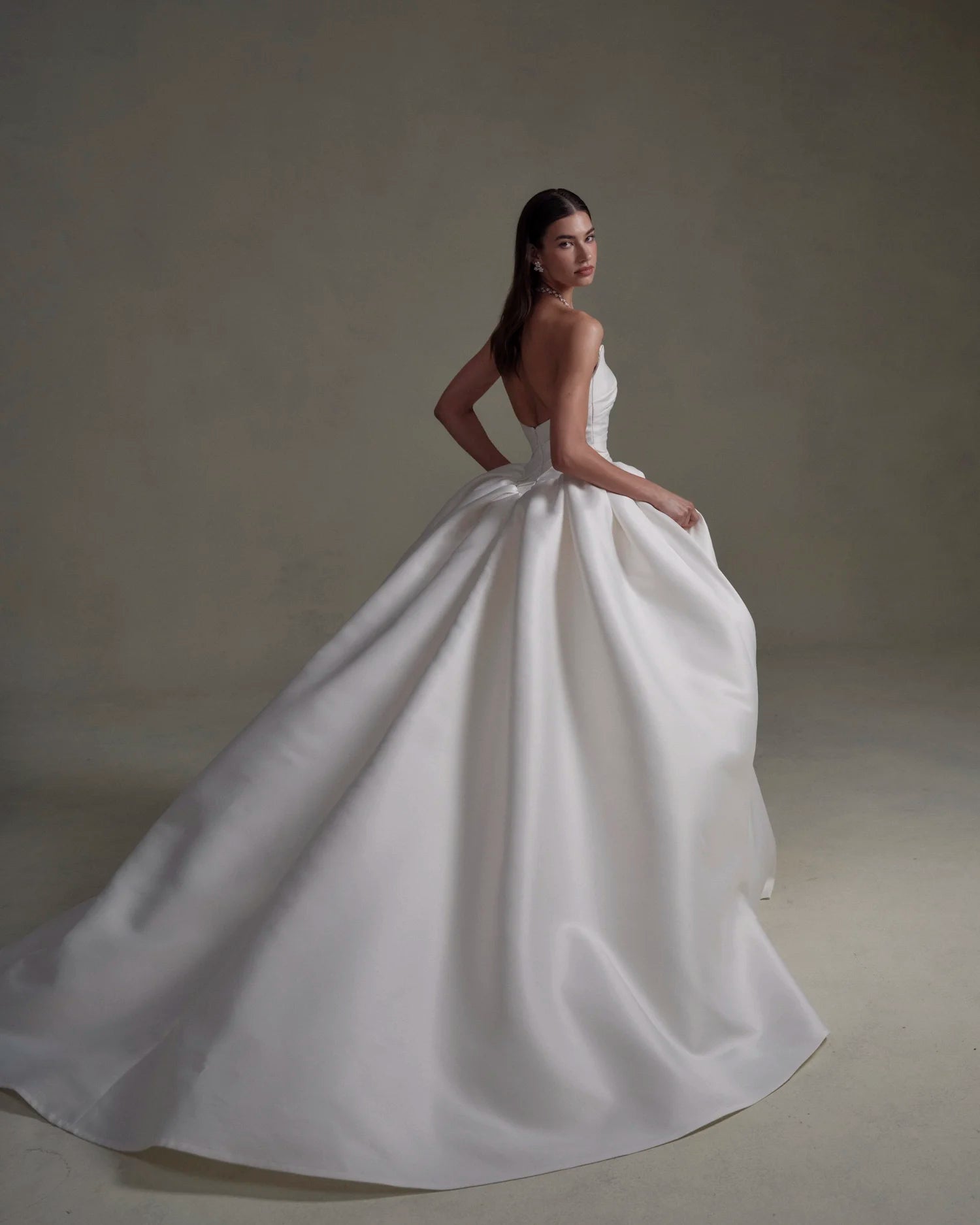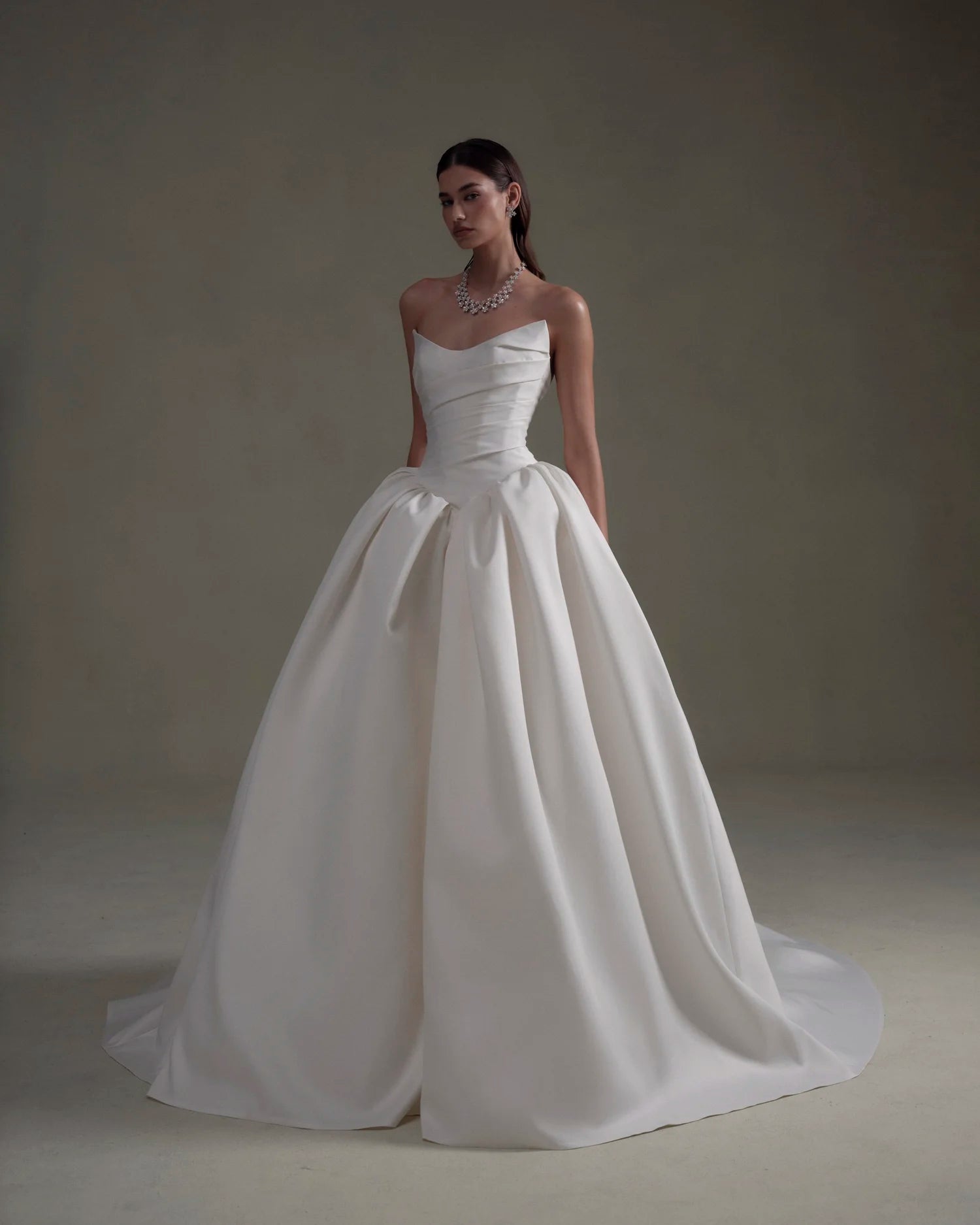 Denne klassiske brudekjole forener enkelhed og luksus i ét. Det stropløse, draperede korsetliv smyger sig elegant om kroppen, mens den fulde underdel falder i tunge, eksklusive folder og skaber et majestætisk udtryk. Perfekt til bruden, der ønsker et stilrent og sofistikeret look, som aldrig går af mode.