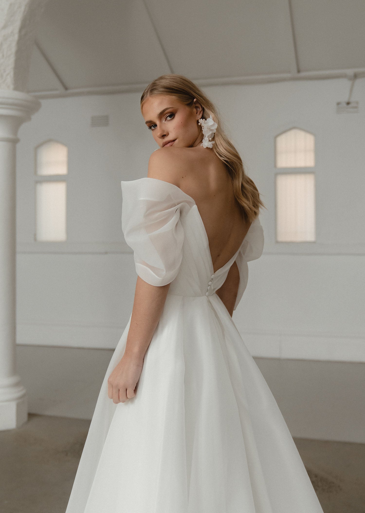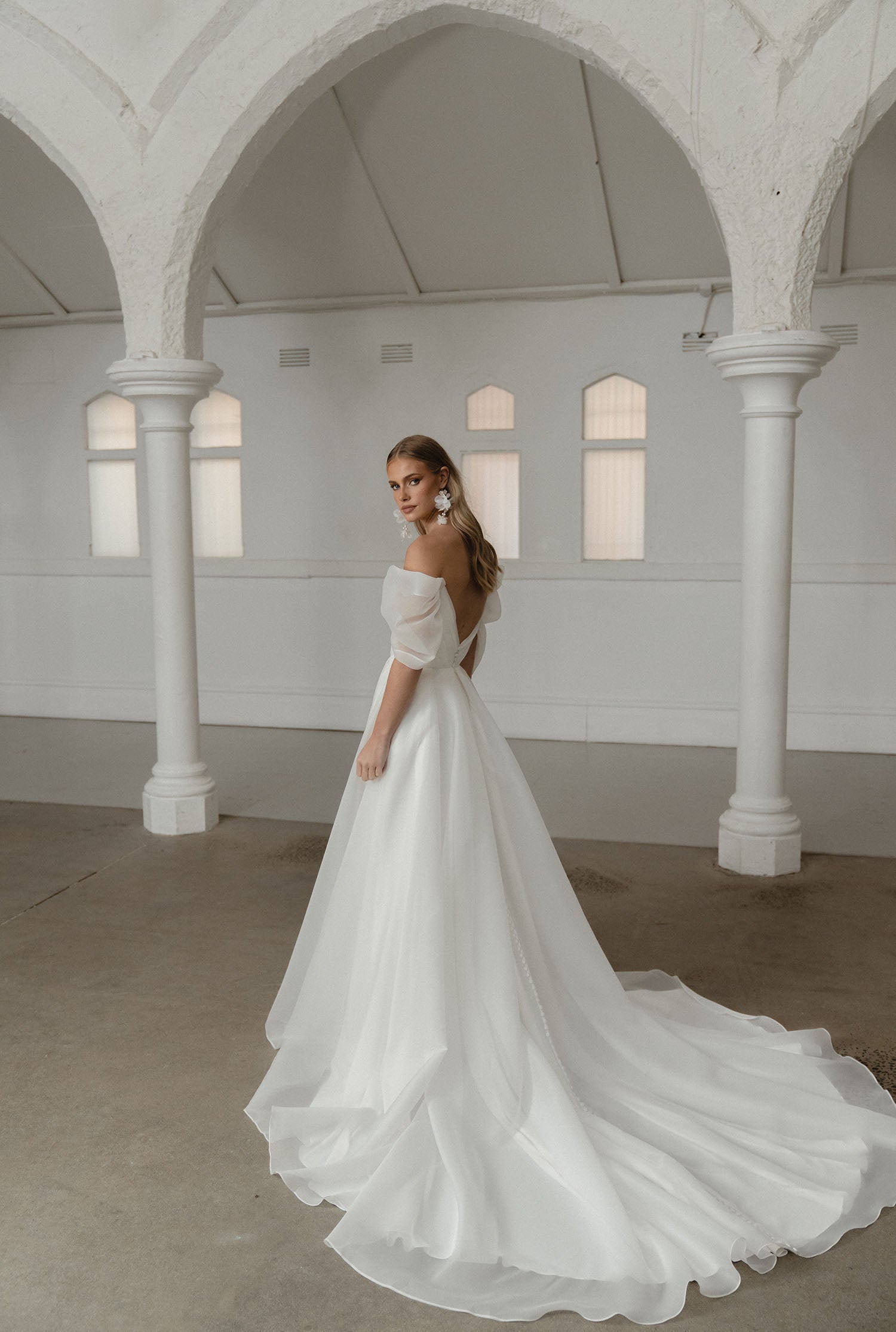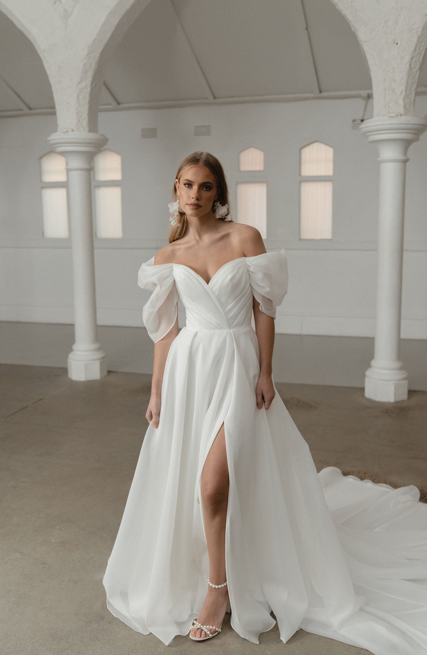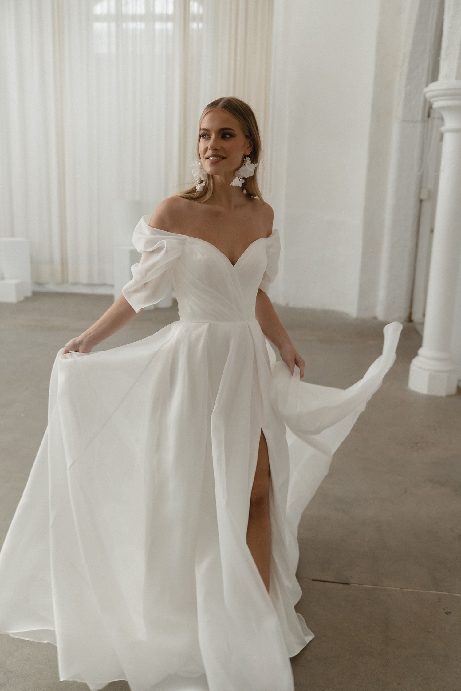 Smuk og klassisk brudekjole. Vi elsker slidsen og "hænge ærmerne som giver den enkelte kjole lidt ekstra kant. Kjolen kan bestilles uden slids.