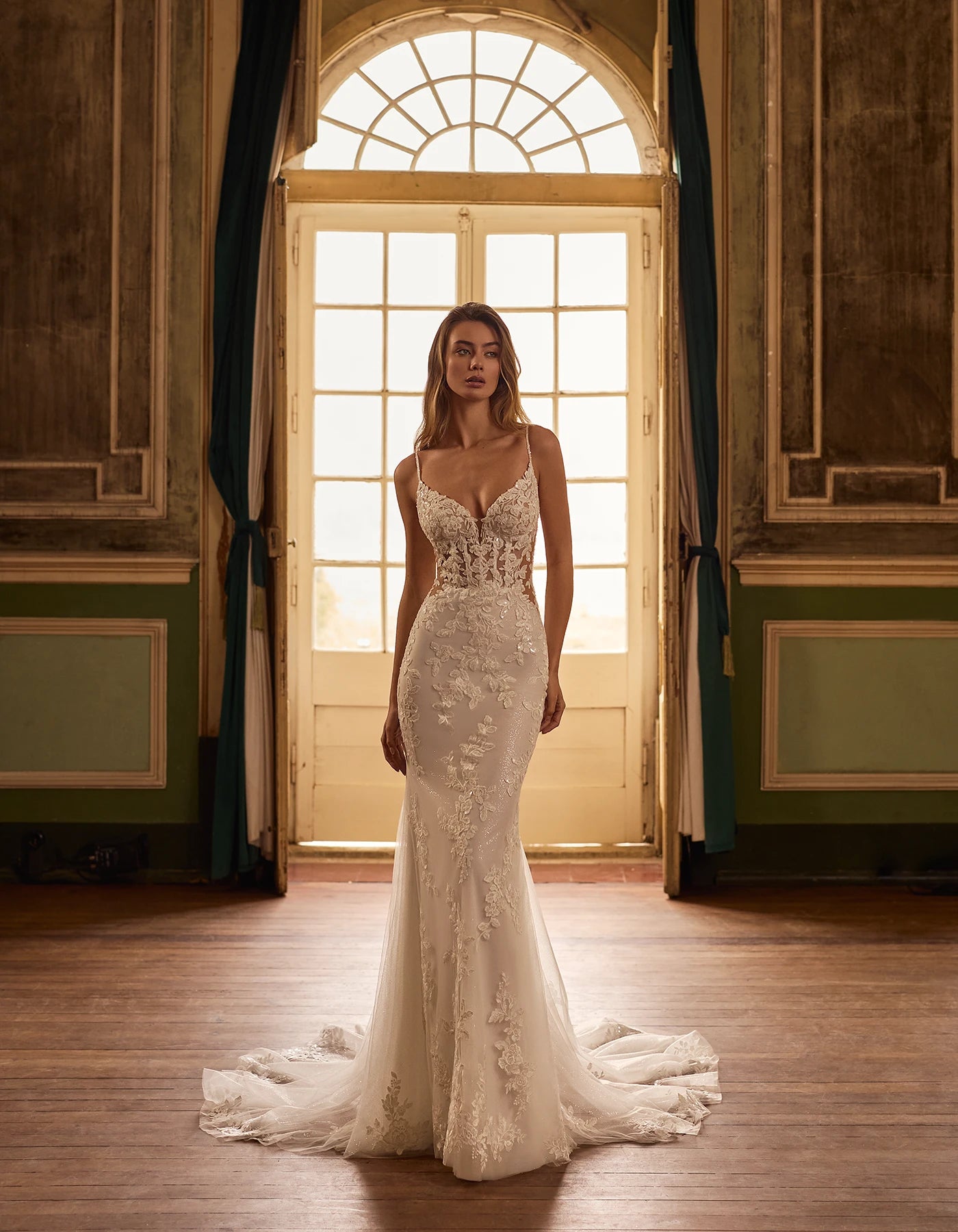 En sensuel og elegant brudekjole i havfruesnit med delikat blonde og gennembrudte detaljer. Kjolen har tynde stropper, en dyb udskæring og en lav ryg, der fremhæver silhuetten. Det transparente slæb med blomsterapplikationer giver et romantisk og luksuriøst udtryk.