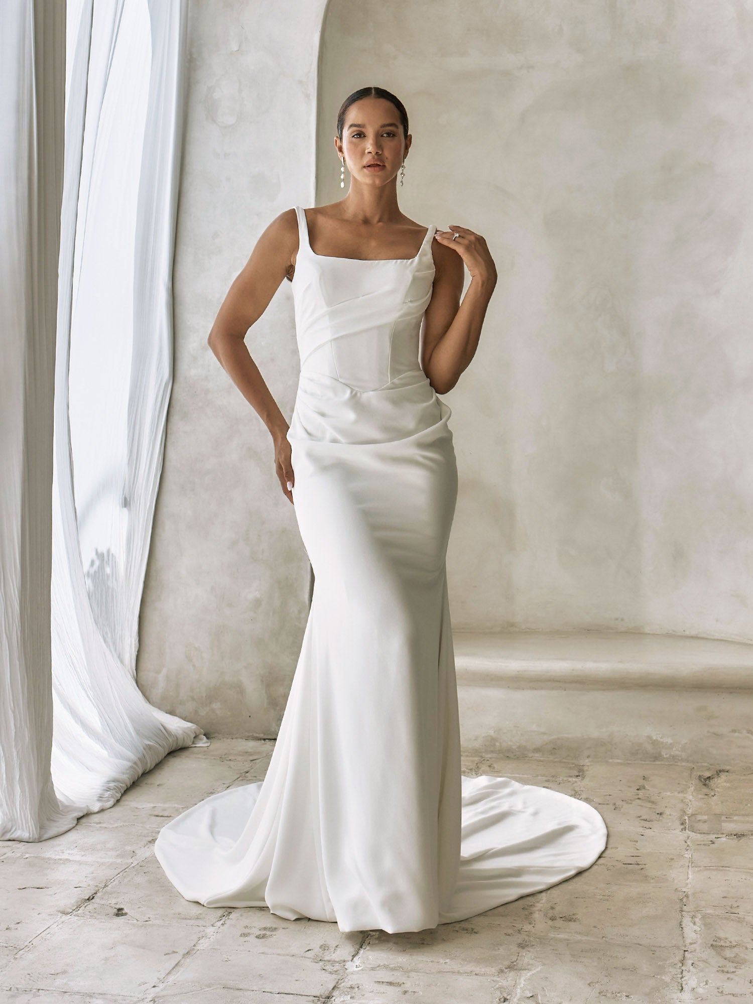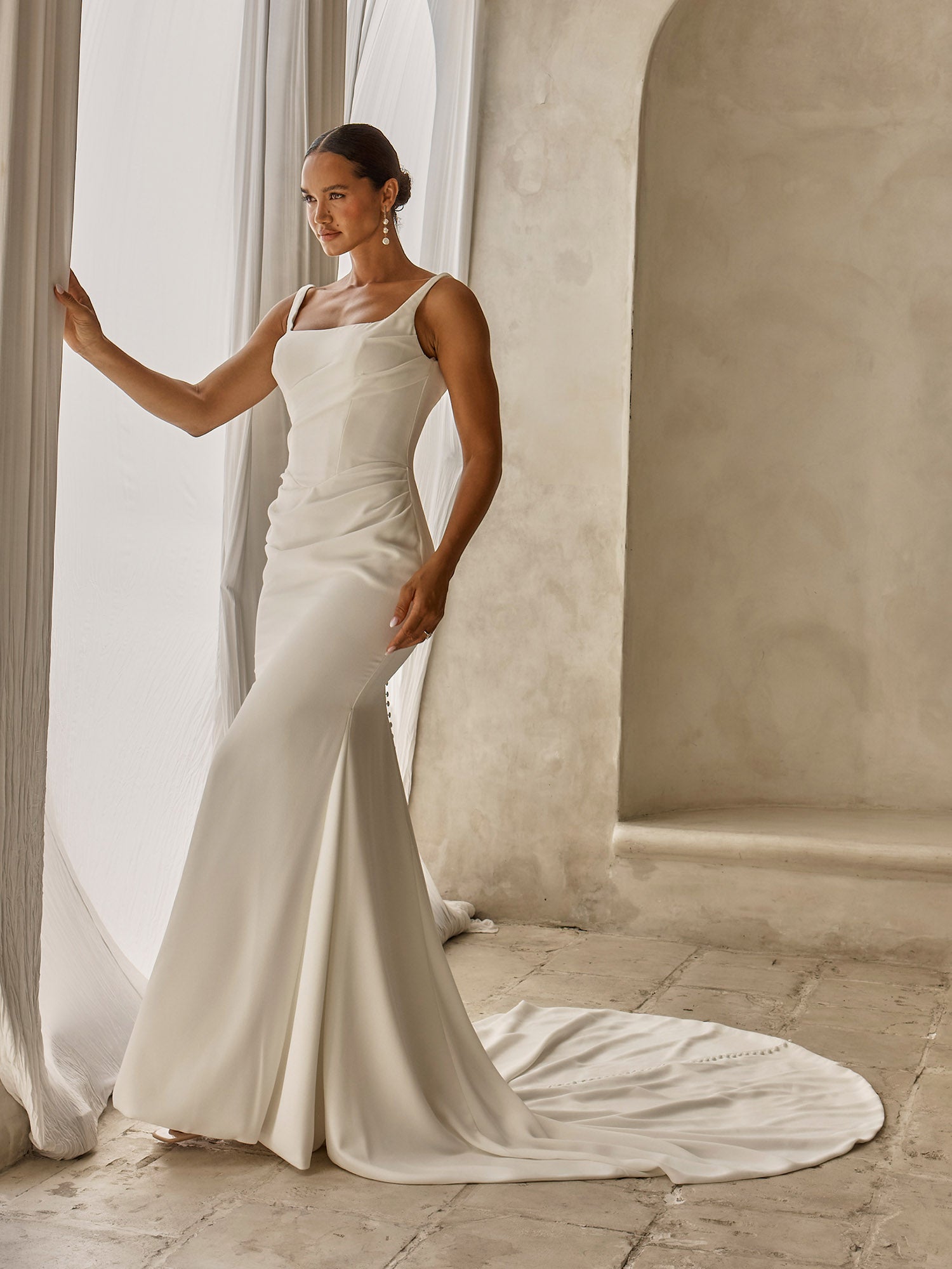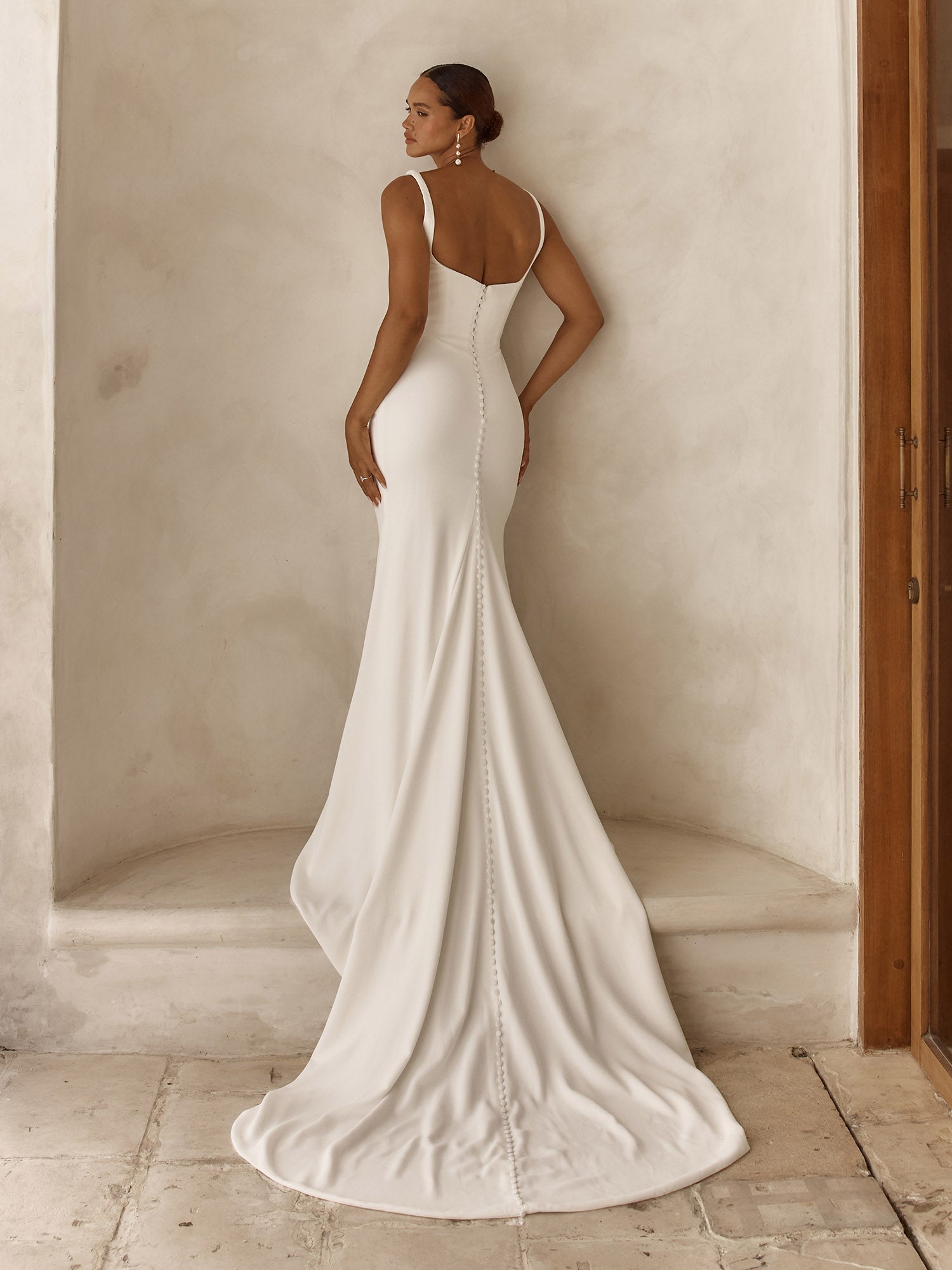 Denne kjole har en moderne, kropsnær silhuet med et smukt, glat fald og et langt slæb. Overdelen skiller sig ud med en firkantet udskæring, tynde stropper og elegant drapering over et struktureret korset. Som en klassisk detalje løber en lang række knapper hele vejen ned langs ryggen og helt ud til spidsen af slæbet.