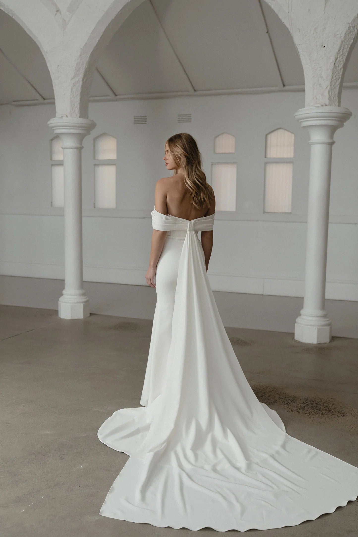 Wauw... Vi elsker alt ved denne klassiske brudekjole fra Madilane. Kjolen har den smukkeste off shoulder udskæring og et aftageligt slæb. Til dig som gerne vil have en enkelt kjole med kant.