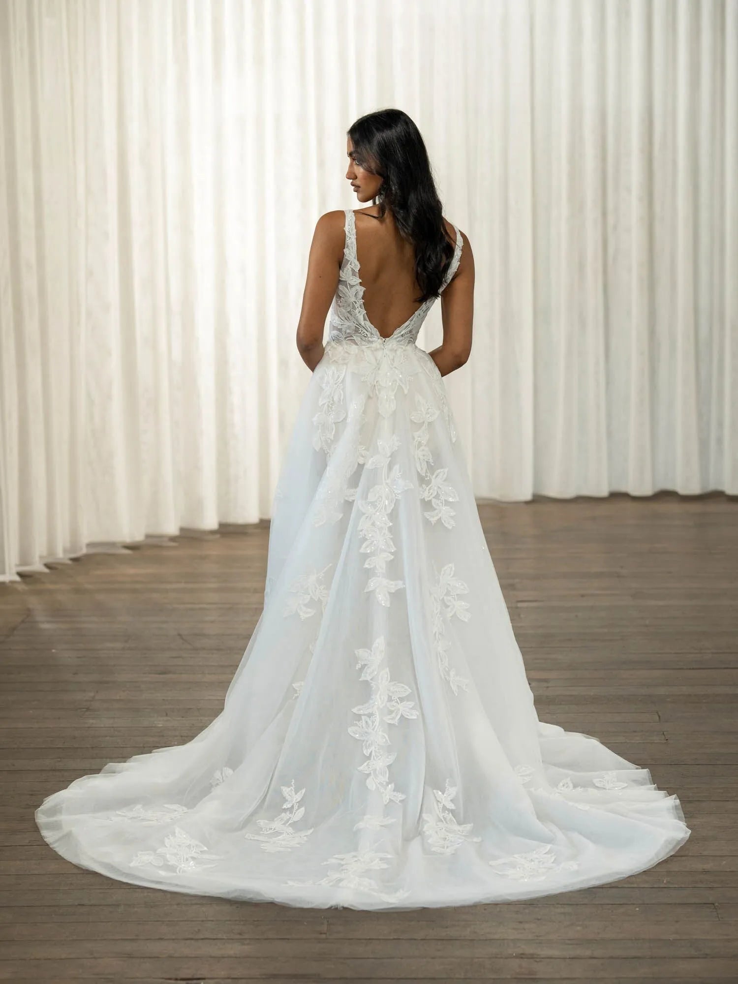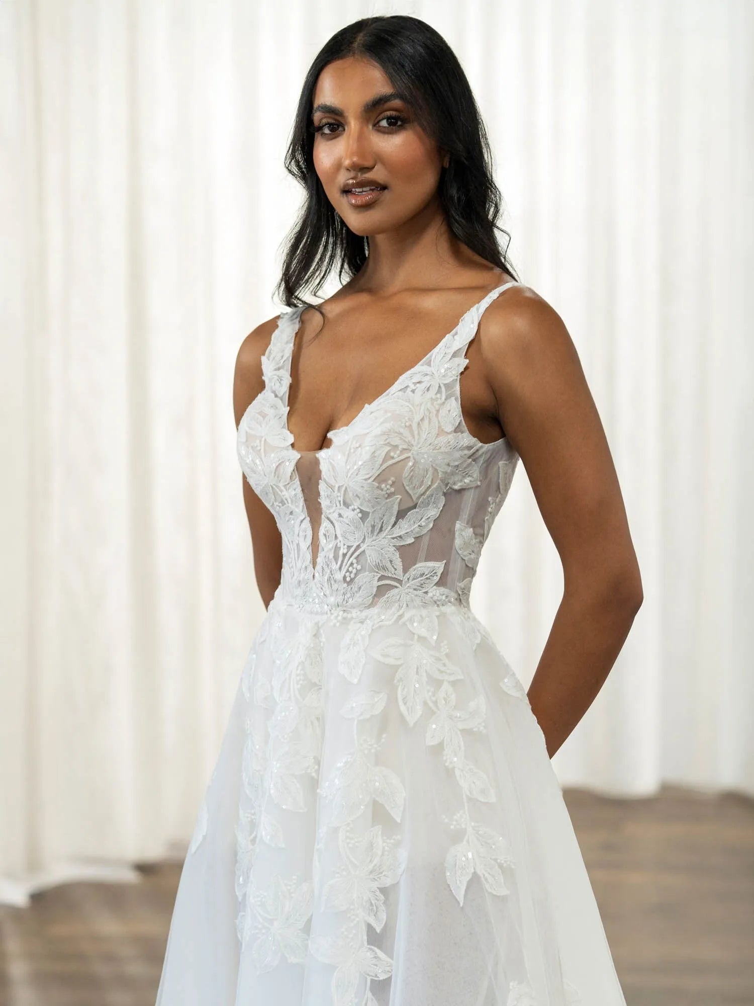 Denne smukke brudekjole er indbegrebet af romantisk elegance. Med sin dybe V-udskæring og detaljerede blonder, der pryder hele kjolen, skaber den et fortryllende look. Den lette, flydende nederdel giver et eventyrligt præg, mens den subtile slæb tilføjer en ekstra dimension af skønhed.