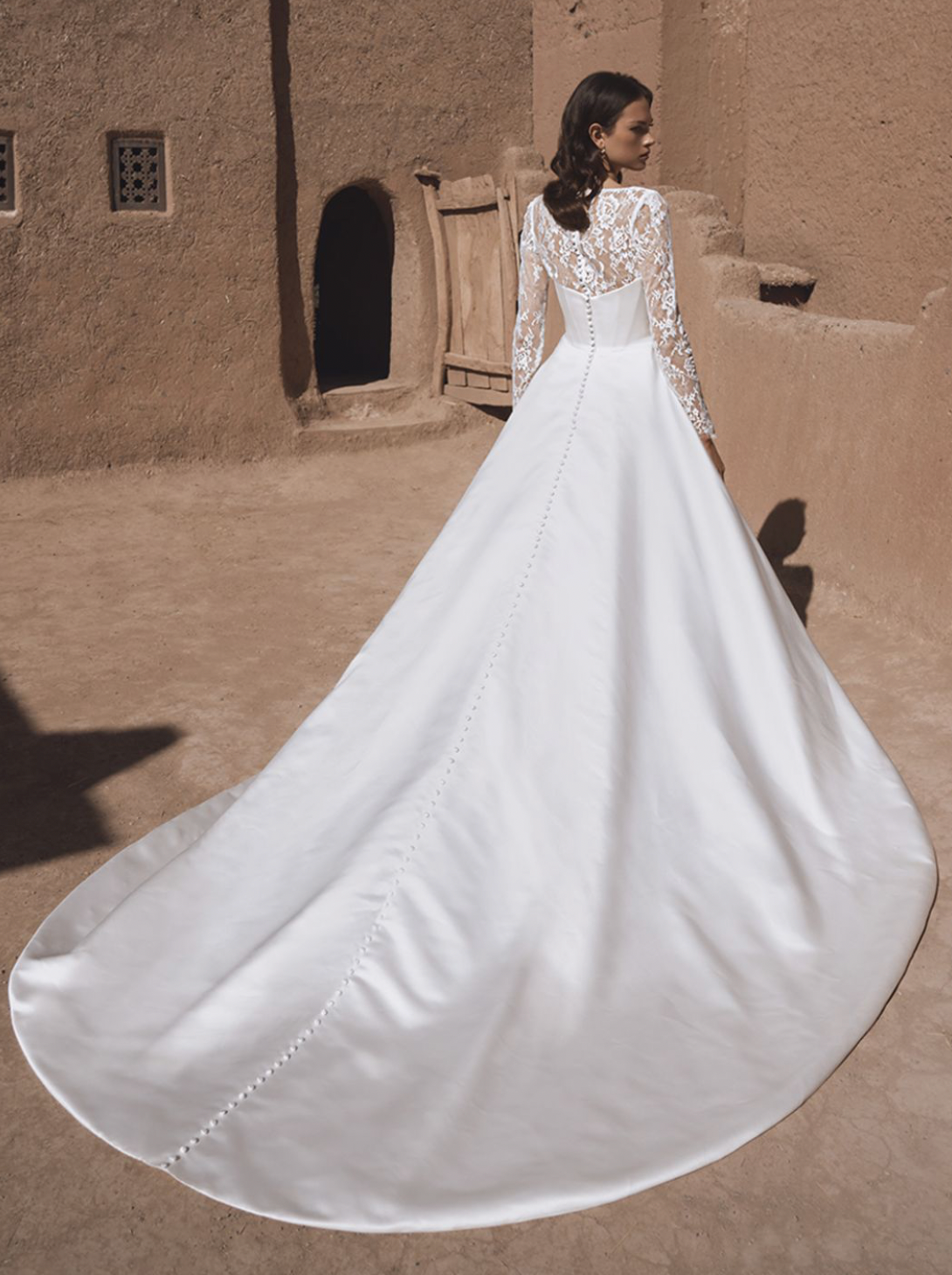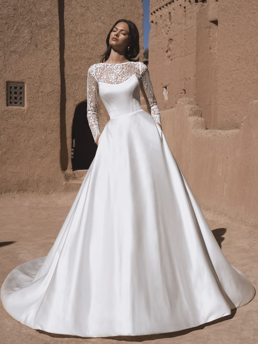 Elegant brudekjolemed moderne snit og diskrete lommer. Kjolen har en smuk stropløs udskæring og fås både med og uden den fine blondejakke med lange ærmer, som kan bæres under kjolen og nemt tages af for et mere enkelt look.