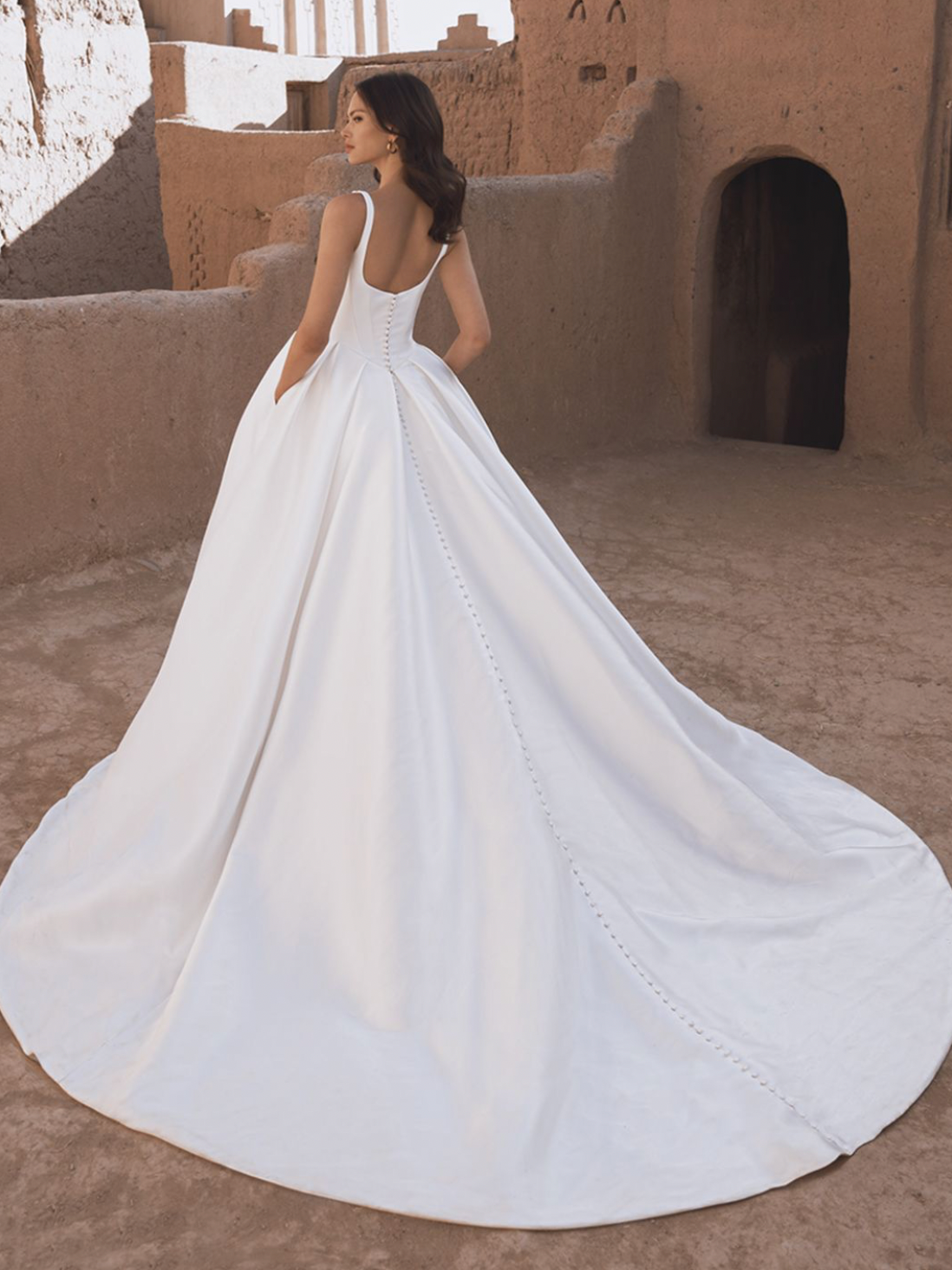 Elegant brudekjole i klassisk A-line med firkantet udskæring og brede stropper. Den tætsiddende overdel fremhæver taljen, mens det fyldige skørt med knapdetaljer og slæb giver et romantisk og tidløst udtryk.