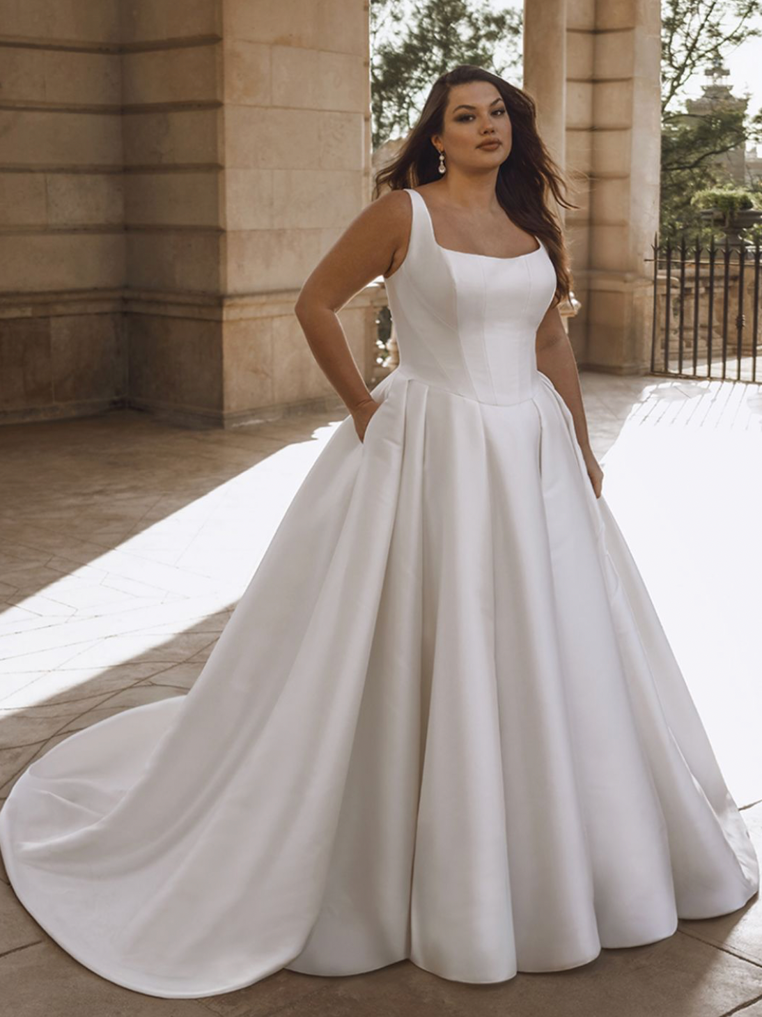 Klassisk brudekjole i A-line med firkantet udskæring, brede stropper og et fyldigt skørt med slæb. Kjolen har en elegant og struktureret overdel samt knapper langs ryggen, der tilføjer et tidløst og majestætisk udtryk.