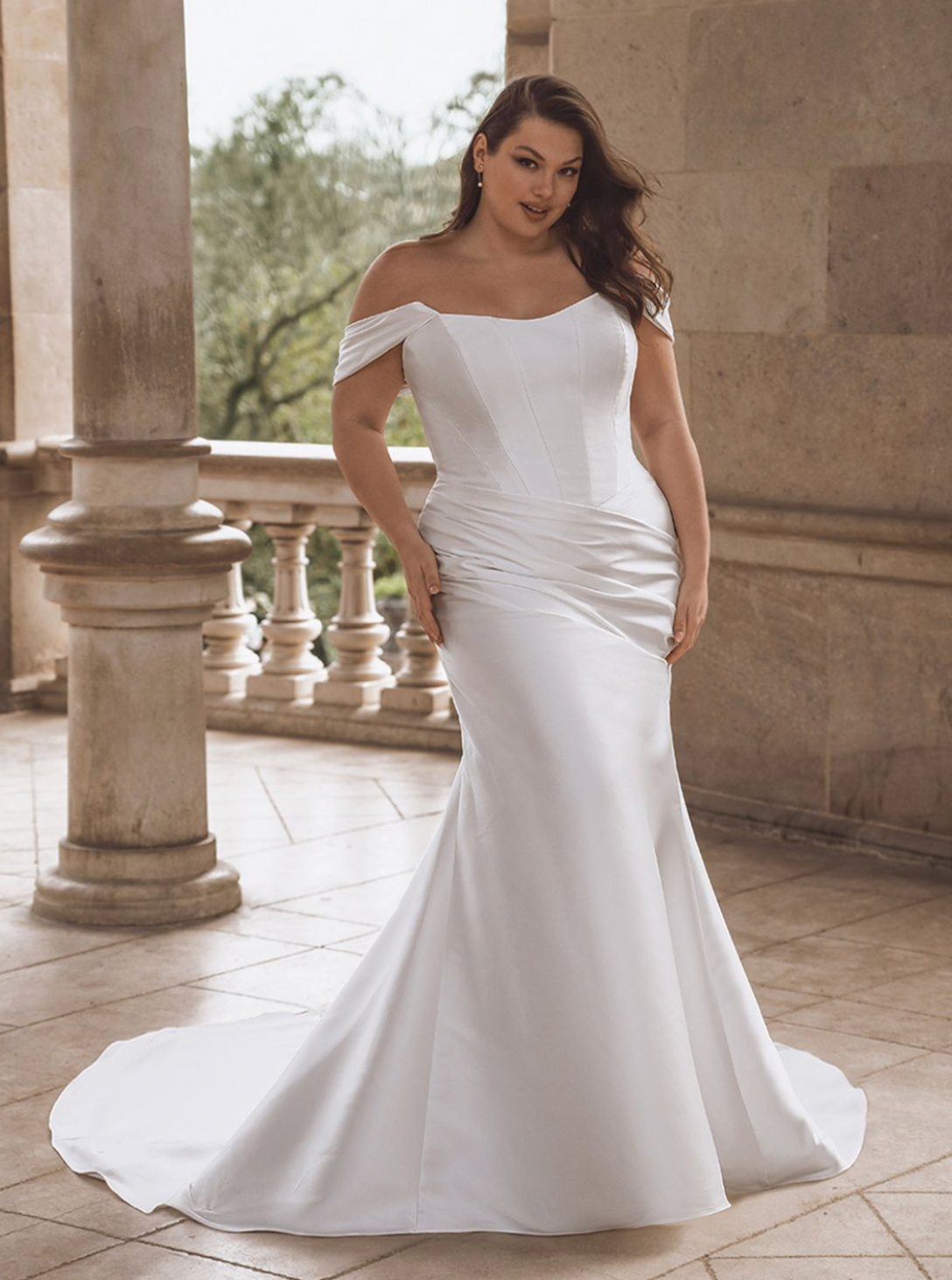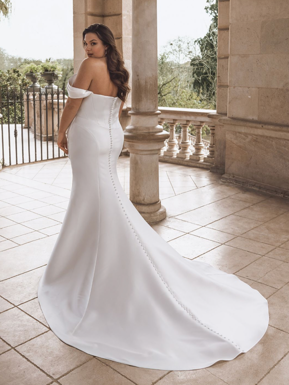 Elegant og tidløs brudekjole med off-shoulder ærmer, figursyet pasform og flatterende draperinger ved hofterne. Kjolen afsluttes med knapper langs ryggen og et let slæb, der giver et klassisk og sofistikeret udtryk.