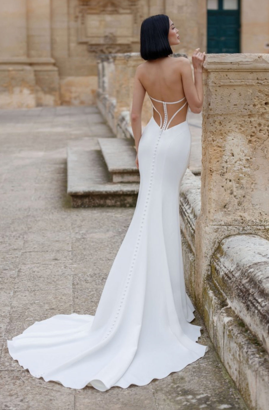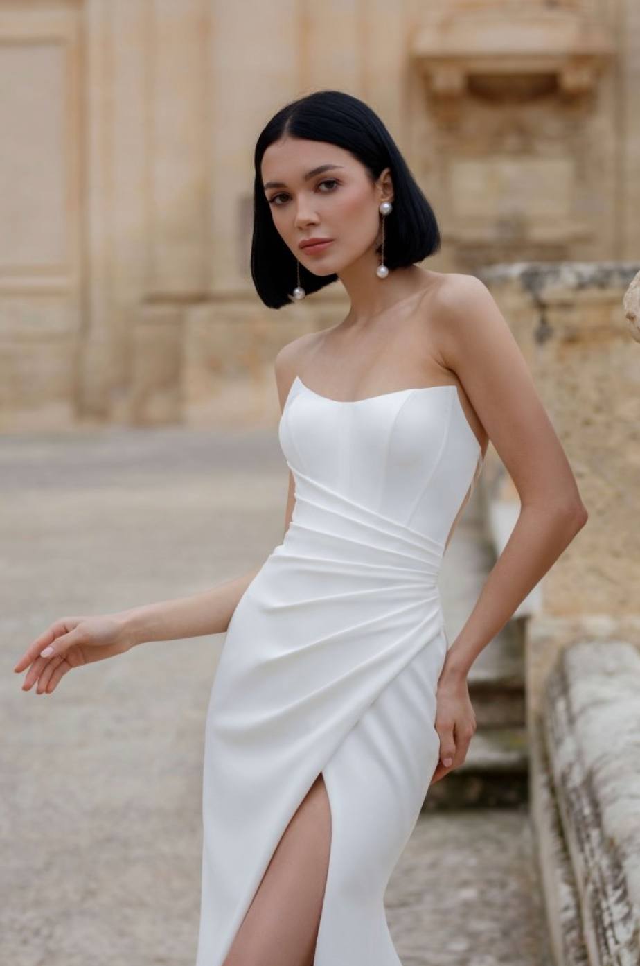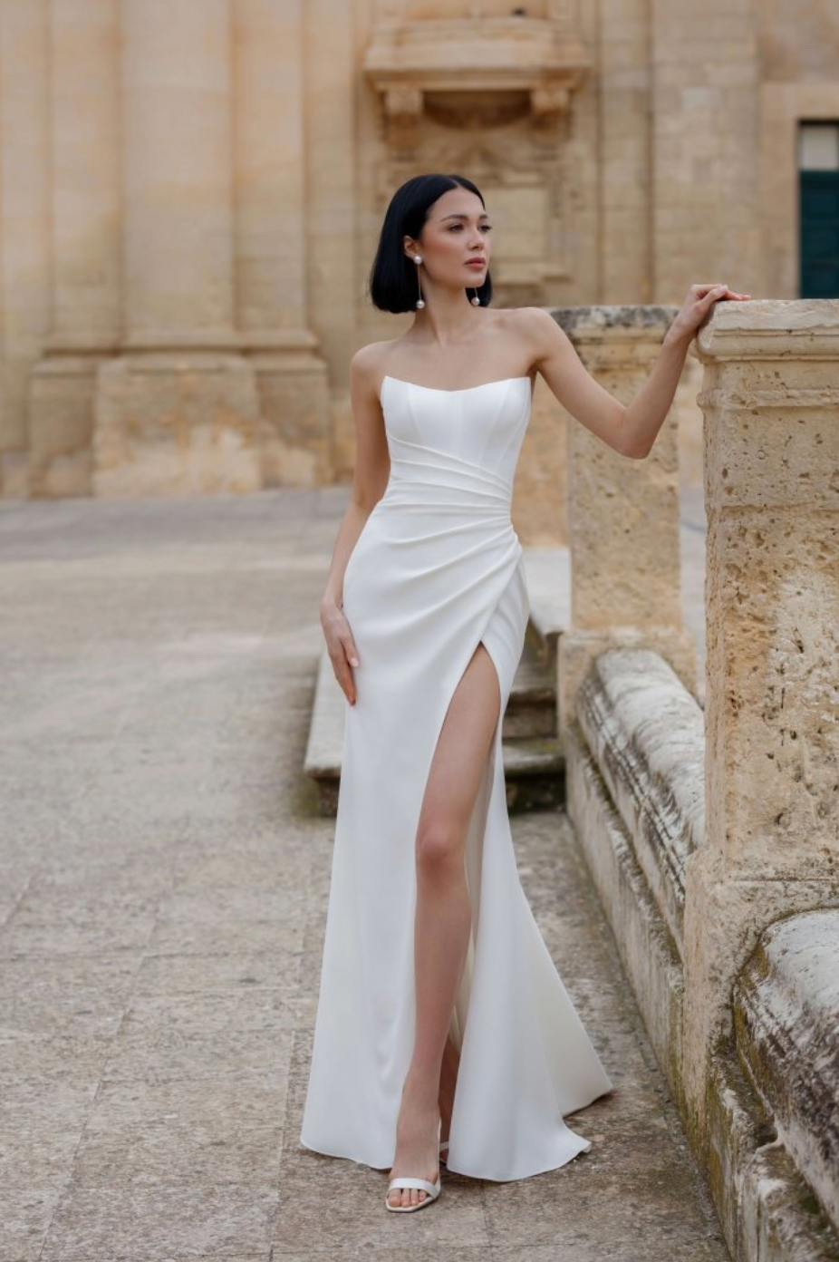Denne elegante kjole er både moderne og sofistikeret med sin enkle, men smukke silhuet. Den er designet med en stropløs overdel, der fremhæver skuldrene og halsen på en yndefuld måde. Kjolens talje er draperet og giver en flatterende figur, mens den høje slids tilføjer et strejf af drama.