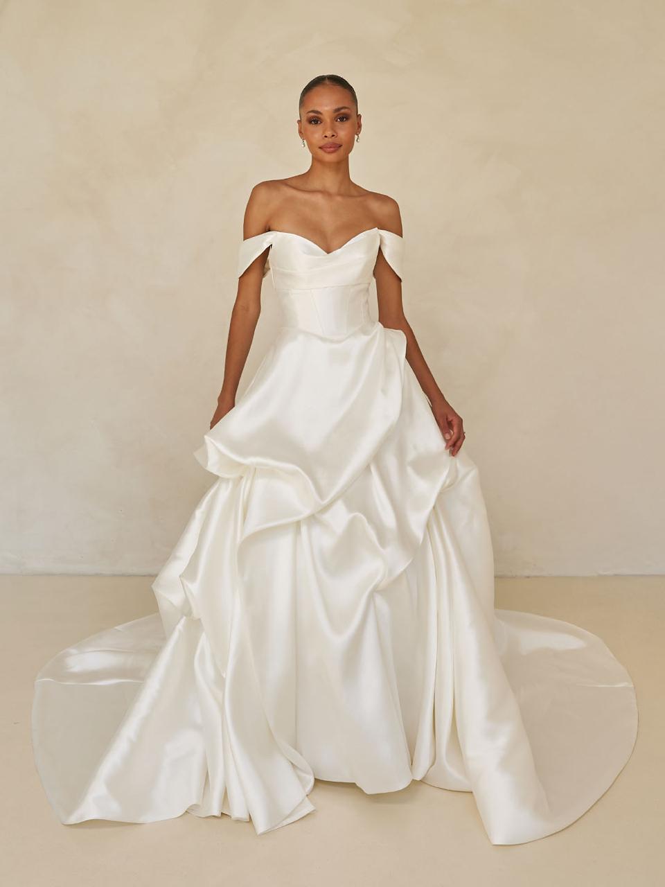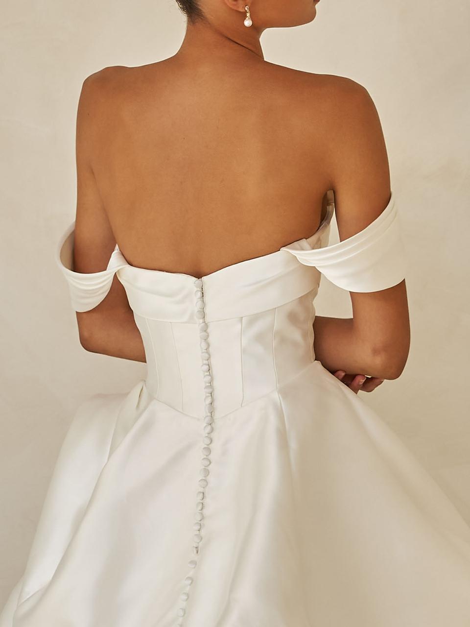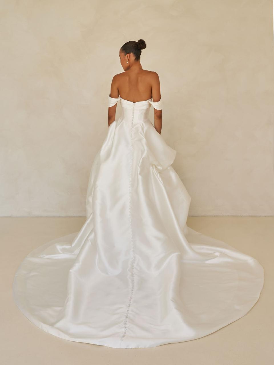 Dramatisk og luksuriøs brudekjole i glansfuldt satin med off-shoulder design og sweetheart-udskæring. Den har et skulpturelt, draperet skørt og et langt slæb med knapdetaljer bagpå.