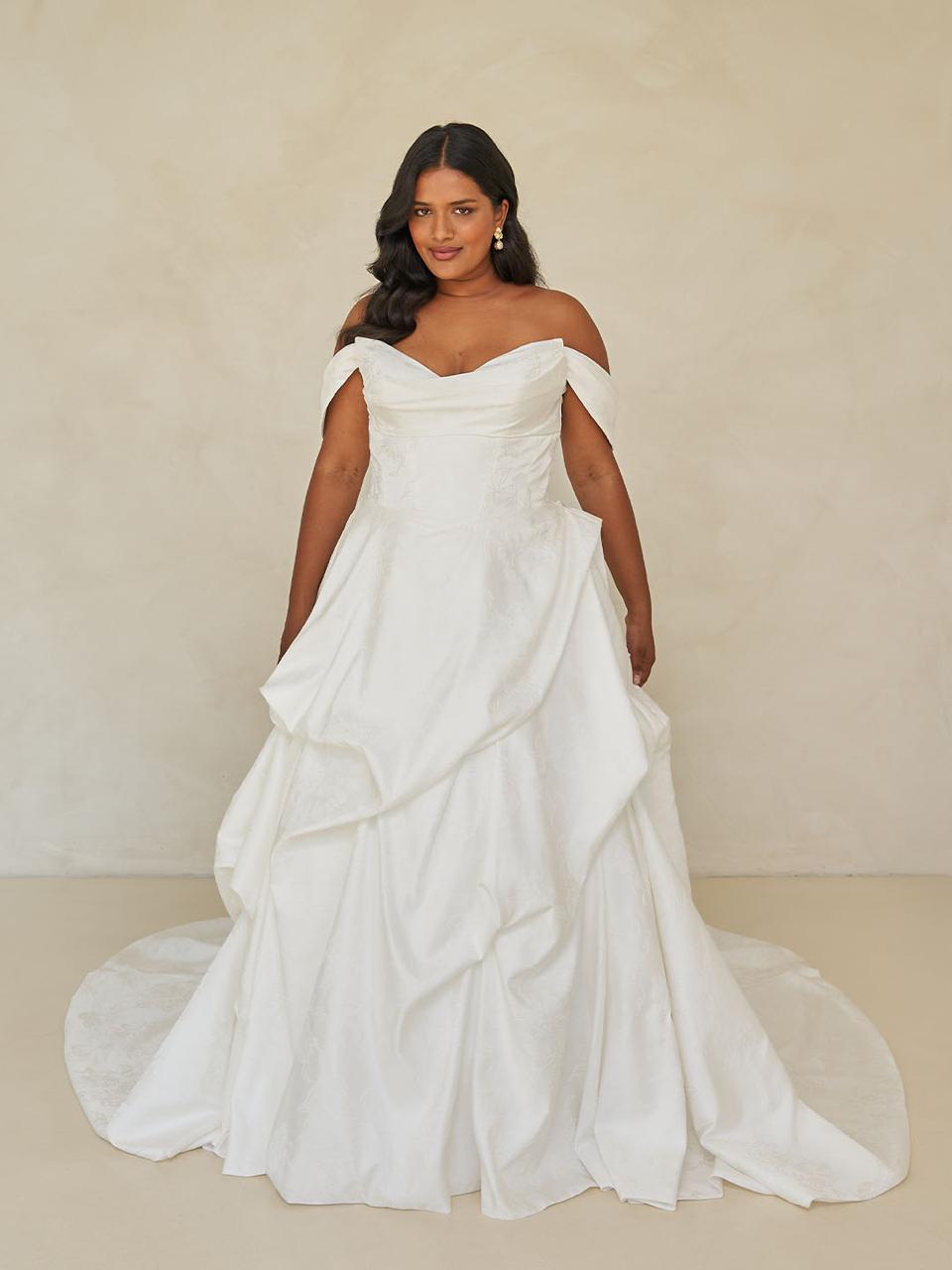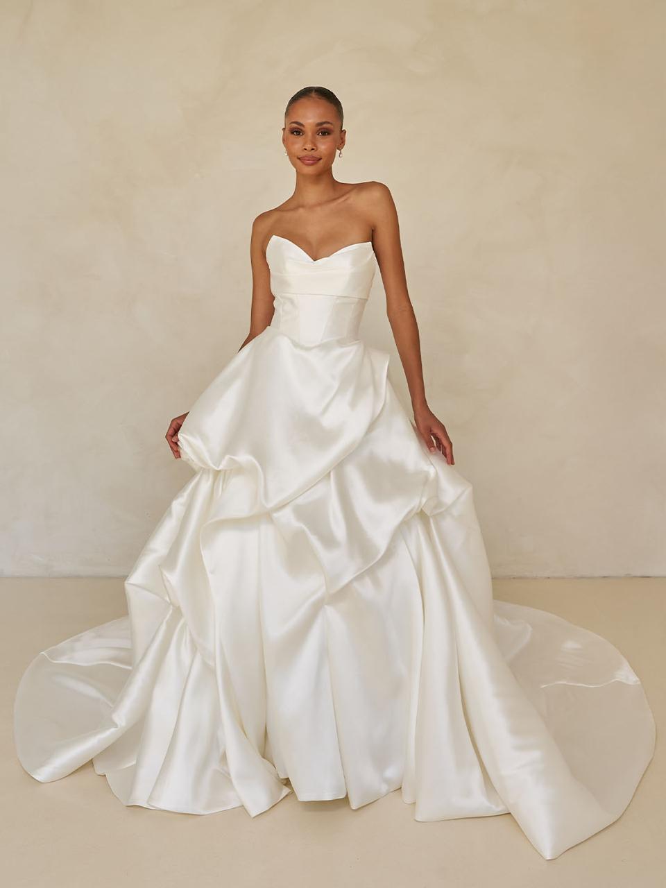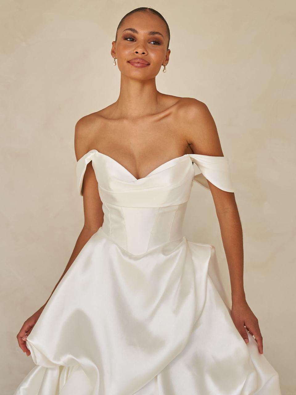Dramatisk og luksuriøs brudekjole i glansfuldt satin med off-shoulder design og sweetheart-udskæring. Den har et skulpturelt, draperet skørt og et langt slæb med knapdetaljer bagpå.