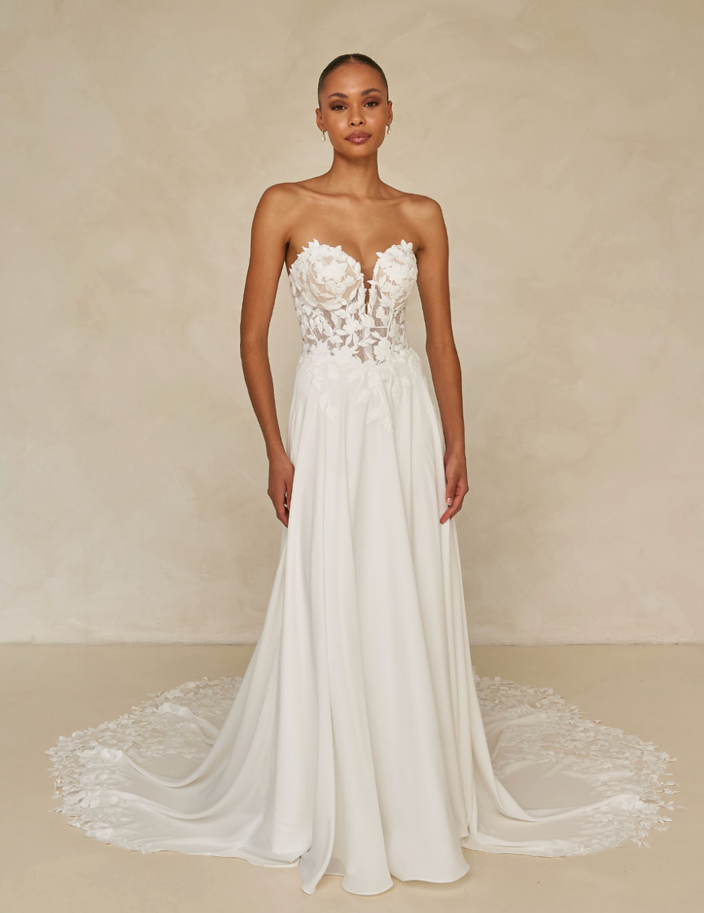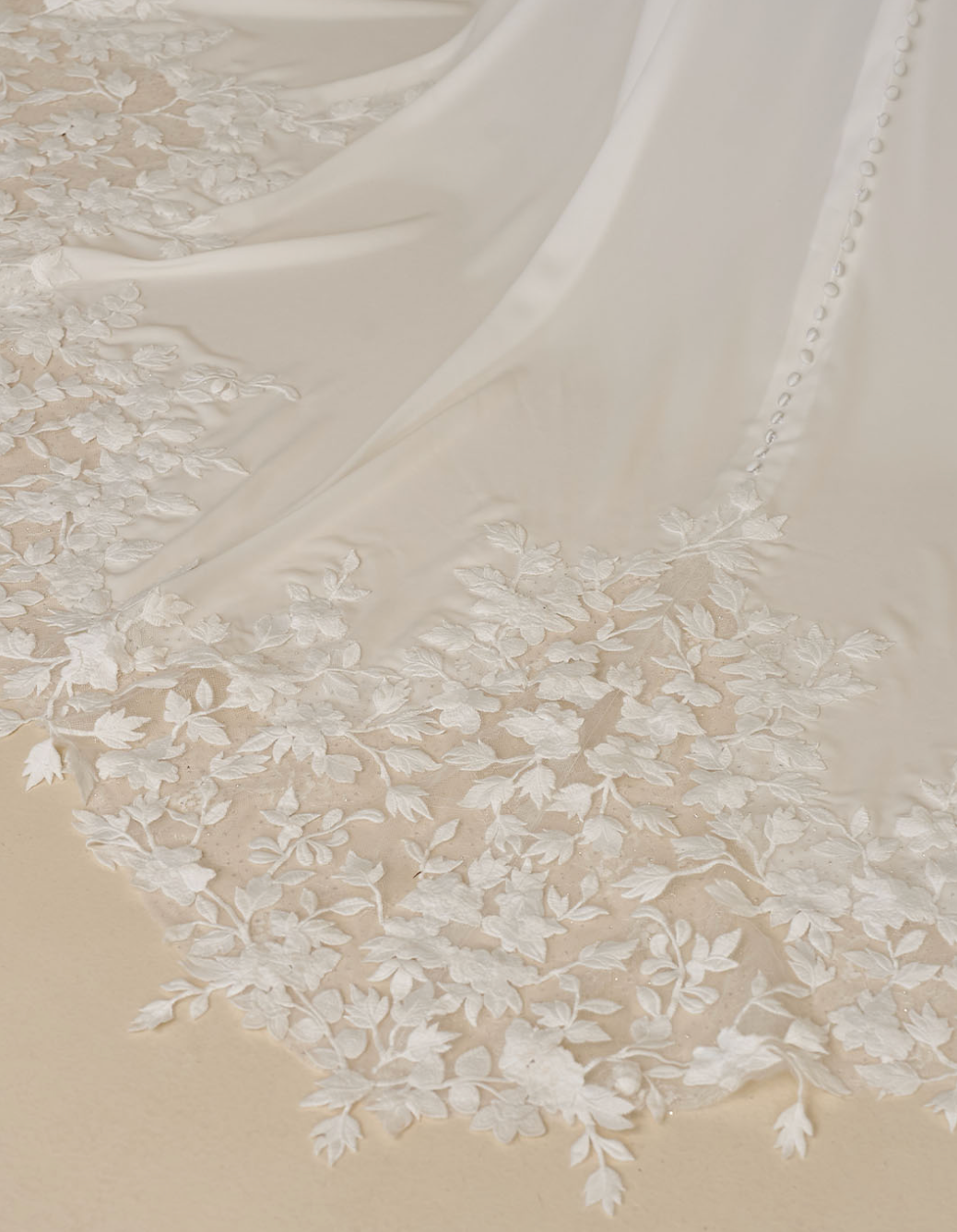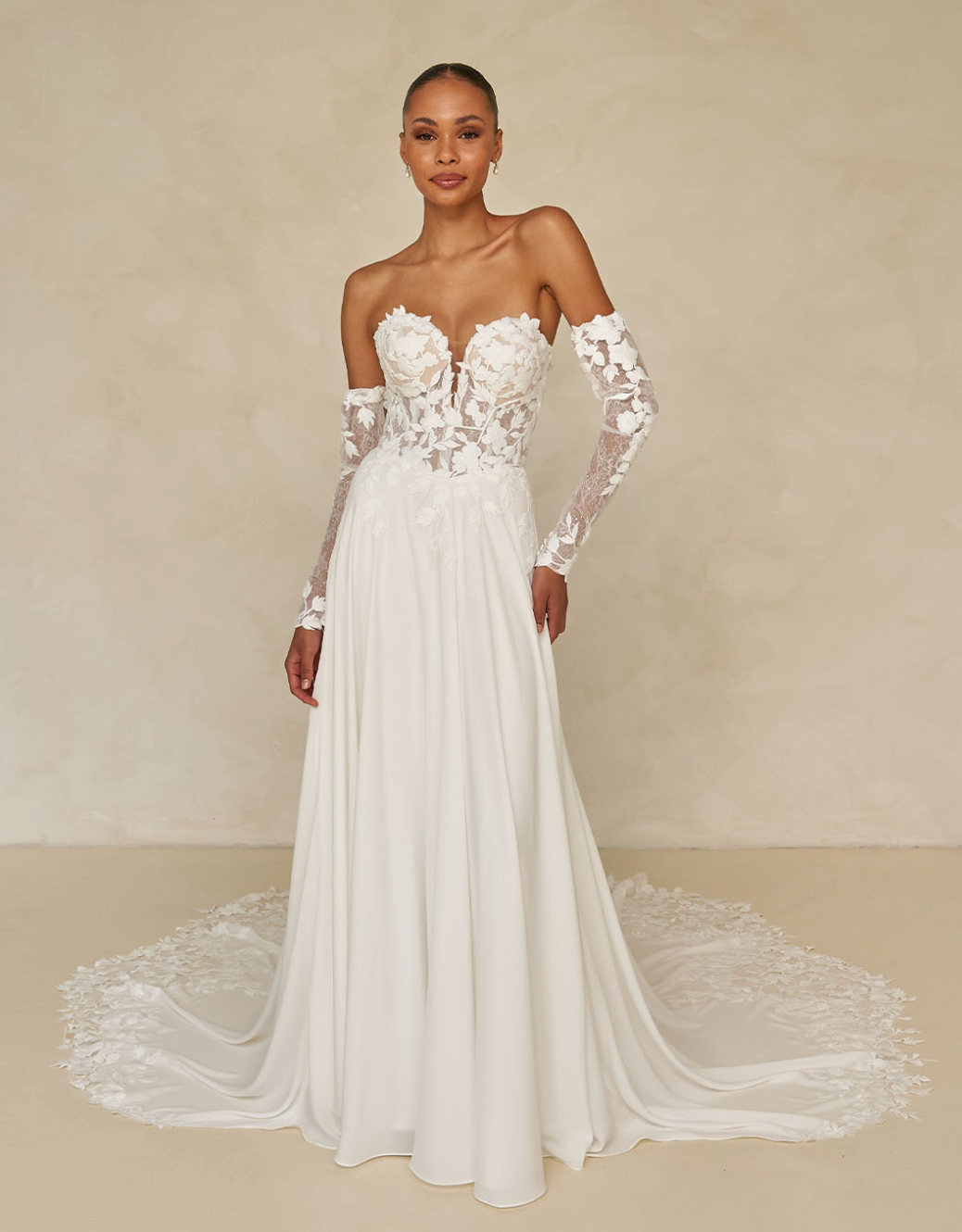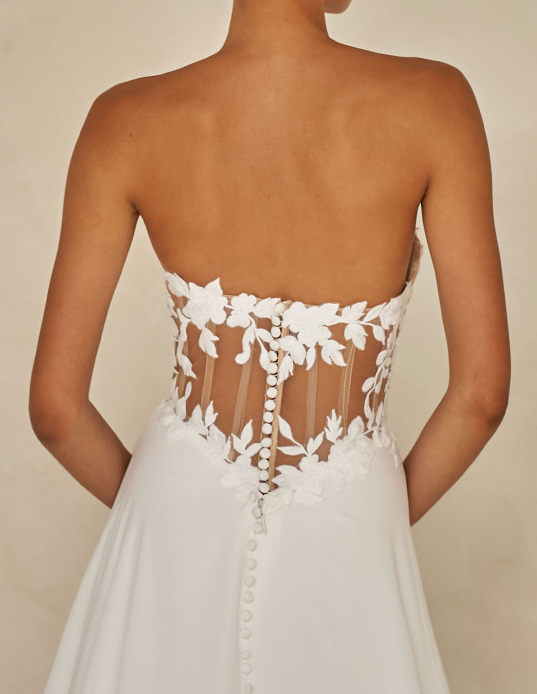 Romantisk og moderne brudekjole med smuk korsetlignende top i gennemsigtig blonde dekoreret med blomsterapplikationer. Kjolen har aftagelige ærmer, en flatterende A-line underdel i blød chiffon og et fortryllende slæb med fine blonde-detaljer.