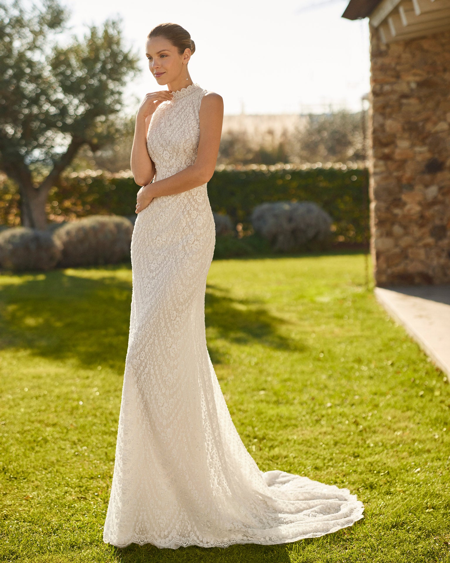 En elegant og sofistikeret havfruekjole i blonder med høj hals og åbning i ryggen. Kjolen er tætsiddende og fremhæver figuren smukt.